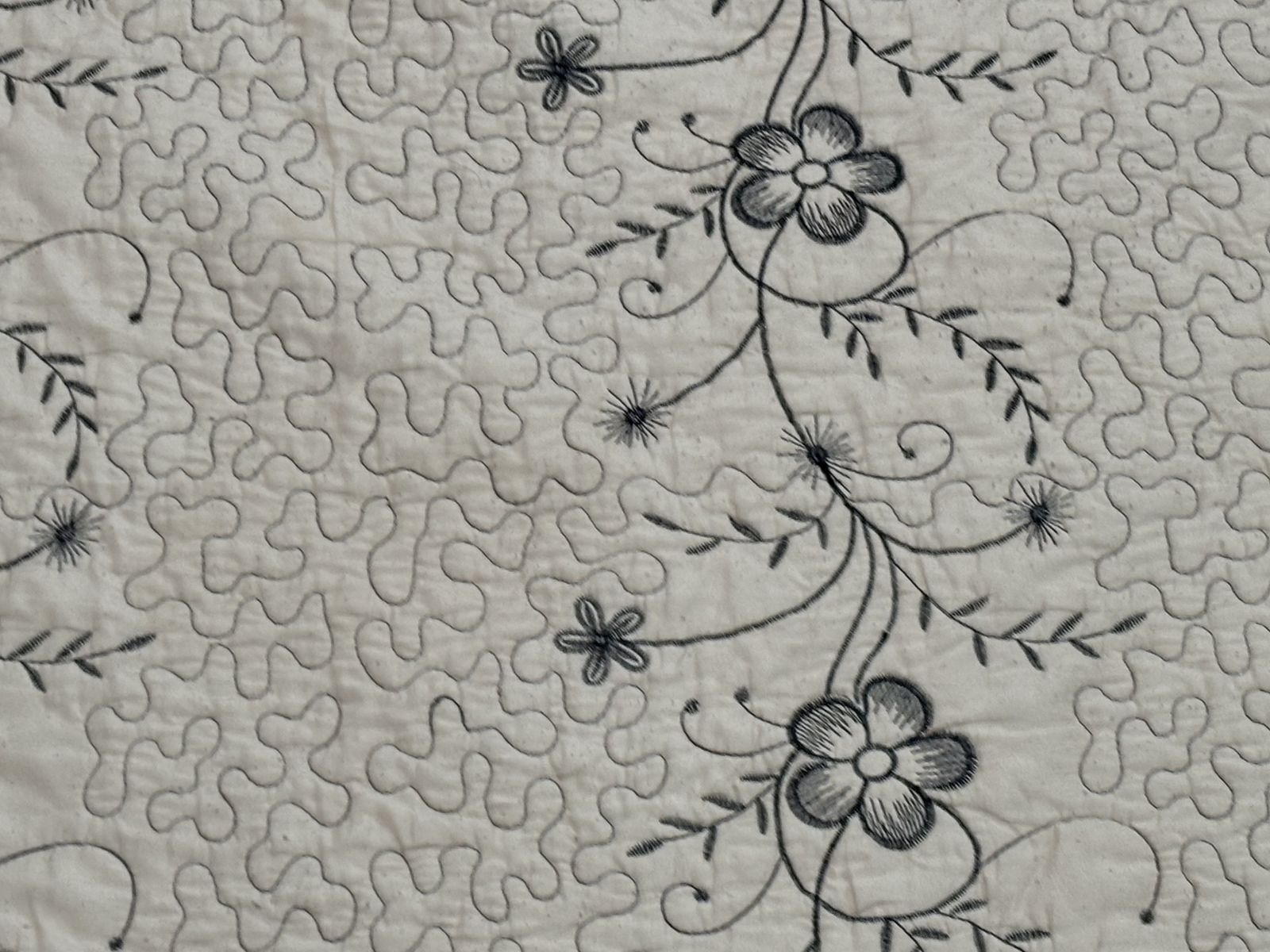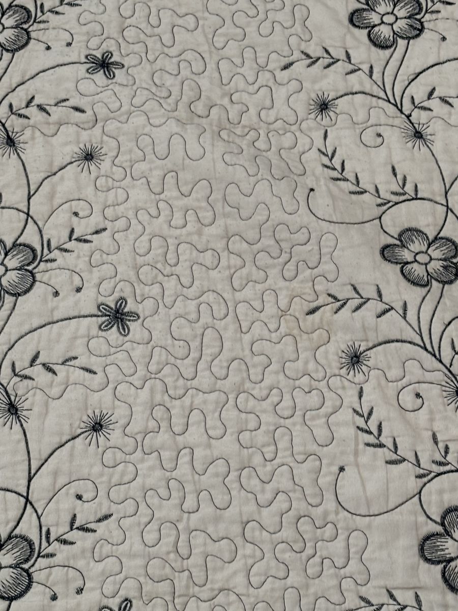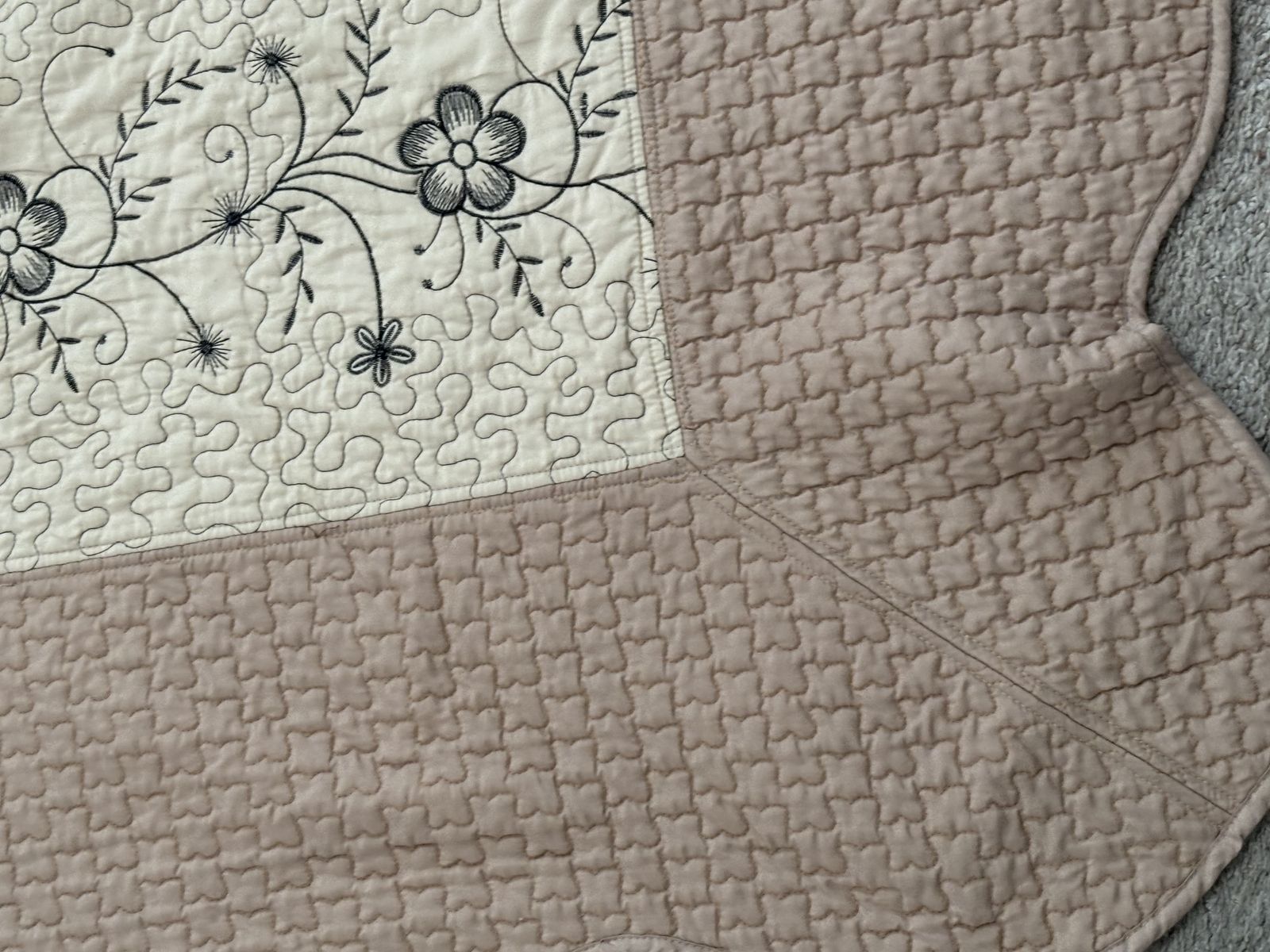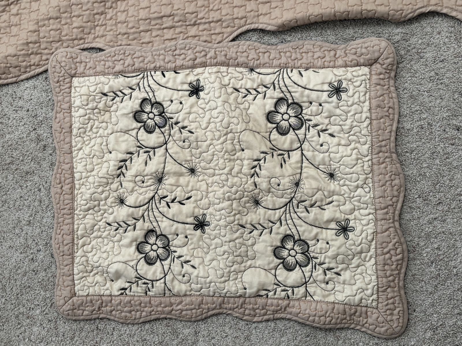 Elegant vintage quilt set, cream floral‑embroidered center, pink scalloped border, matching pillow sham, cozy, decorative, antique‑style home accent. Vintage‑style quilt set with a cream center panel embroidered with elegant black floral vines and subtle gray detailing, bordered by a soft dusty‑pink scalloped quilted backing. Includes a matching pillow sham with the same floral design and pink edge. The set offers a cozy, decorative touch for rustic or antique‑loving home décor, perfect for bedding or display. NOT reversible. The inside has a stain. Size:Queen No advance payment Payment and pick up are at the same time