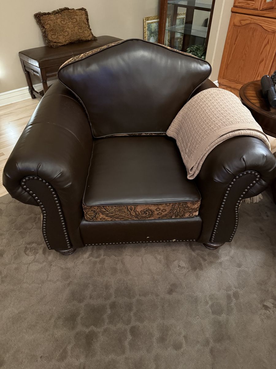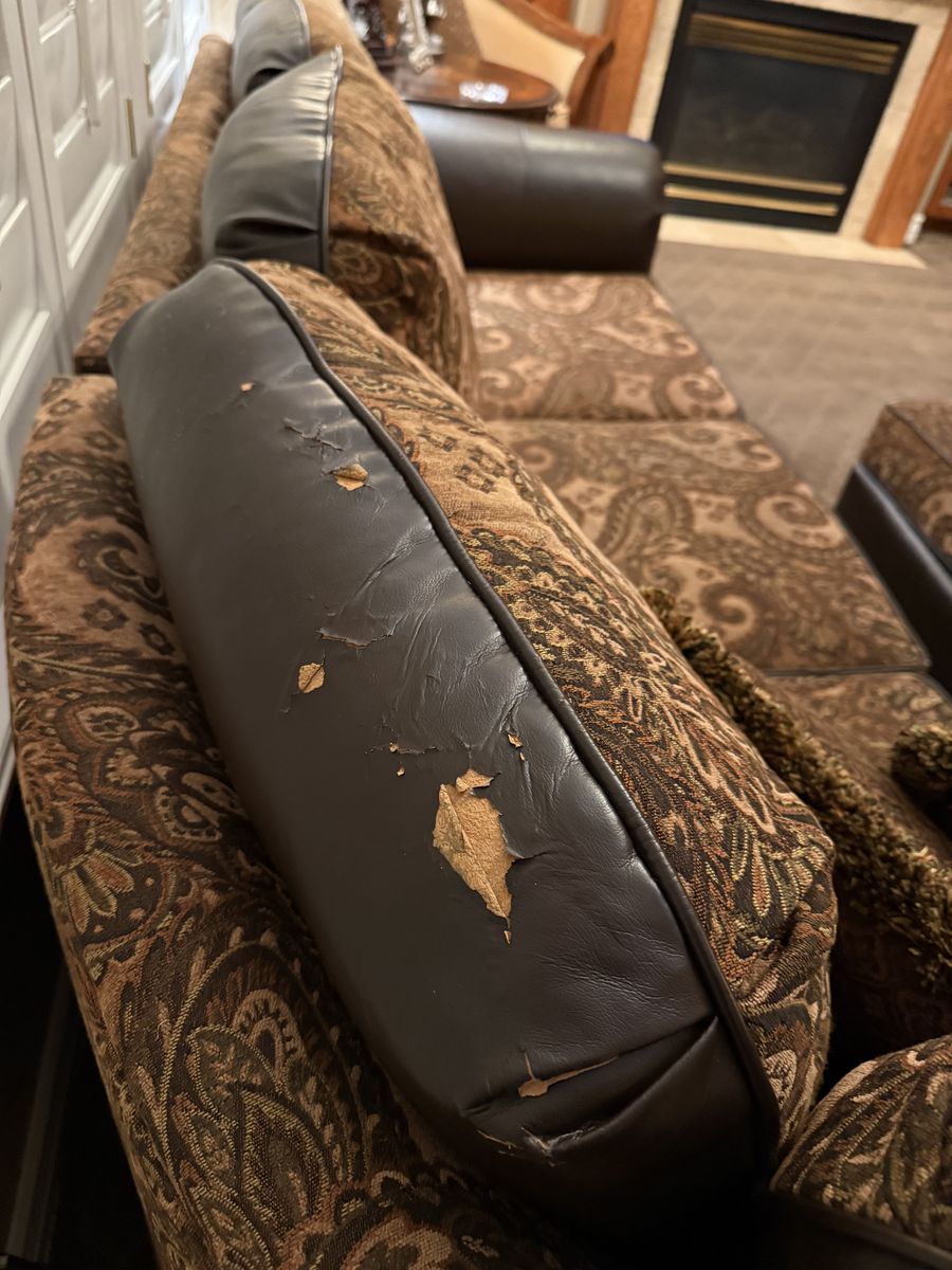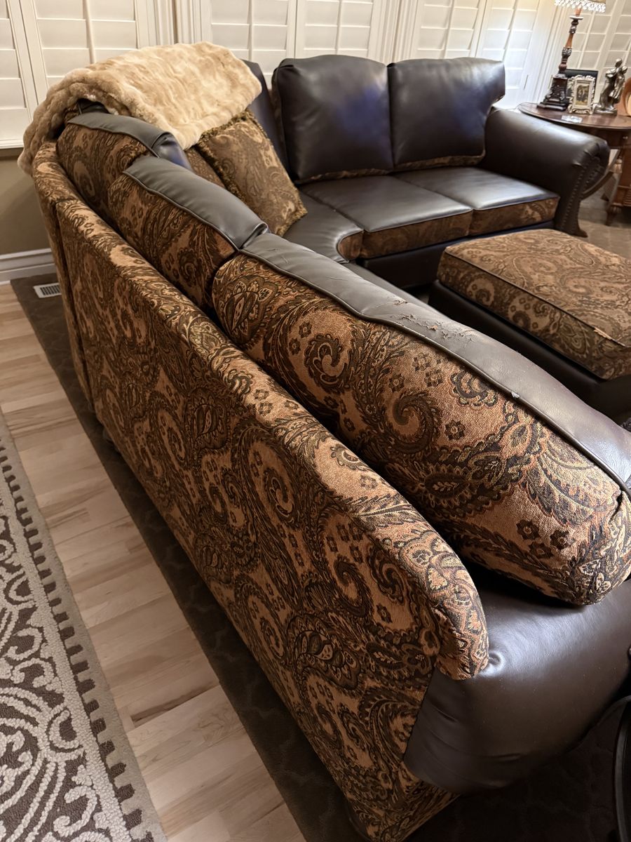 VenmoThis is a great set. It is a custom set that is reversible, so you can have two sectionals in one!!! You can have this paisley design or you can flip the back and seat cushions and have it ALL dark brown leather. We have loved this set but it is showing some wear on the arms and the ribbing on the ottoman. Also on the back of the cushions. (See pictures) All cushions have good padding still and it is very comfortable. We have discussed just keeping it and having it all recovered, but we have decided to just replace it with new. We are giving this away for free. Come and get it.