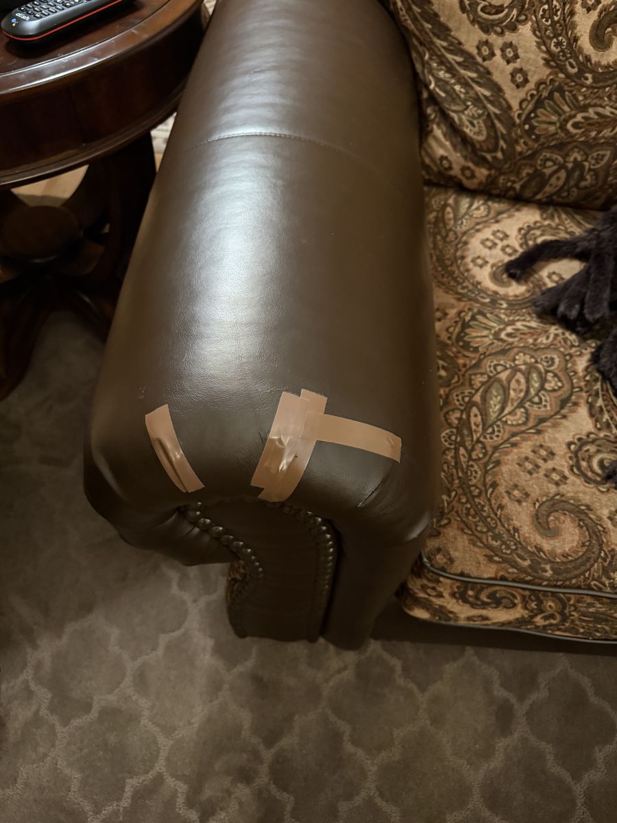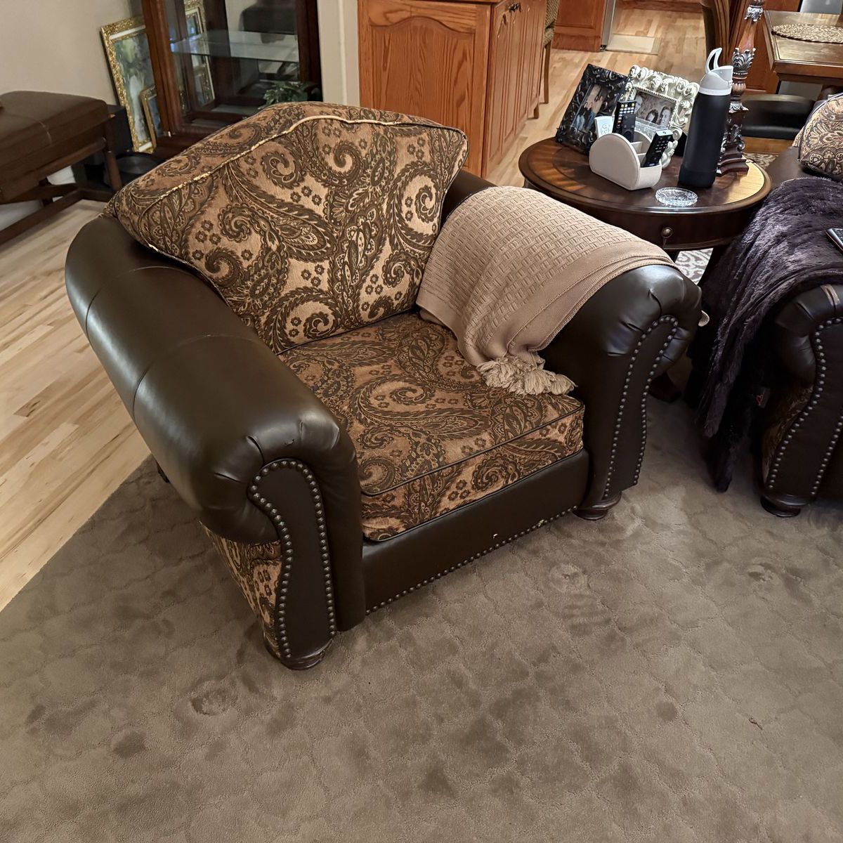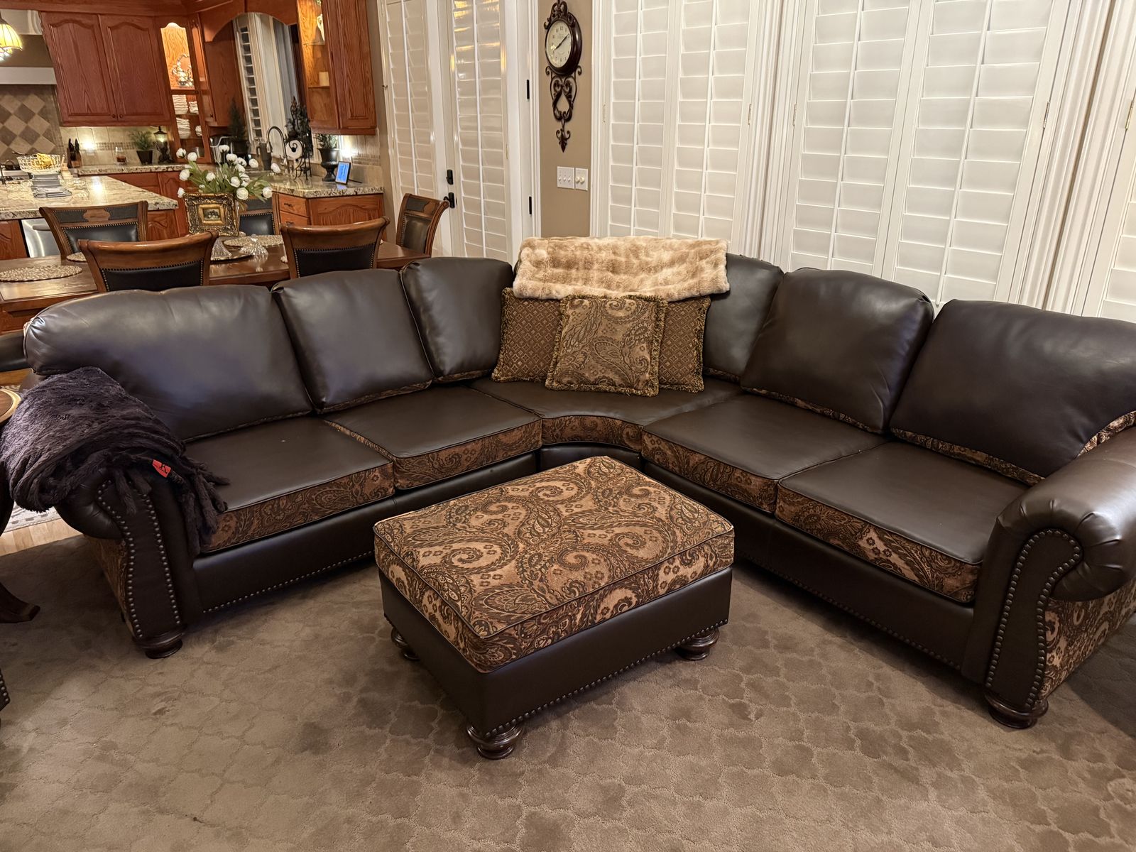VenmoThis is a great set. It is a custom set that is reversible, so you can have two sectionals in one!!! You can have this paisley design or you can flip the back and seat cushions and have it ALL dark brown leather. We have loved this set but it is showing some wear on the arms and the ribbing on the ottoman. Also on the back of the cushions. (See pictures) All cushions have good padding still and it is very comfortable. We have discussed just keeping it and having it all recovered, but we have decided to just replace it with new. We are giving this away for free. Come and get it.