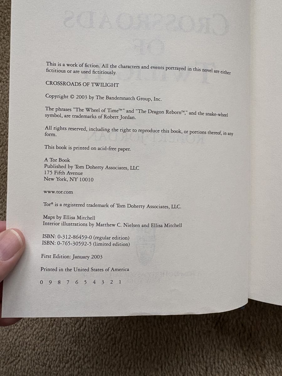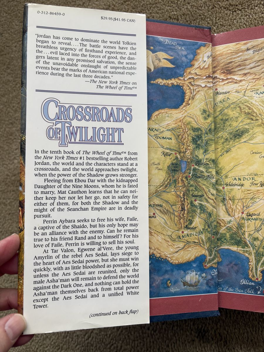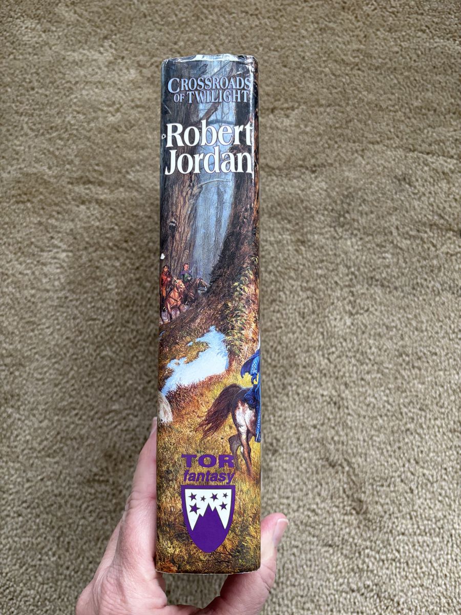 Crossroads of Twilight, Book 10 in The Wheel of Time series by Robert Jordan. Hardback (larger 9.5” version) in very good condition, including dust jacket. Some slight wear at top and bottom of spine, some slight discoloration on page edges. Tor Fantasy. First edition, 2003, 700 pages. Text only. Cash or Venmo.