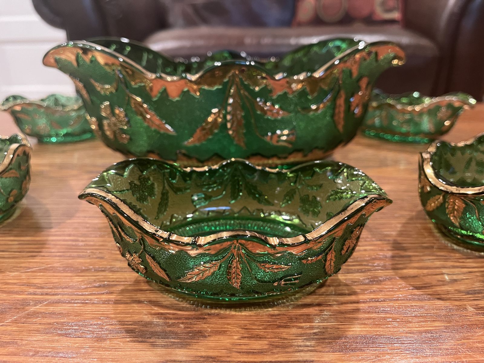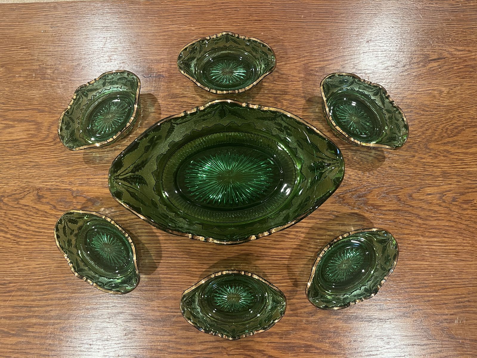 VenmoThis is a stunning set in excellent condition. This glass is Early American Pattern Glass, EAPG. Made by US Glass Company. Which started making glass in 1899. The pattern is called Delaware which was part of their State Series. This has the gold gilt decorated glass, which really adds beauty to the raised floral and leaf pattern. The large oval bowl measures 4 inches tall x 11 3/4 inches long x 7 1/4 inches across. The small berry bowls measure 1 3/4 inches tall x 5 1/2 inches long x 3 1/2 inches across. The green color is quite vibrant. There is a tiny bit of wear of the gold on the large bowl. Otherwise this looks like it was never used. Sold ony as a set. This is a must see item! Price is firm.