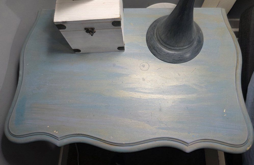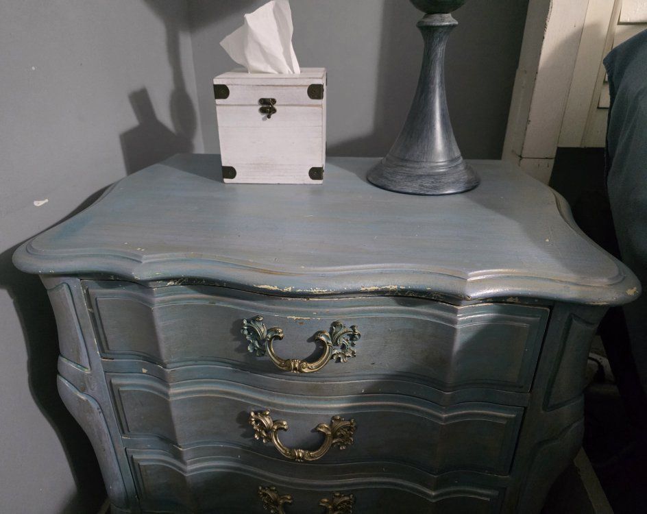 PayPalThey don't make 'em like they used to. This solid wood nightstand needs a little love. But since it's all wood, it will be easy to refinish. Its finish now is blue with a light gold rub. 3 drawers that glide perfect. Not on rollers. 26" wide x 26" tall x 17" deep I'd like to get $60 out of it. It's a great solid piece. And the drawers are featuring dovetail joints that are found on antique pieces. But I'm open to offers too.