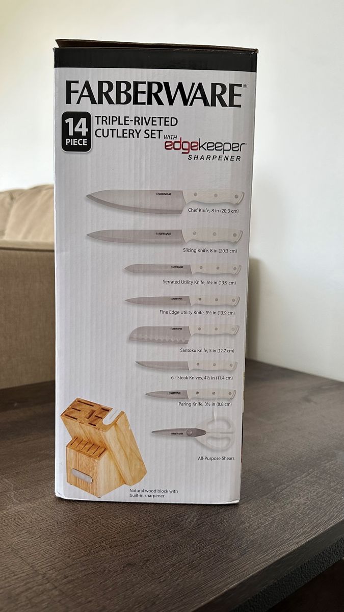Brand new. Space spacing knife block set with built in sharpener. 14 pieces. Triple riveted handles. This set includes a natural finish wood block with a universal EdgeKeeper built in knife sharpener.