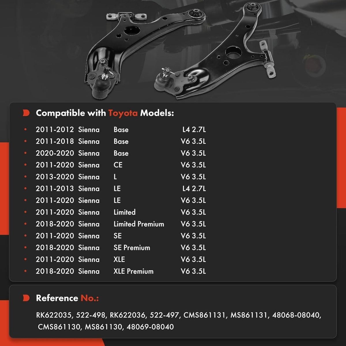 Vehicle Fitment: Compatible with Toyota Sienna 2011 2012 2013 2014 2015 2016 2017 2018 2019 2020 Installation Position: Front Lower Left and Right, Driver and Passenger Side Professional Replacement: This control arm assembly is replacement for above model's suspension system, and may help you resolve those problems: clunking noise steering wander uneven tire wear excessive vibration Specification: Condition: Brand New; Material: Steel; Control Arm Bushing Included: Yes; Ball Joint Included: Yes; Pre-Greased: Yes; Accessories Included: As Picture; Reference Part Number: RK622035, K622035, RK622036, K622036, 522-497, 522-498, CMS861131, MS861131, CMS861130, MS861130, 48069-08040, 48068-08040