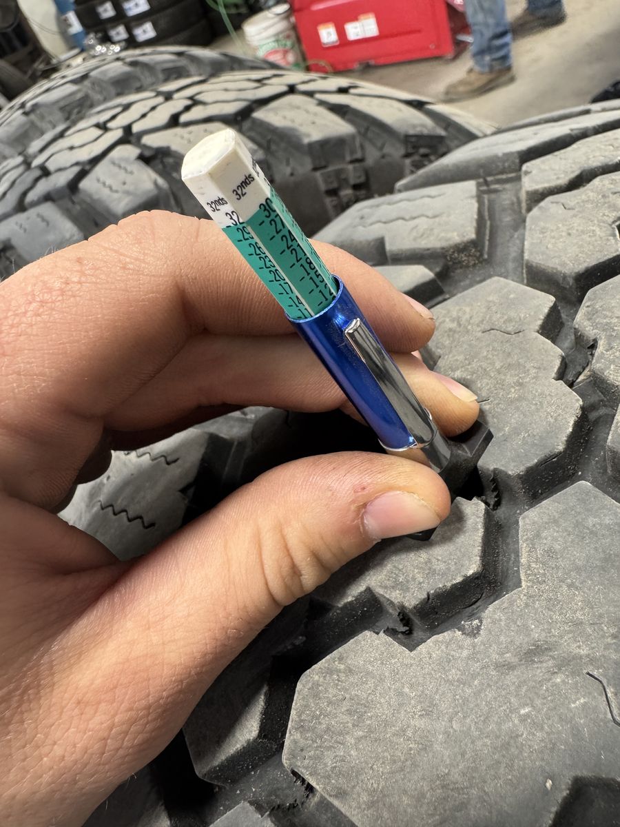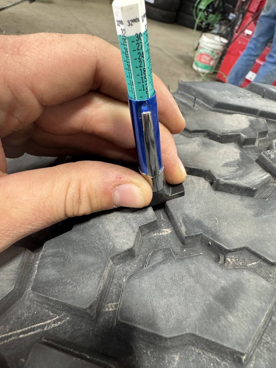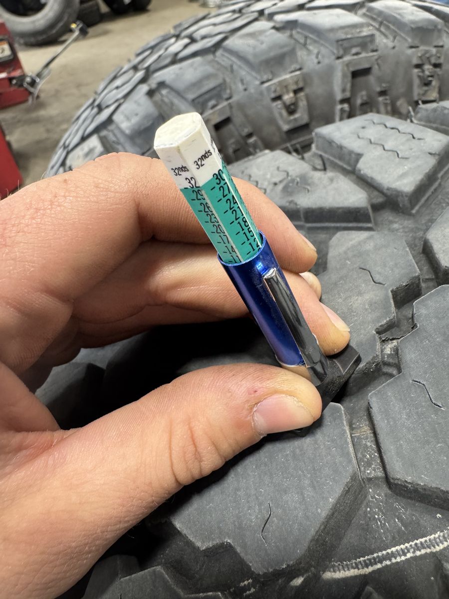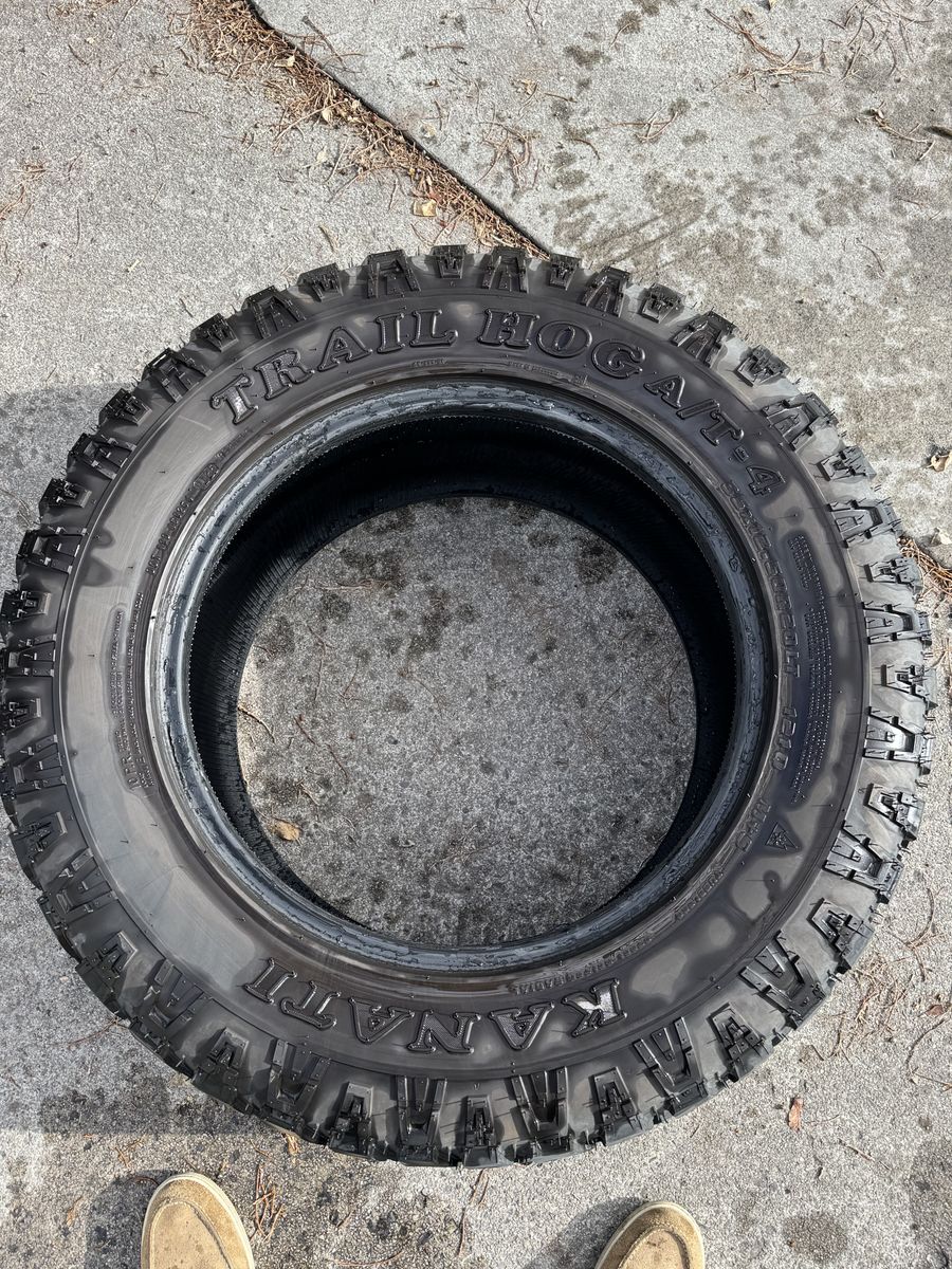 4 Kanati Trail Hog AT4 load range E 10ply 2 tires at 8/32 tread- half life left 2 tires at 12/32 tread-3/4 life left Projected mileage is 40,000-50,000
