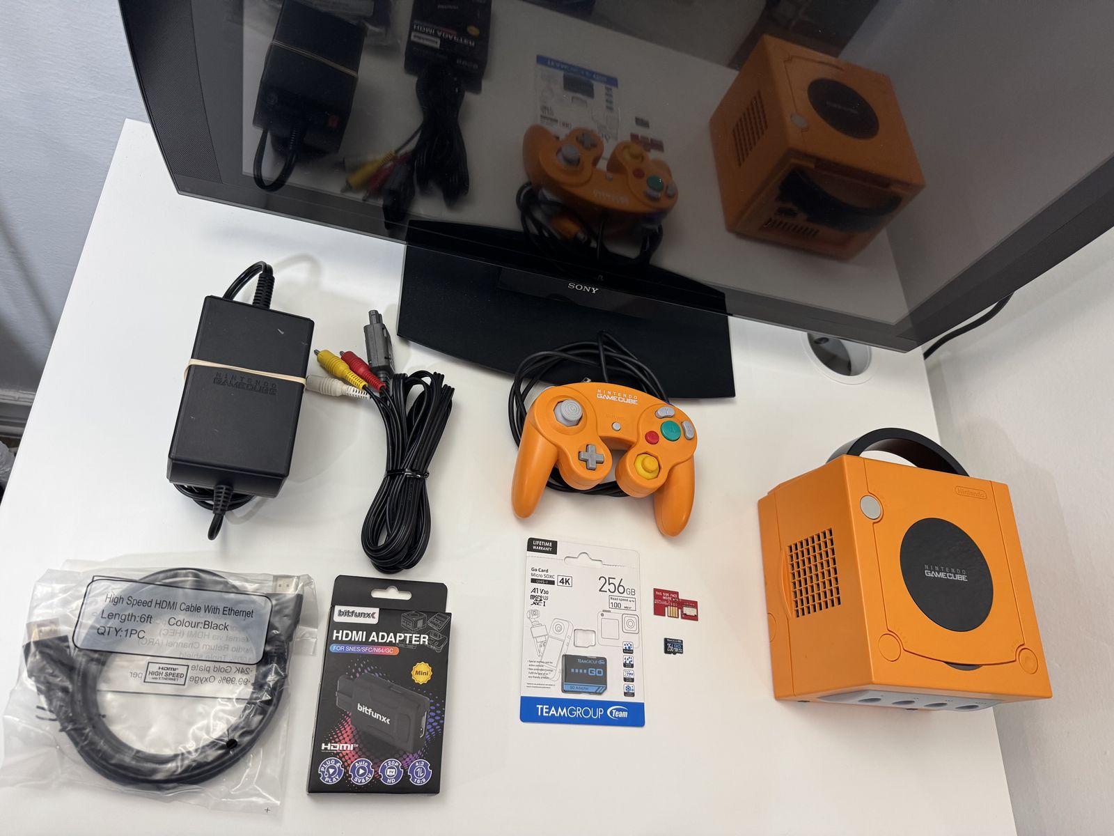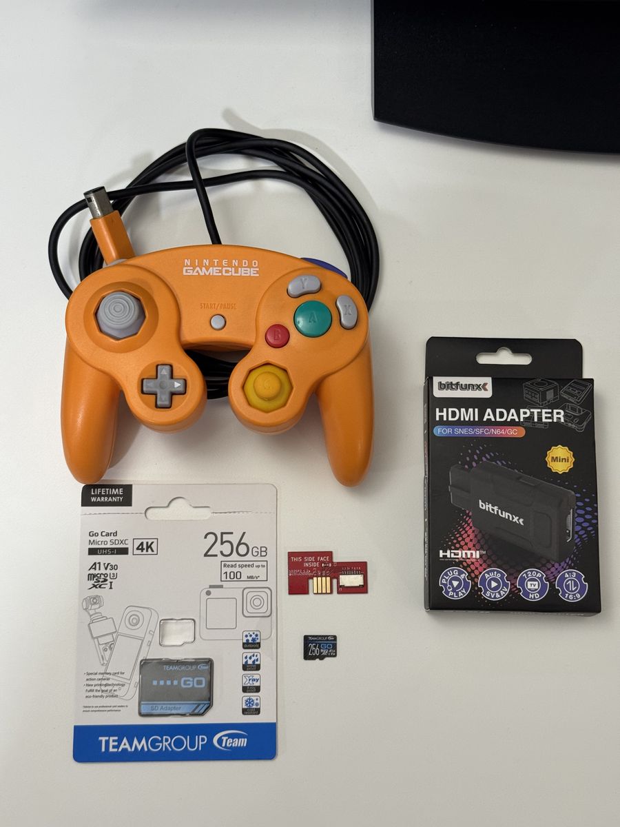 Zelle1 GameCube Spice Orange Dol-001 Mod Picoboot (New Clock Battery) 1 Controller 1 Micro Sd Card 256Gb TeamGroup Loaded 1 Sd2SP2 Card 1 Power Cable 1 Hdmi Converter 1 Hdmi Cable 1 Av Cable