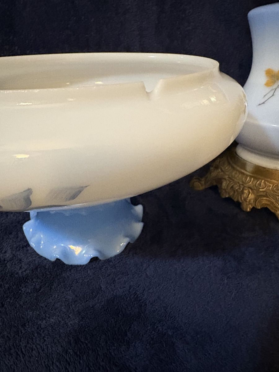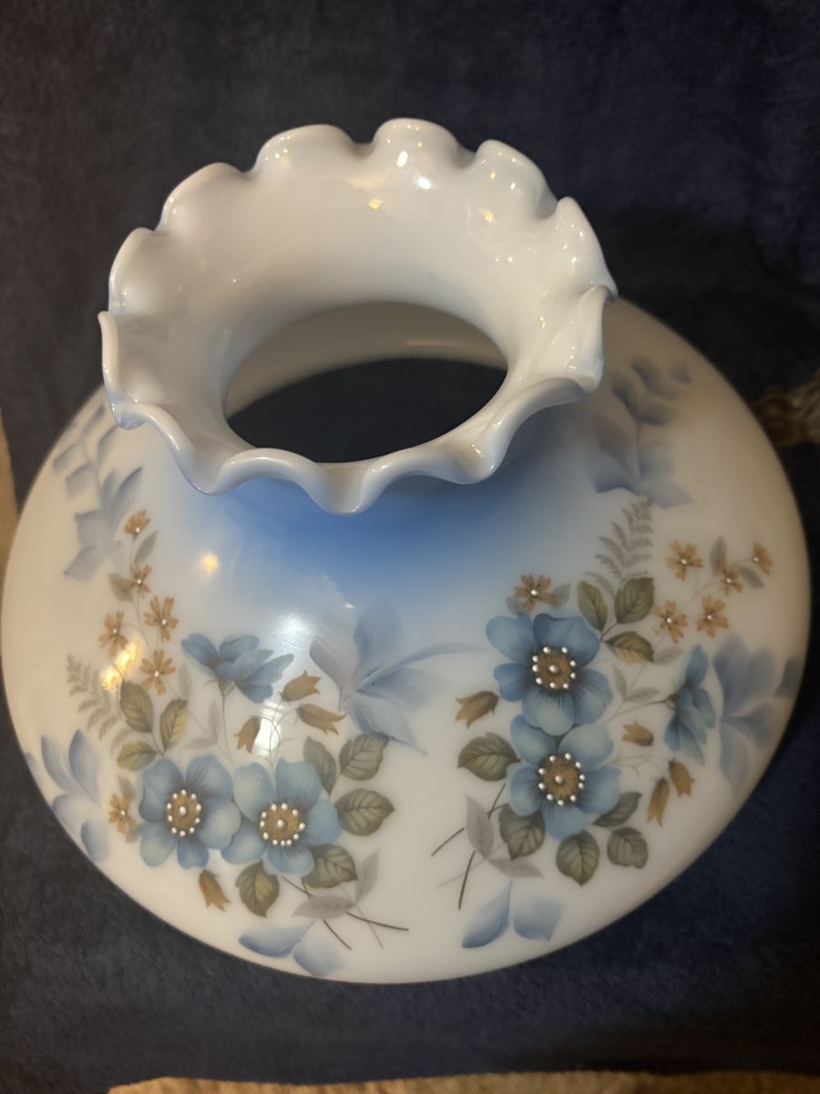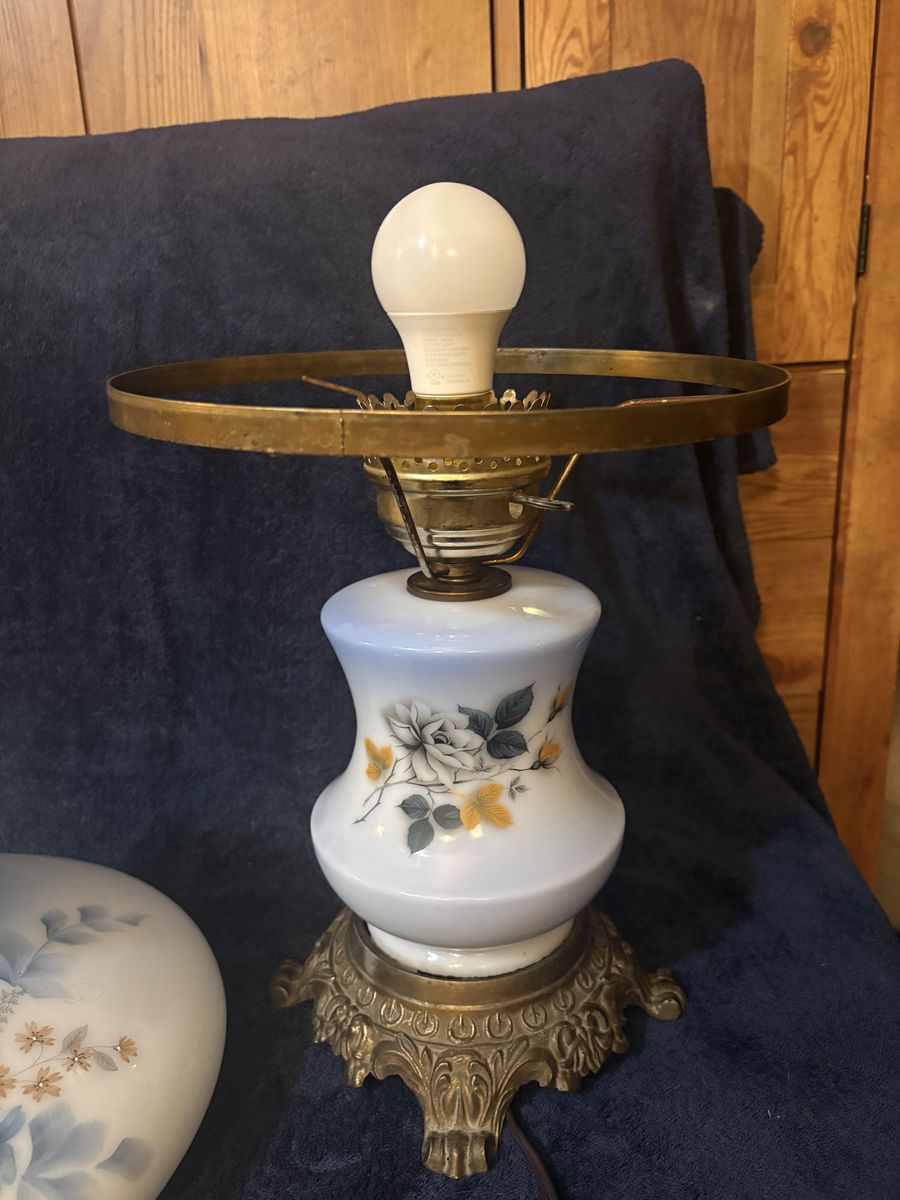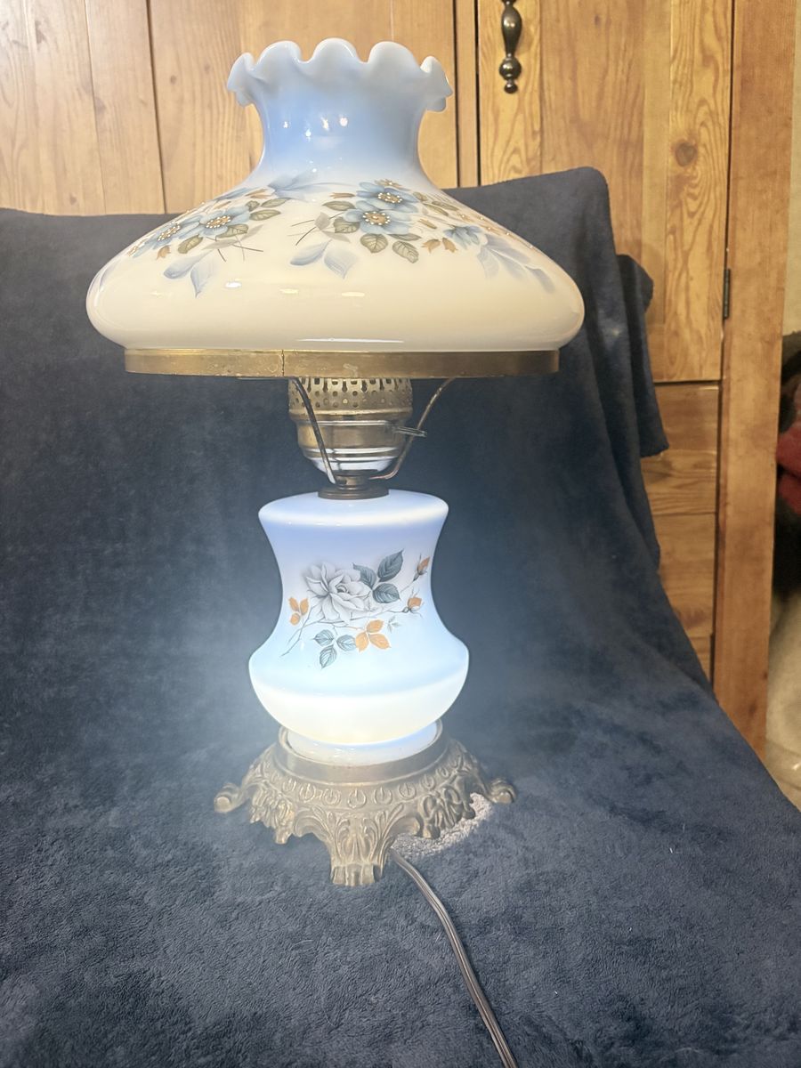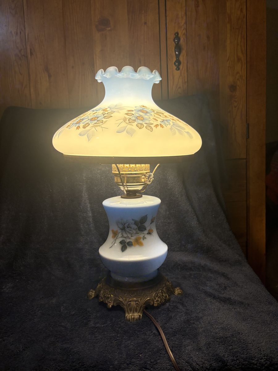 VenmoVintage Hurricane Table Lamp or Gone with the Wind lamp. Works great, glass shade, there is a light in the base that comes on with the top light or you can turn it on by itself kinda like a night light. There is a small chip in the shade but it’s under the rim so you can’t see it, see pics.