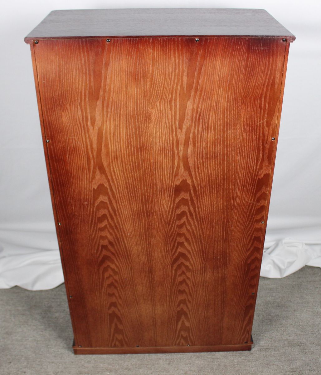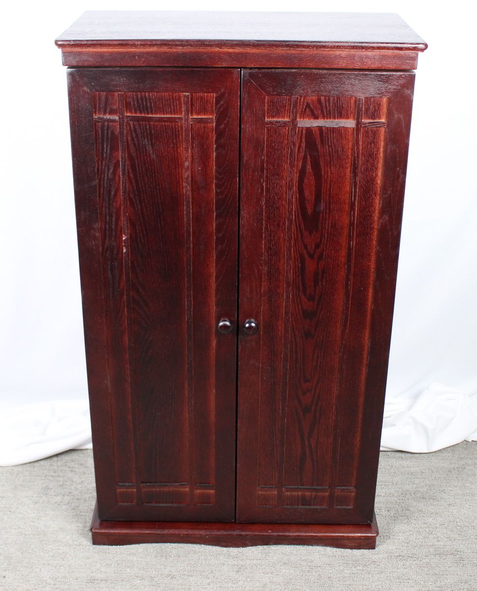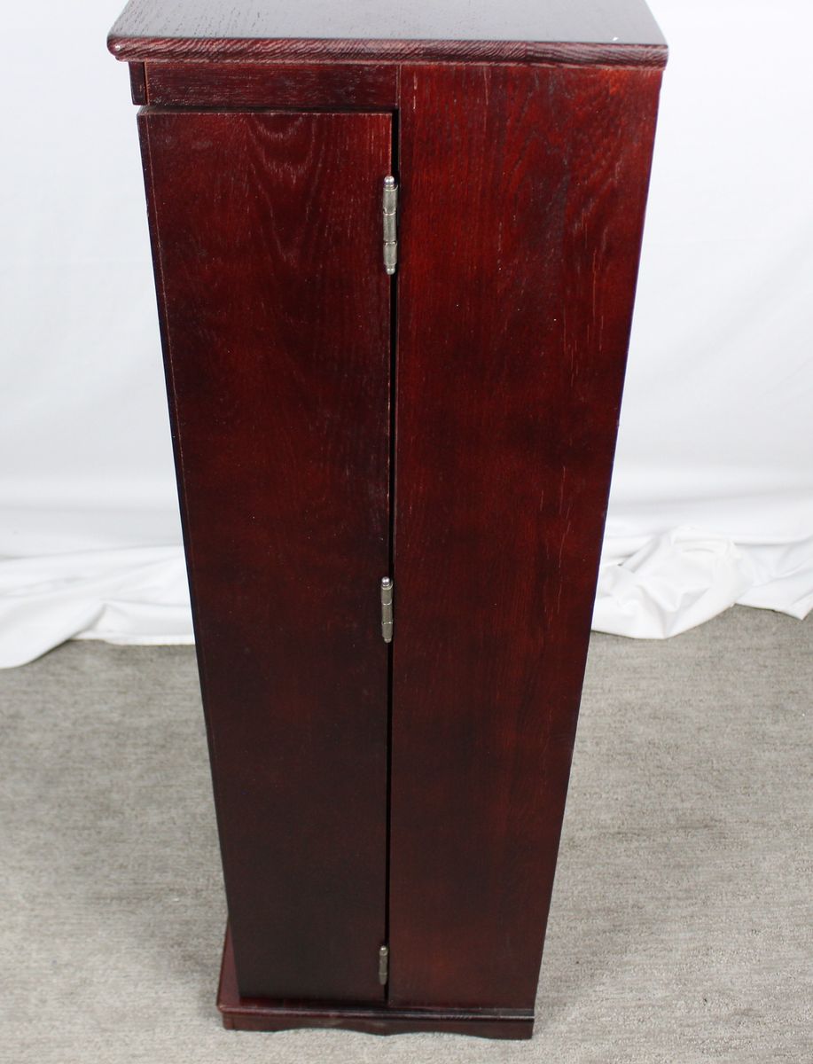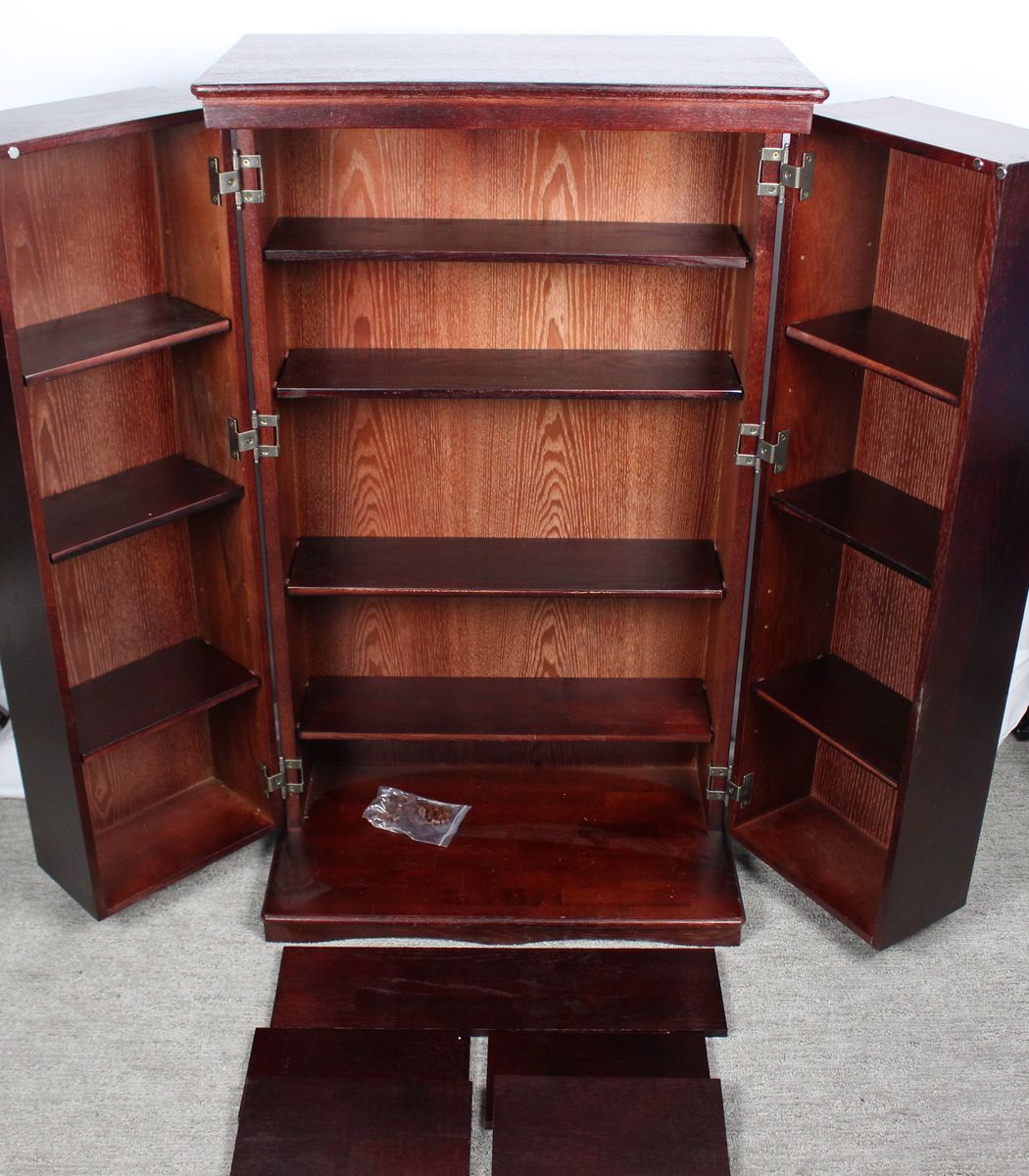 New condition with some blemishes-See pictures We have 3 of these available 2 are still in sealed box Deluxe Cherry Finish Comes Fully Assembled Fully adjustable shelves allow for total versatility in storing DVD's, Videotapes and Game Cartridges Holds 612 CDs or 298 DVDs