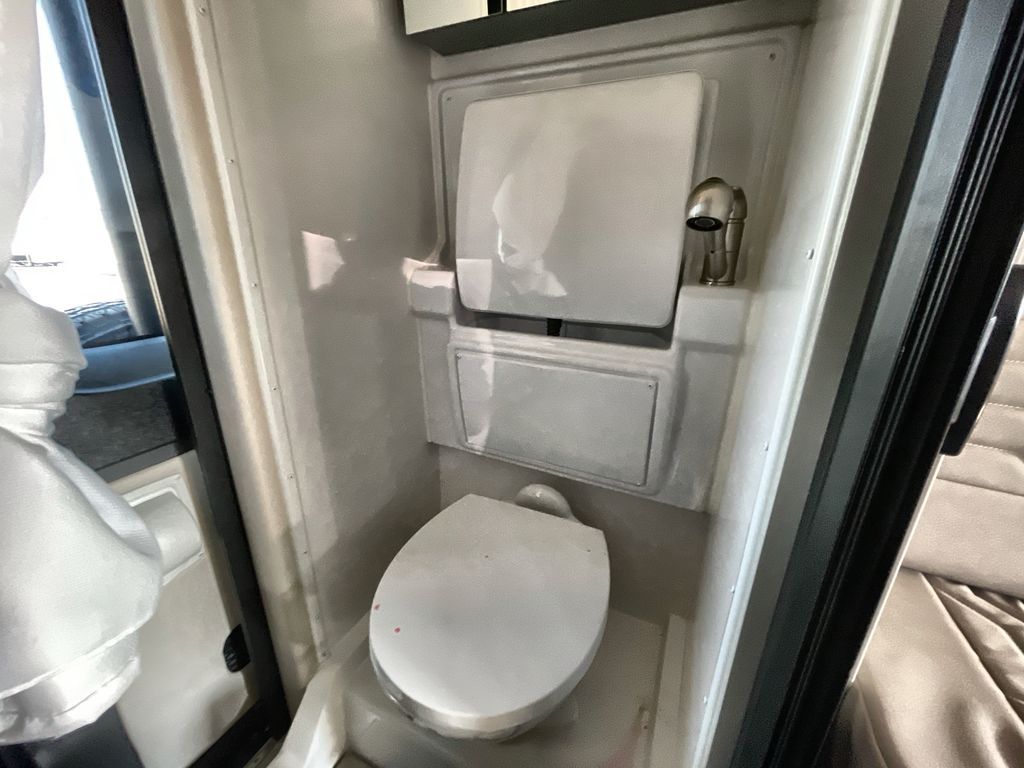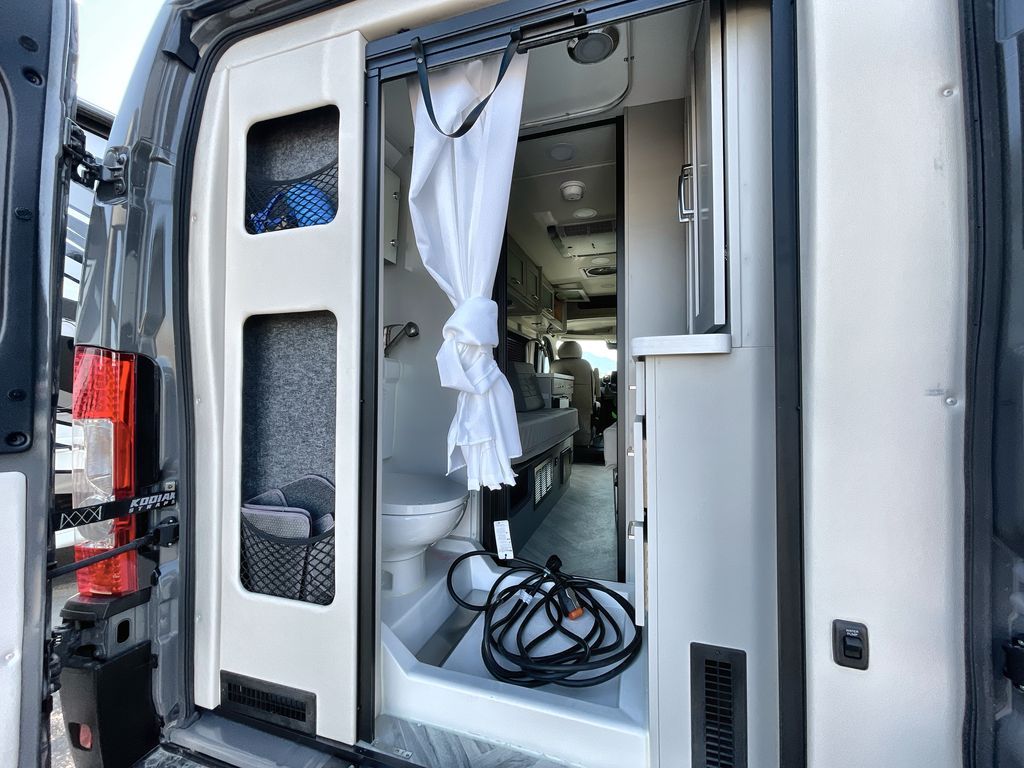 This camper van with a full rear bath will meet your needs surprisingly well. Two twin beds will provide comfortable sleeping space each night, and the swivel table in between the beds will be the perfect place to enjoy breakfast together. There is a bath wardrobe to keep your clothes tidy, plus you'll find overhead cabinets above the beds and additional storage just as you enter the coach for your belongings. This coach also includes swivel captain's seats so you can turn them around for living room seating!