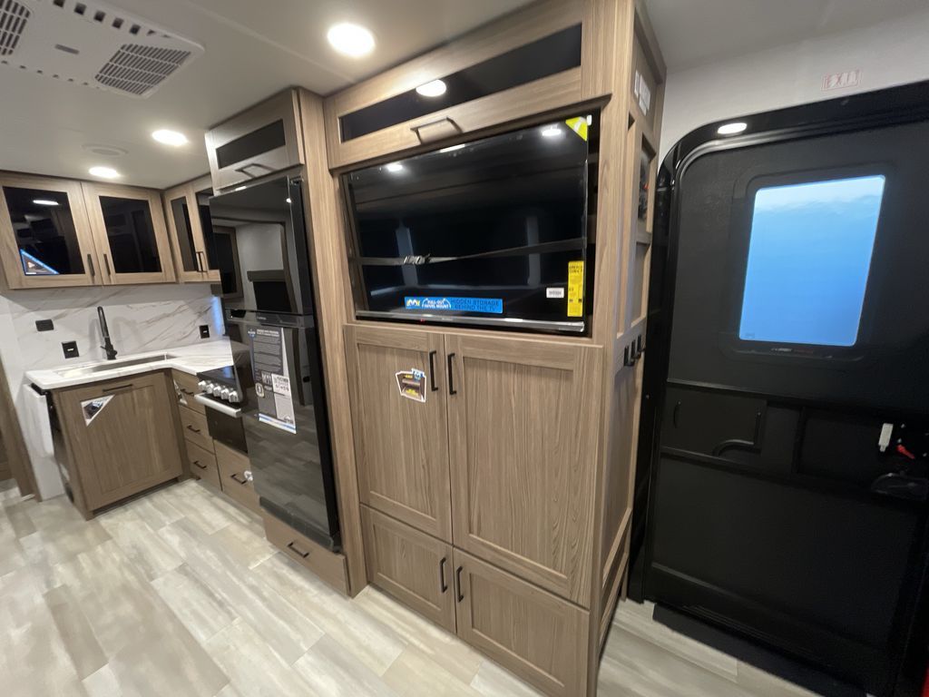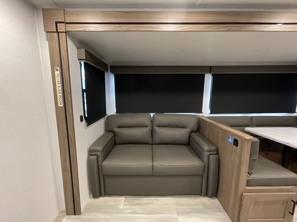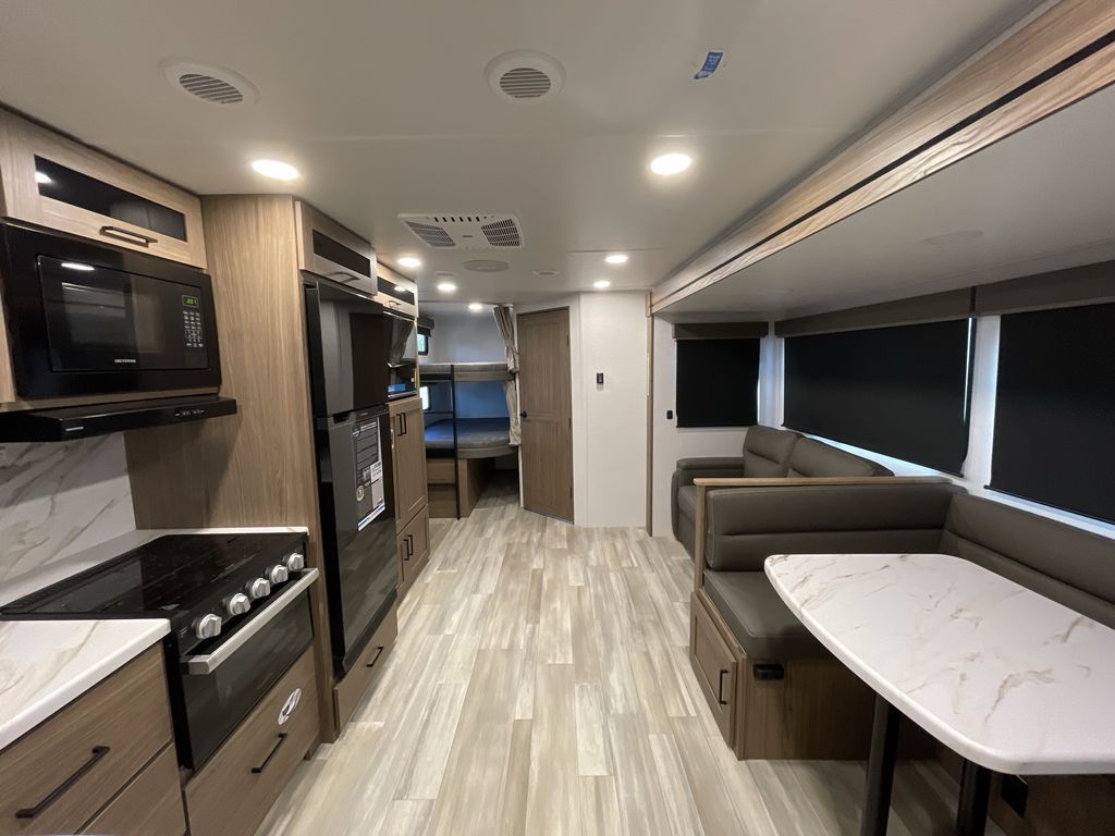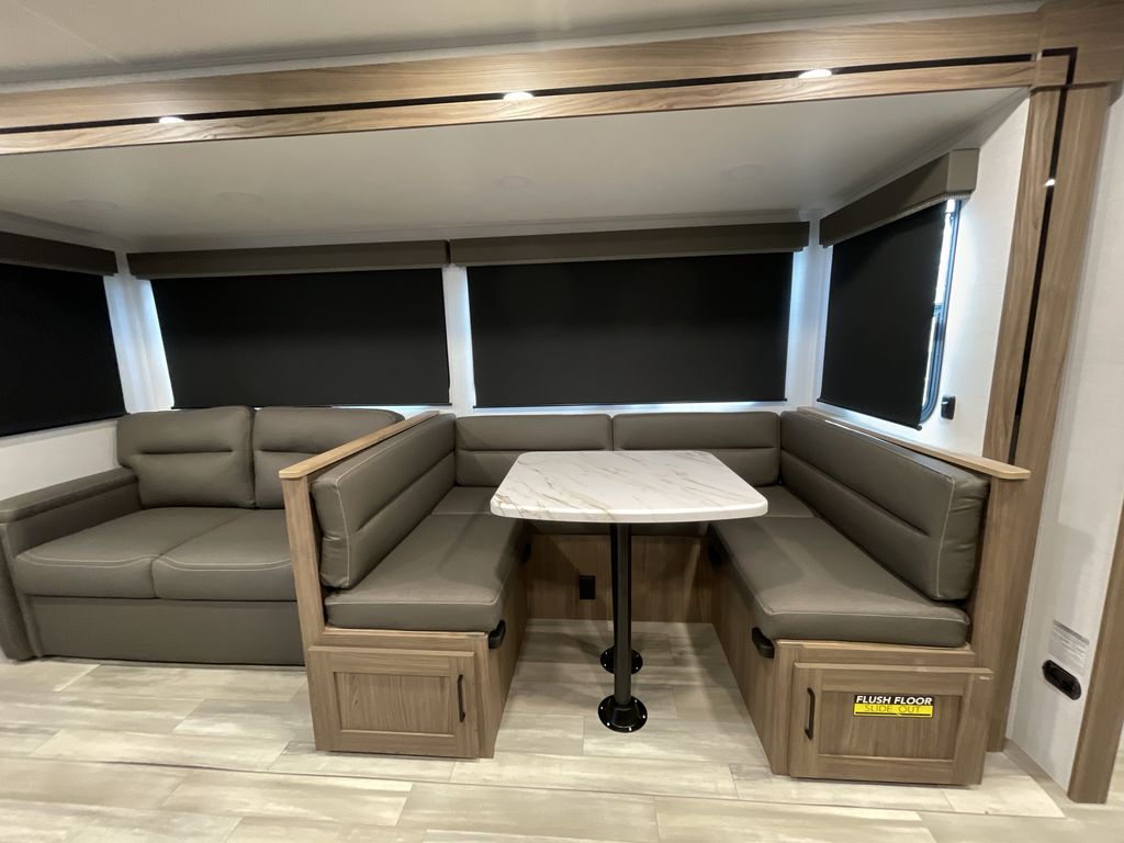 The perfect travel trailer for a larger family or one that enjoys traveling with friends! One large slide opens up the interior living space nice and features a U-shaped dinette and theater seating to provide plenty of seating for everyone. Enjoy the 40" HDTV opposite the seating for a movie indoors, and game night will be easy with everyone at the dinette which can also be converted for added sleeping if needed. The double entry doors will make loading and unloading simple and allows you to easily slip in and out of the private bedroom for a morning walk. You can easily prepare all of your favorite meals and snacks with the kitchen amenities provided inside. A three-burner range allows you to easily cook indoors, or you can enjoy cooking outside using the outdoor griddle/grill if you like. There is a 10-cu. ft. 12V refrigerator to keep all of your perishables and drinks nice and cold, plus a large sink for dishes and cleaning up, and there is also a flip-up counter extension for more prep space. You will also appreciate the rear corner bath featuring a 30" x 36" shower, vanity with sink, soft close porcelain toilet with foot flush, and linen cabinet for your towels.