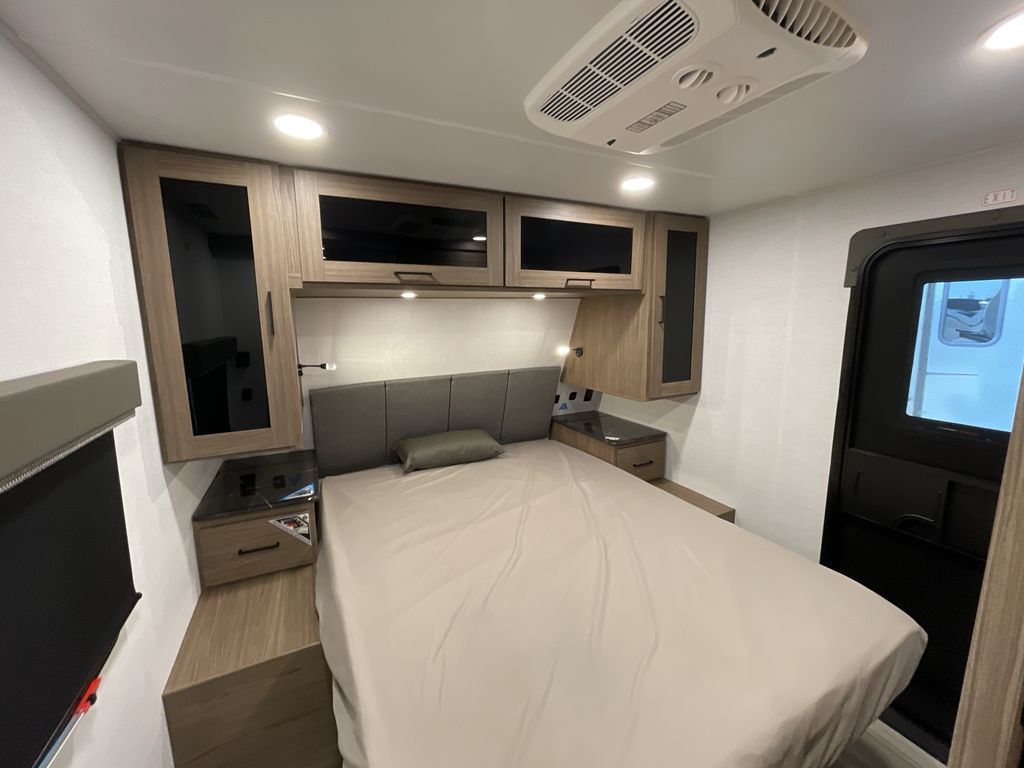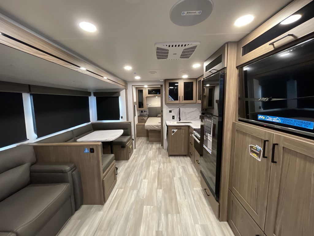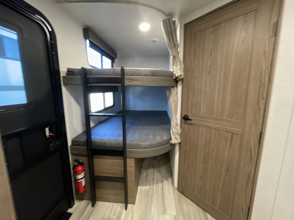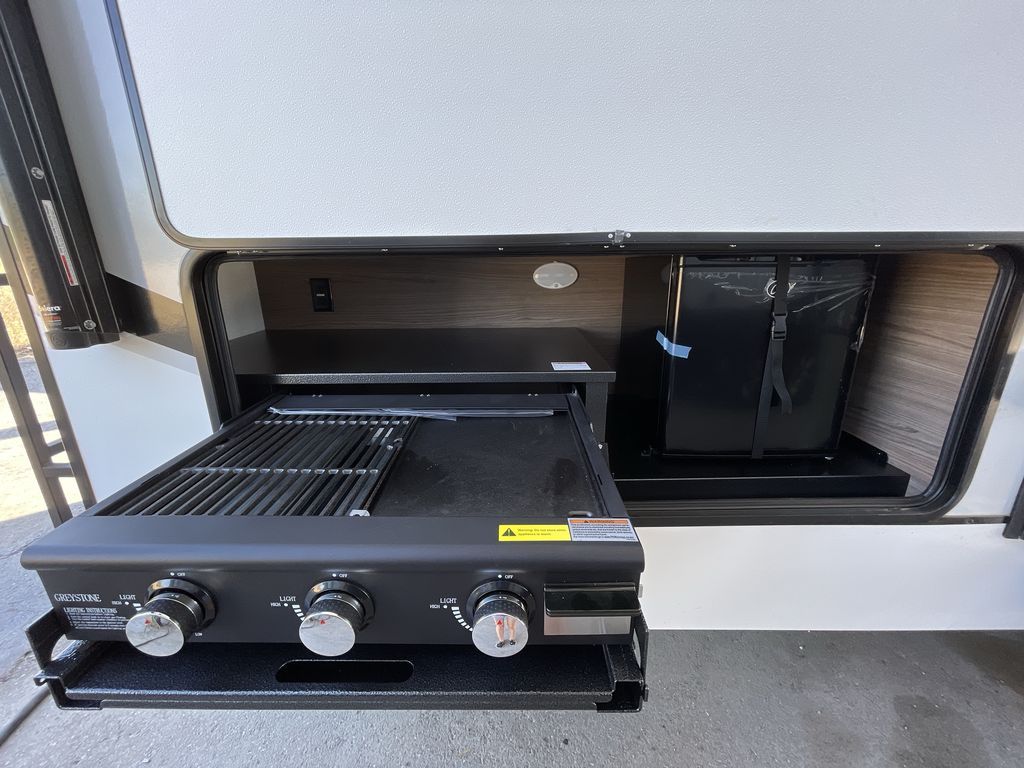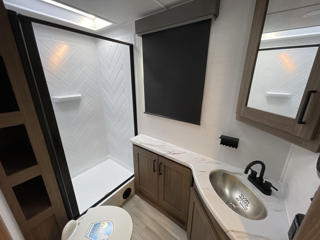 The perfect travel trailer for a larger family or one that enjoys traveling with friends! One large slide opens up the interior living space nice and features a U-shaped dinette and theater seating to provide plenty of seating for everyone. Enjoy the 40" HDTV opposite the seating for a movie indoors, and game night will be easy with everyone at the dinette which can also be converted for added sleeping if needed. The double entry doors will make loading and unloading simple and allows you to easily slip in and out of the private bedroom for a morning walk. You can easily prepare all of your favorite meals and snacks with the kitchen amenities provided inside. A three-burner range allows you to easily cook indoors, or you can enjoy cooking outside using the outdoor griddle/grill if you like. There is a 10-cu. ft. 12V refrigerator to keep all of your perishables and drinks nice and cold, plus a large sink for dishes and cleaning up, and there is also a flip-up counter extension for more prep space. You will also appreciate the rear corner bath featuring a 30" x 36" shower, vanity with sink, soft close porcelain toilet with foot flush, and linen cabinet for your towels.