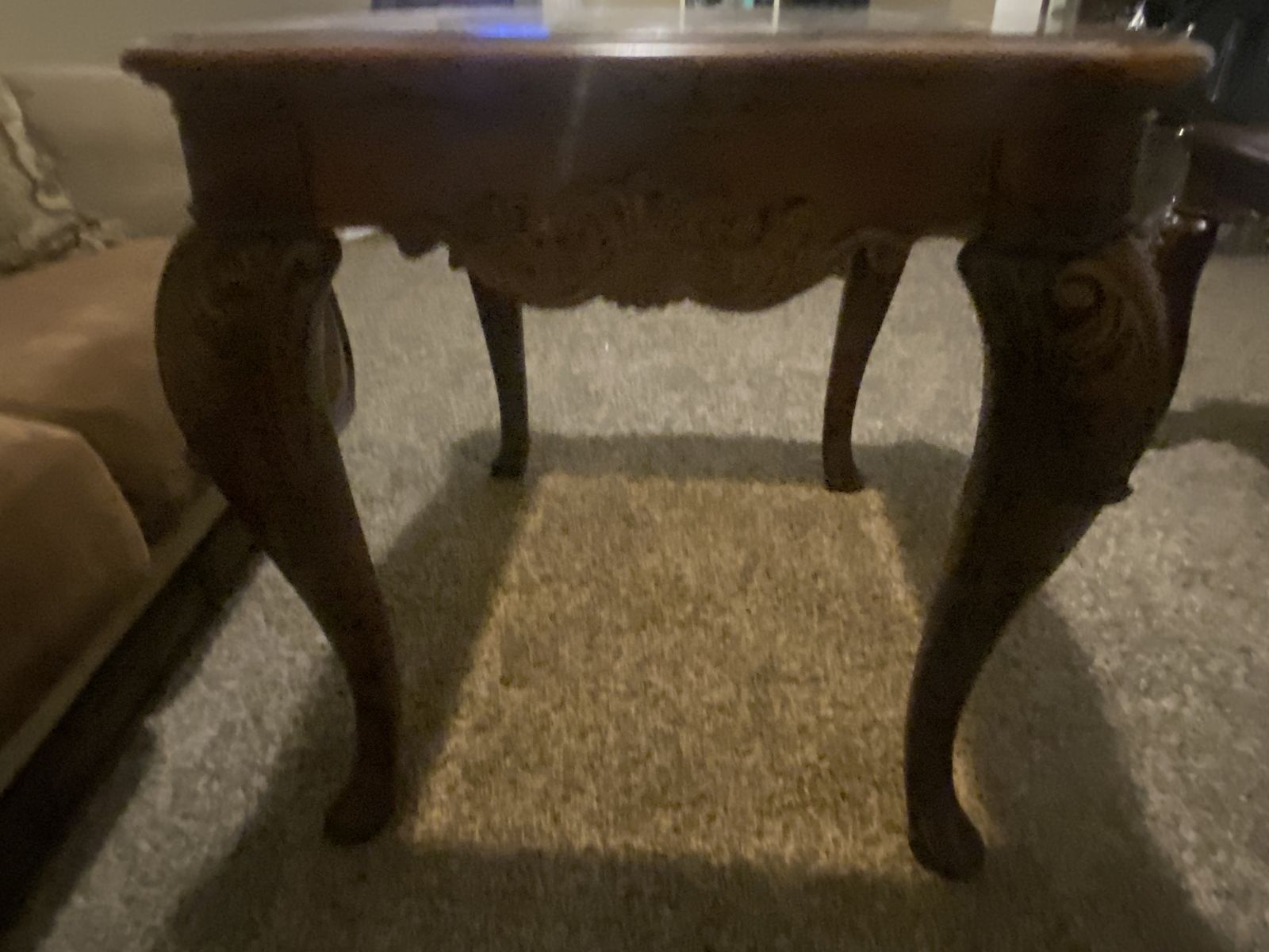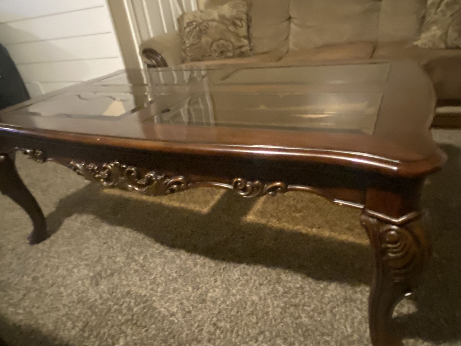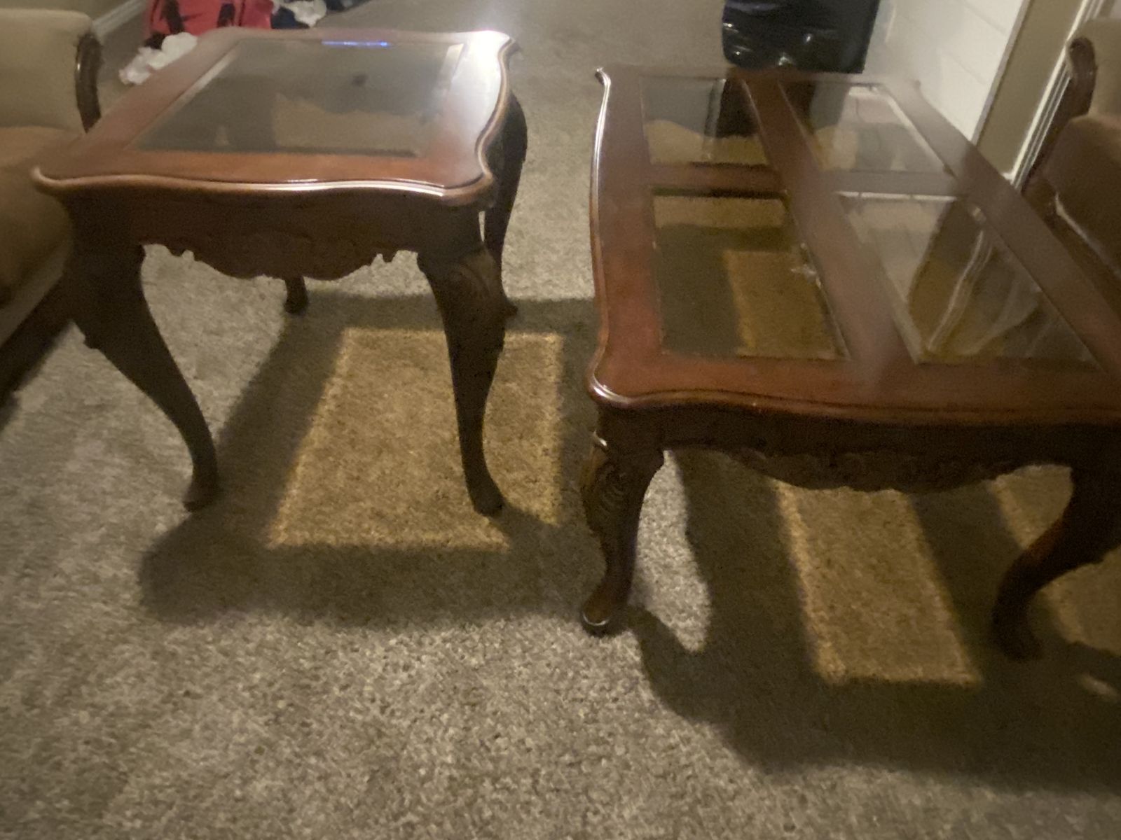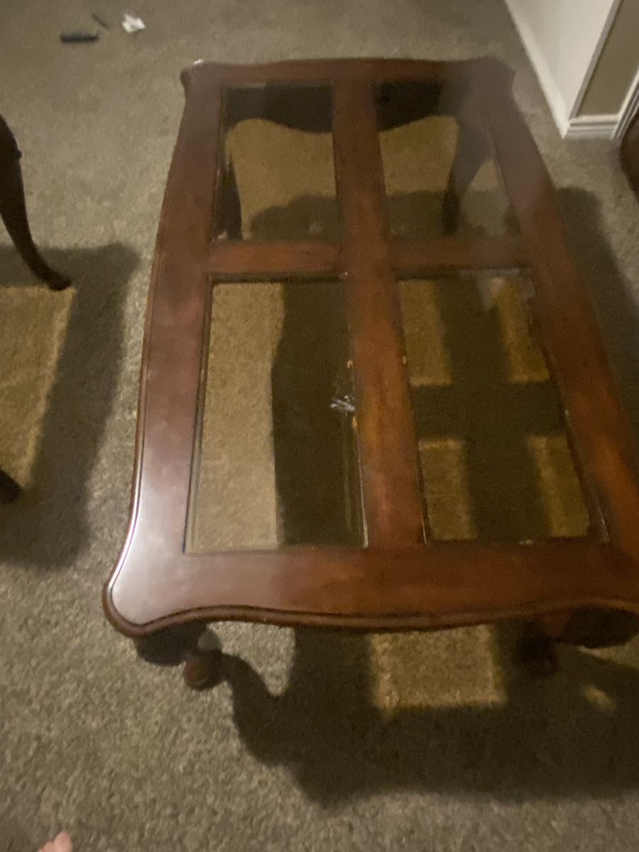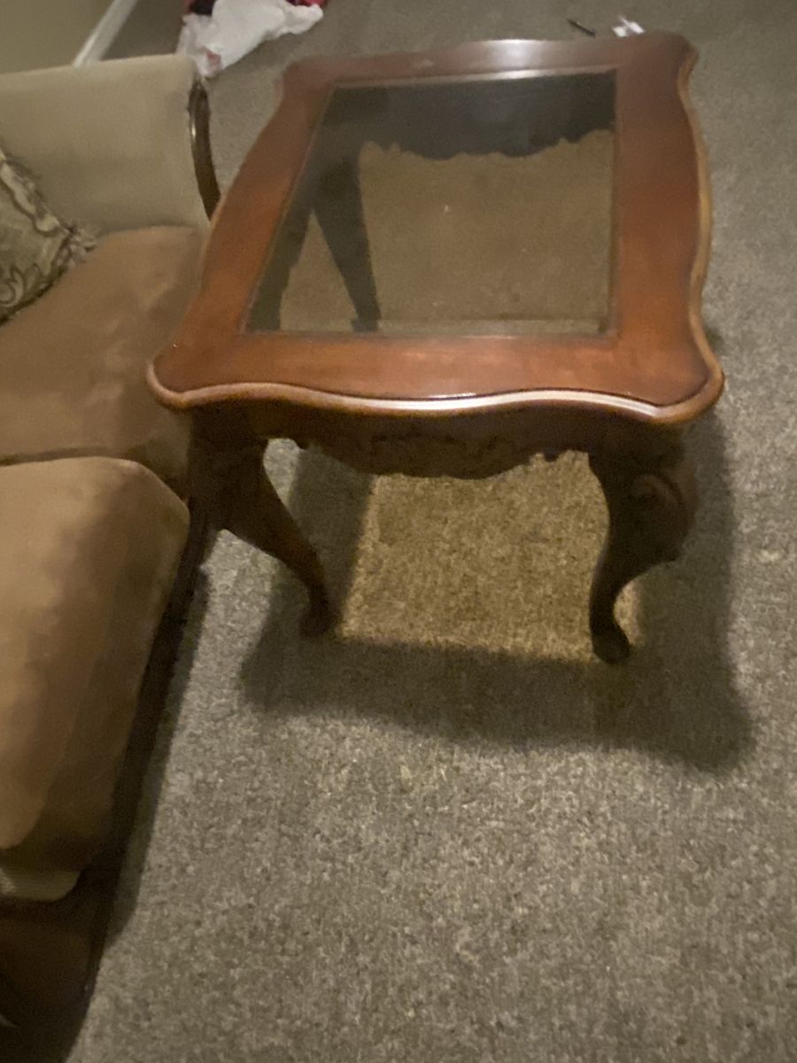 Pretty sturdy in decent condition matching coffee table with end table. Michelle 801-589-0651 Cash only