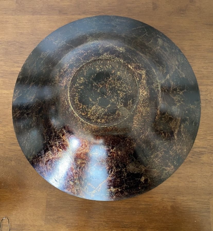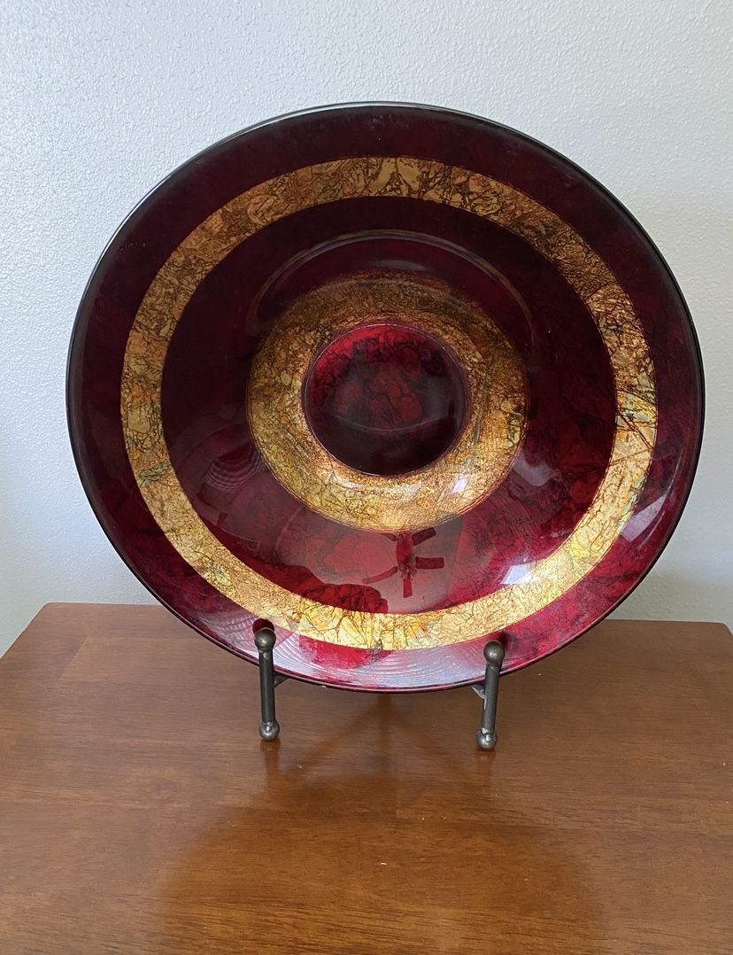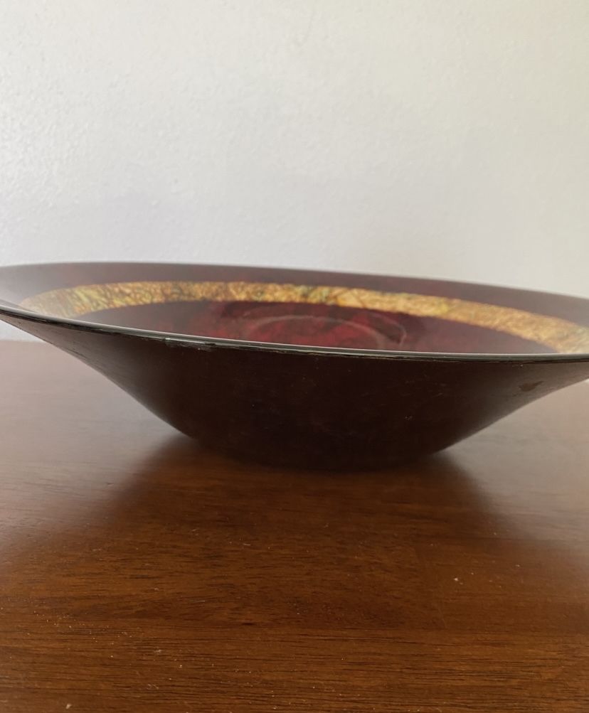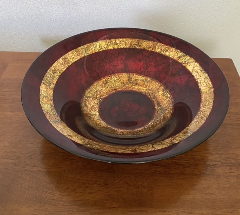 Vintage Italian made bowl, made of Italian glass, with bands of red and gold foil on the upper side. The underside is a gorgeous brown & gold foil in a crazed look. Smoke free home