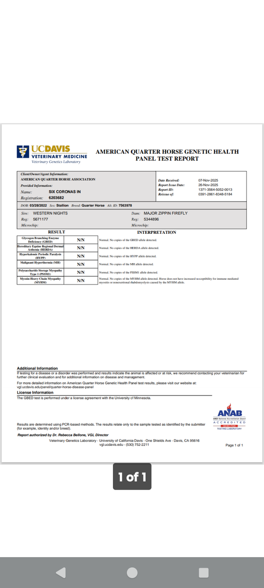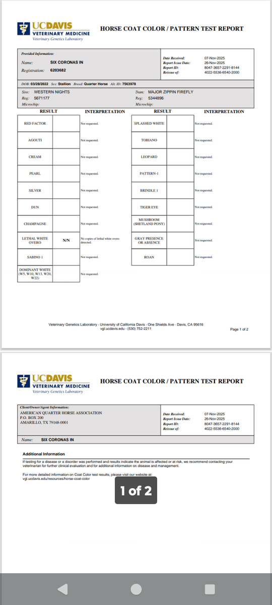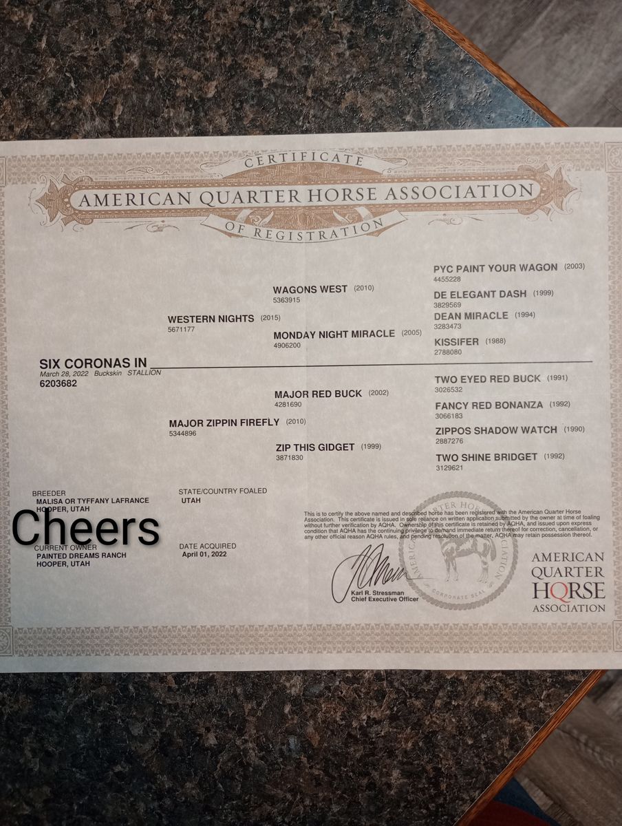Six Coronas In (Cheers) AQHA Buckskin stallion standing at stud . Color test (Ee AA Cr nd1 w20) 7 panel clean including olws. Listed with APHA for the paint lovers