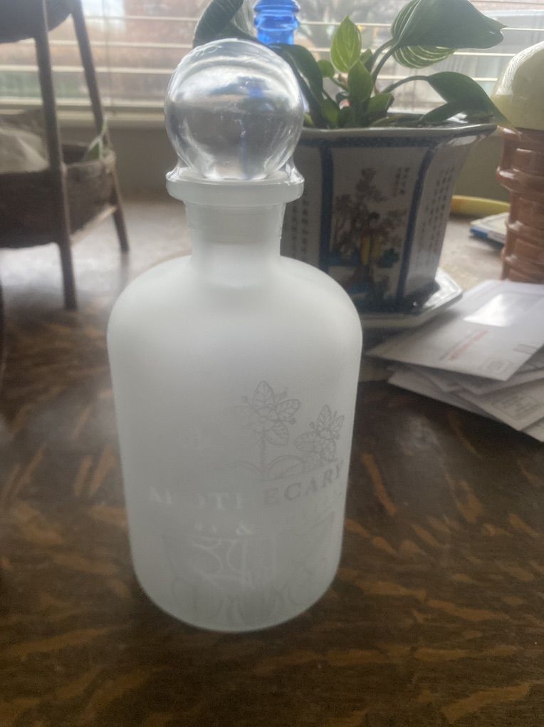 New- Apothecary Decanter Frosted Glass Jar Clear Stopper Never Opened Herbs and Potions approx 32oz?
