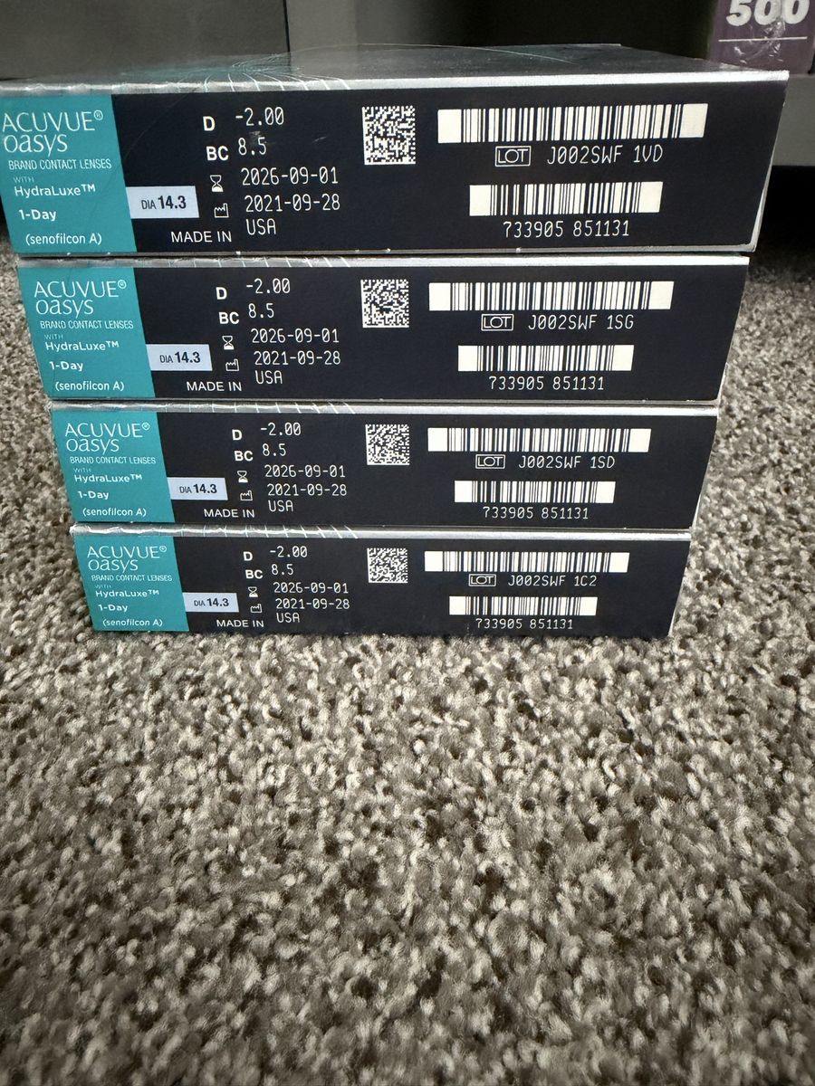 VenmoAcuvue Oasys 1-Day Contact Lenses – 4 Unopened Boxes Brand new, never opened Each box contains 90 daily lenses Prescription: -2.00 (all 4 boxes) Expiration date: 09/01/2026 Originally $100 per box — asking $150 for all 4 boxes Great deal if this is your prescription!