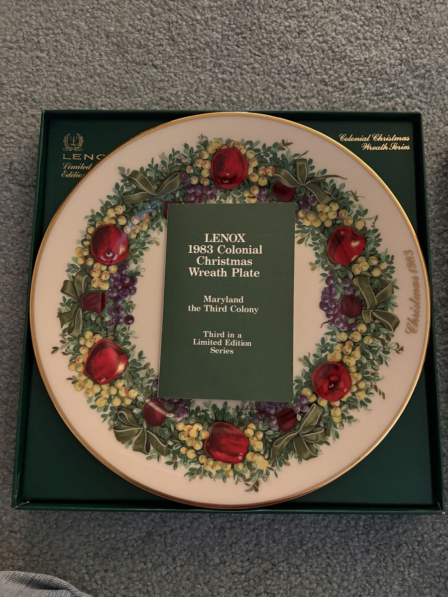 Set of 13 Lenox plates, each plate represents one of the 13 original colonies; one plate was offered only at Christmas time for 13 years from 1981 to 1993; each plate has a wreath design; plates are handcrafted in ivory Lenox; plates are in their original boxes; some of the plates have never been used!