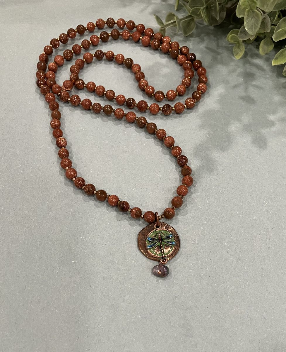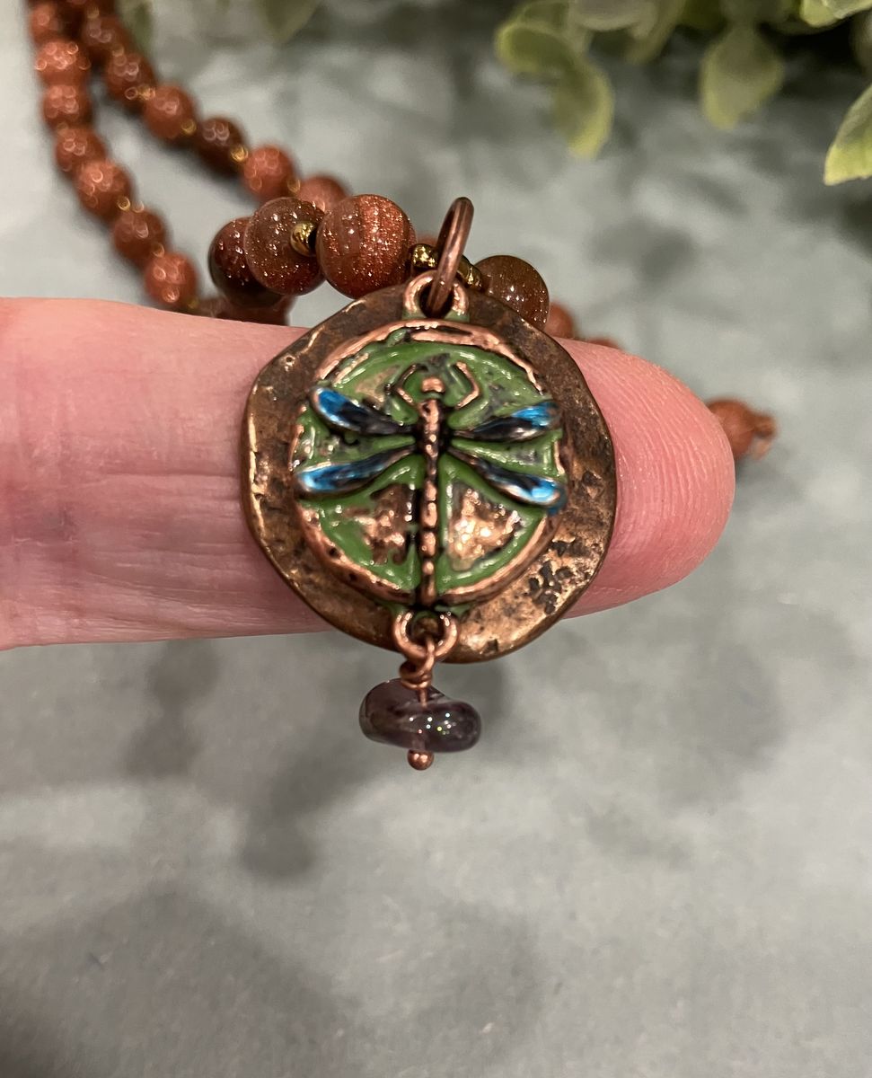 VenmoBeautiful handmade, beaded goldstone, 32 inch long necklace with a dragonfly pendant. Vibrant blue and copper colored pendant measures approximately .75 inches in diameter. No need for a clasp for easy, comfortable wear. GIft box included. Local meetup or can mail with ship fee.
