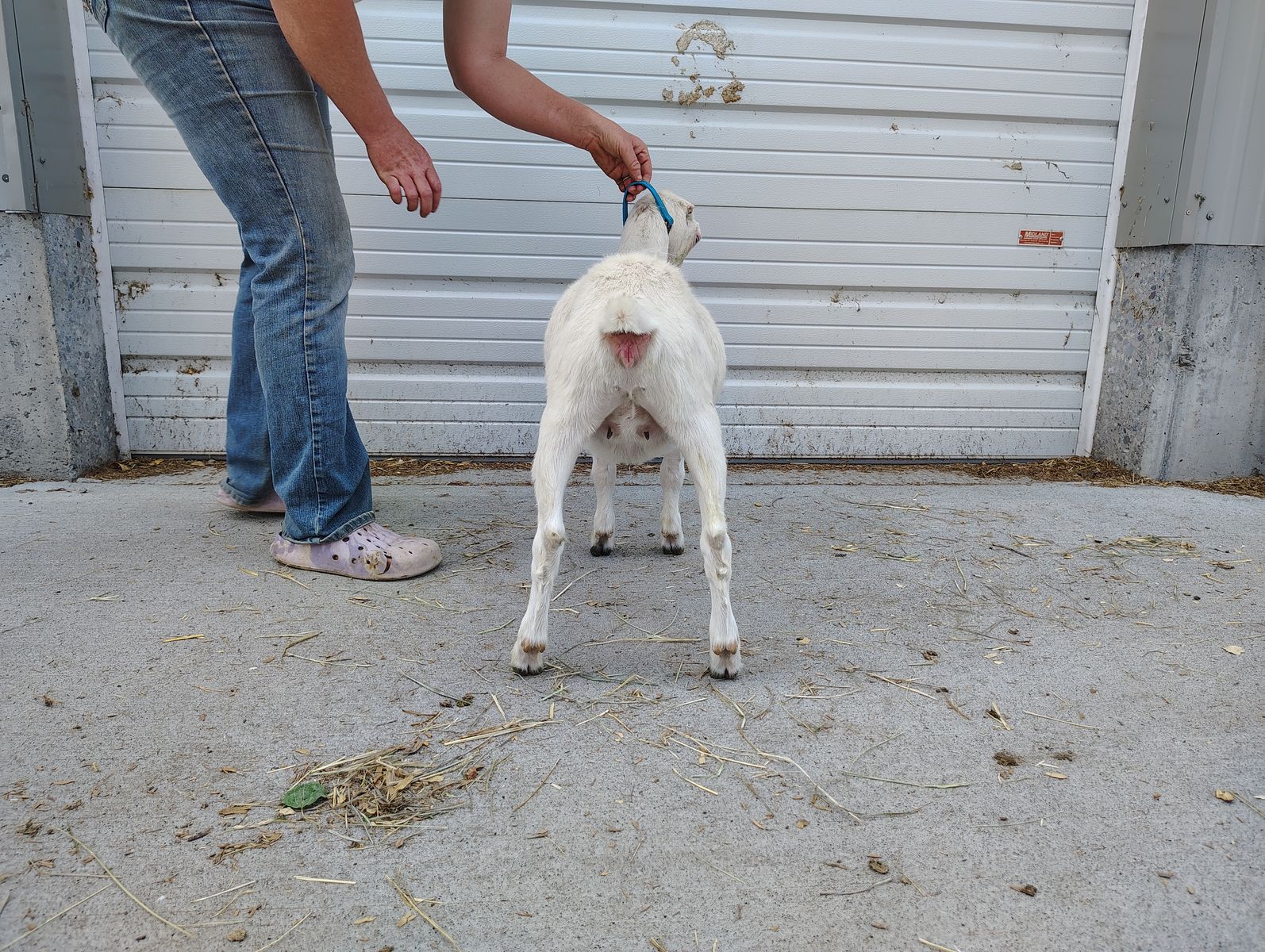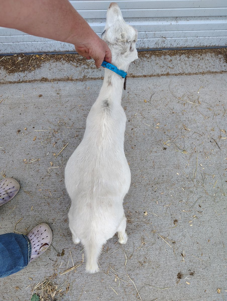Sharpay, a 4th gen mini lamancha, is a gorgeous yearling blue eyed white doe with a little splash of gold. This doe has stellar breeding on top of her flashy looks! Her mom is sired by Sunspring's lines from UT. Both of Sharpay's grandparents on mom's side are finished V-Show Champions from our herd. Sharpay's sire comes from Enchanted Hill lines from Virgina on dad's side and dam goes back to Glimmercroft! $350