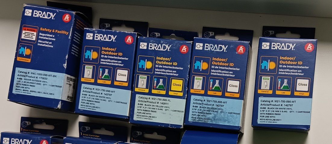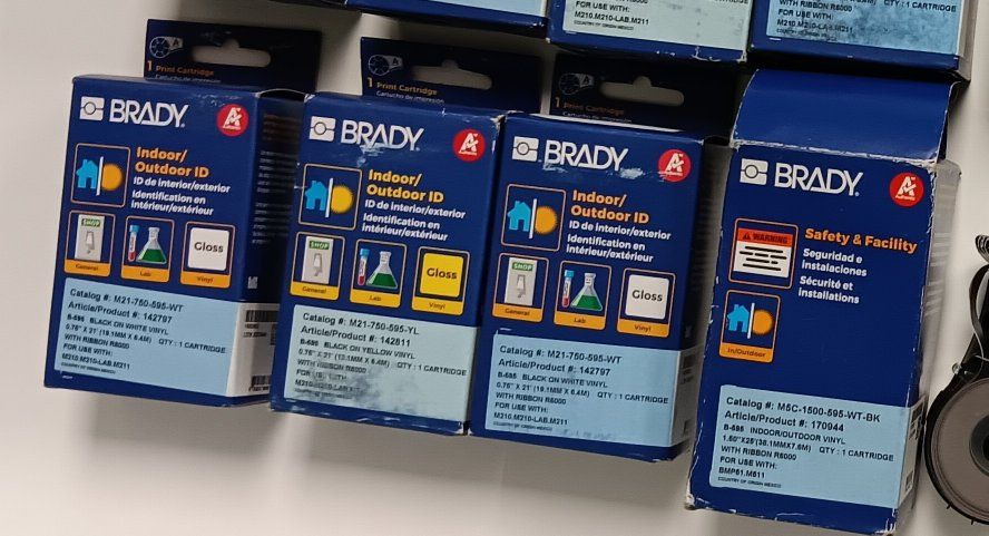 9 unopened and 3 partially used Brady brand label cartridges. Pulled from storage, not tested but the 9 unopened ones are still sealed in their plastic bags inside the boxes.