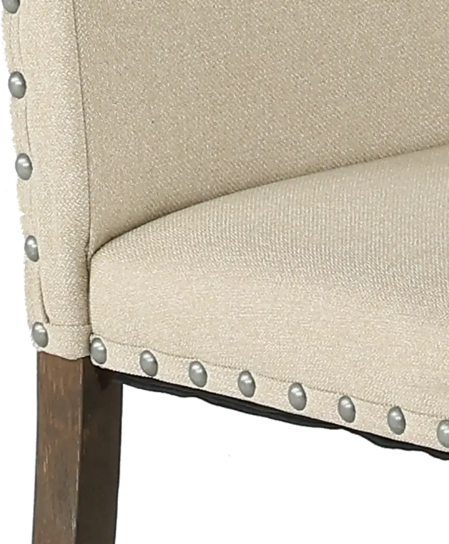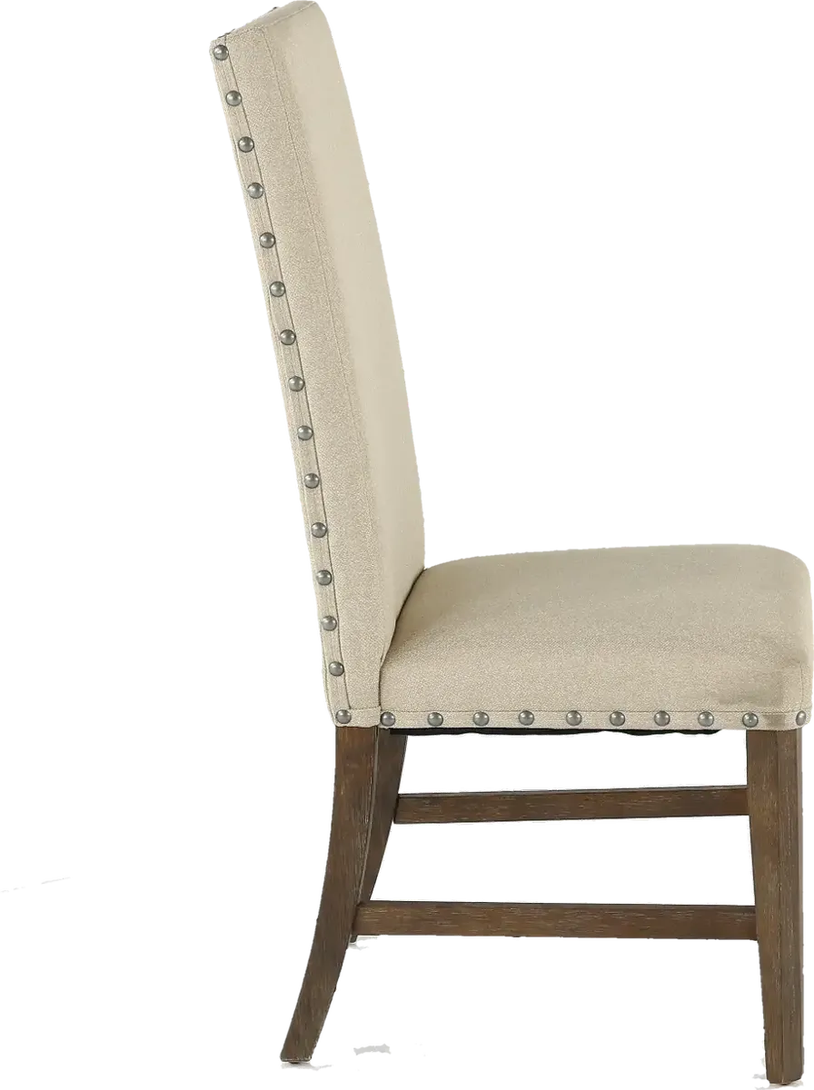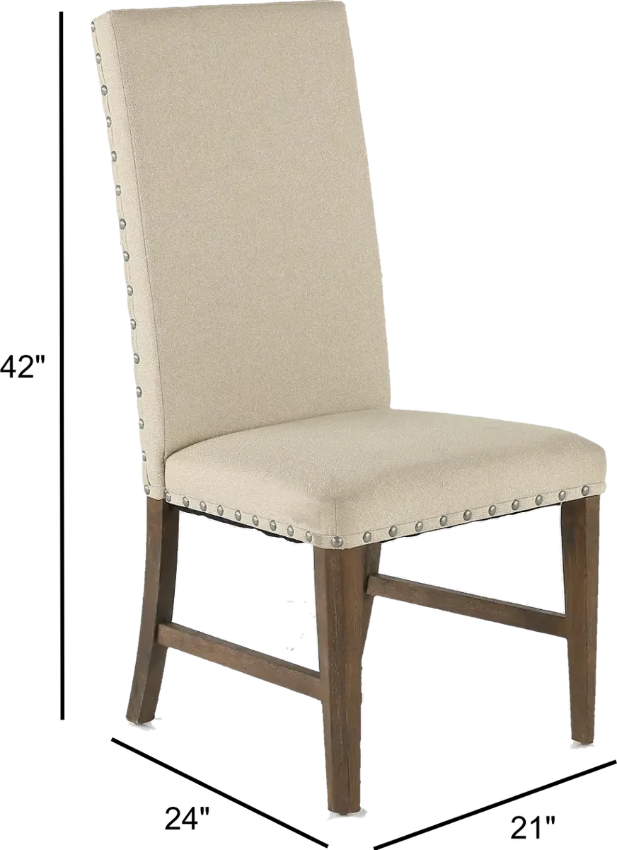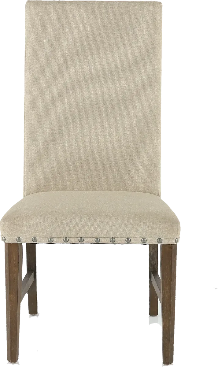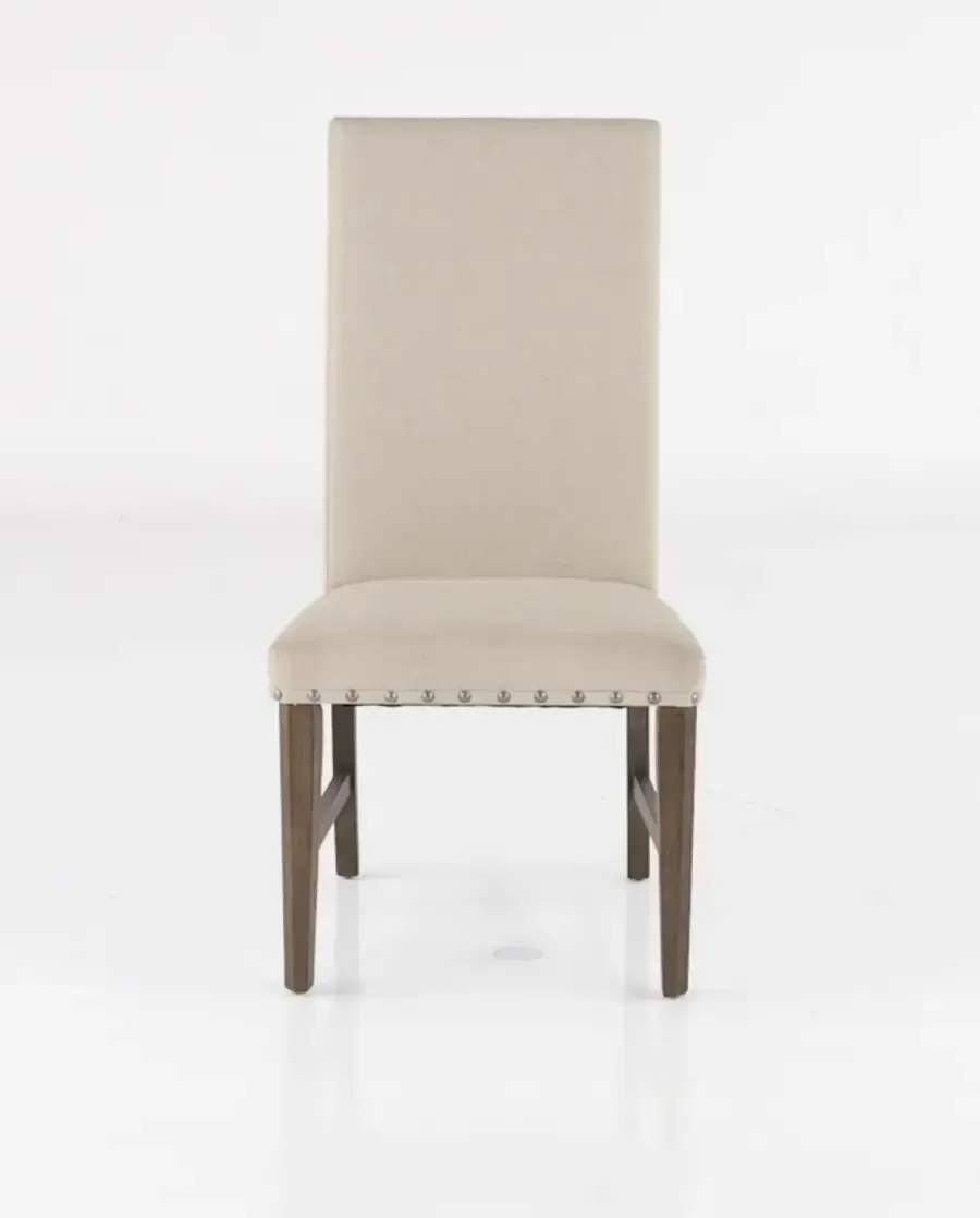 Sleek lines and a simplistic design make a statement with this lovely upholstered dining chair. The gray upholstery and brown finish complement each other nicely and is set off by the large nail-head trim. You'll want to fill every space around your table with this elegant chair.