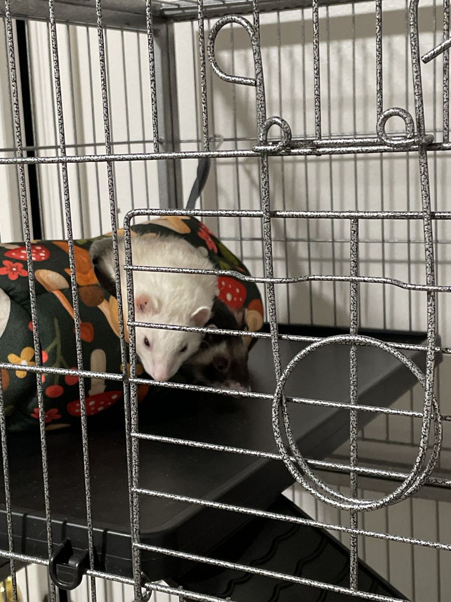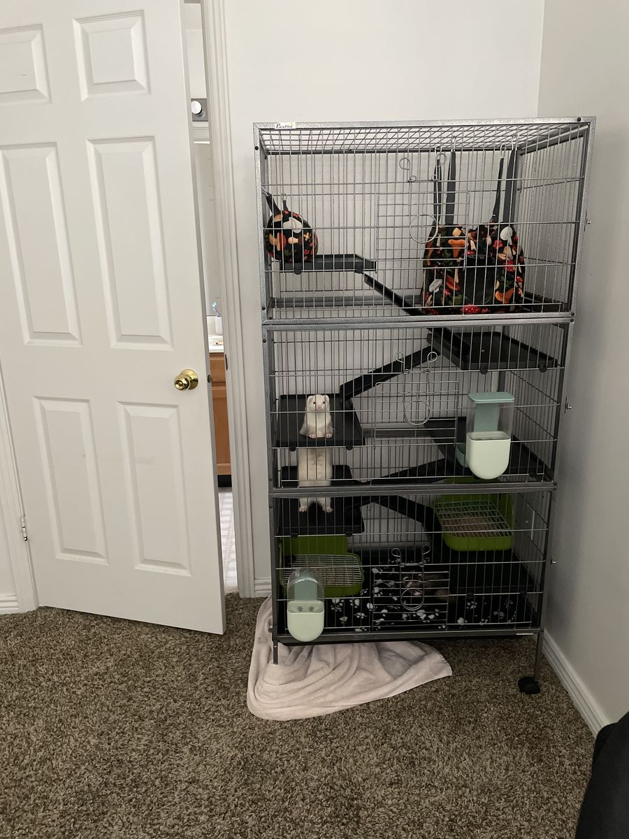 VenmoI need to find a new home for my bonded ferrets before moving! They’re so sweet and love to play! The white one is a female, Gouda, and is almost one year old. She’s very spunky and has tons of energy! She loves to explore and will get into anything! She also loves to snuggle and will give kisses when near your face! The darker one is a male, Rocket, and is around two years old. He is fixed. He is more mellow but still can get riled up especially when playing with Gouda! He loves to chase you around and play with his toys! He likes to playfully nip at your socks and try to steal them from you! Both ferrets are potty trained and use their litter boxes inside the cage, with an occasional accident right outside the litter box if it’s full. They’re descented too. They come with their cage that’s around 6ft tall, a box of toys, a pet carrier, food, litter, treats, harnesses, hammocks, everything needed for their care. They love to play any chance they can get! They’re such sweethearts!! Good around kids and other pets!!