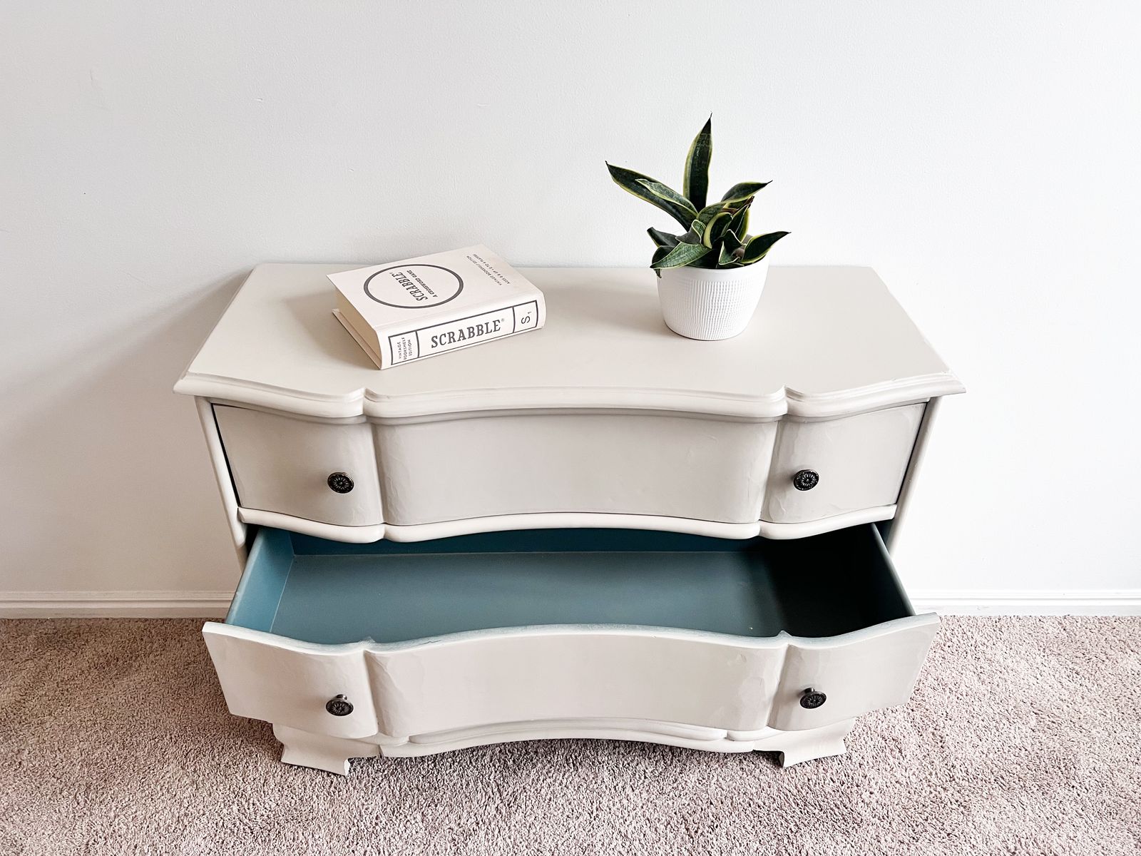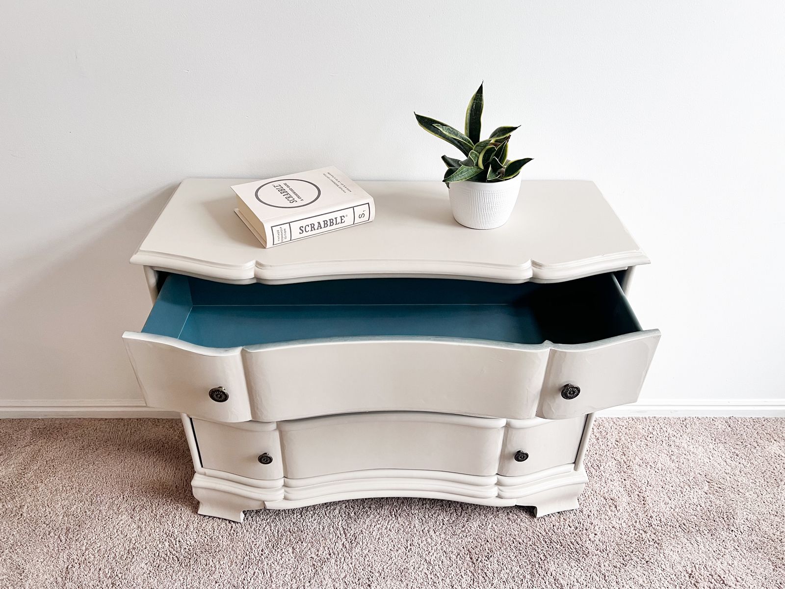 PayPalCream vintage nightstands with 3 spacious drawers, brass knobs, and a gorgeous teal-toned interior in each drawer, perfect as bedside tables or mini dressers.