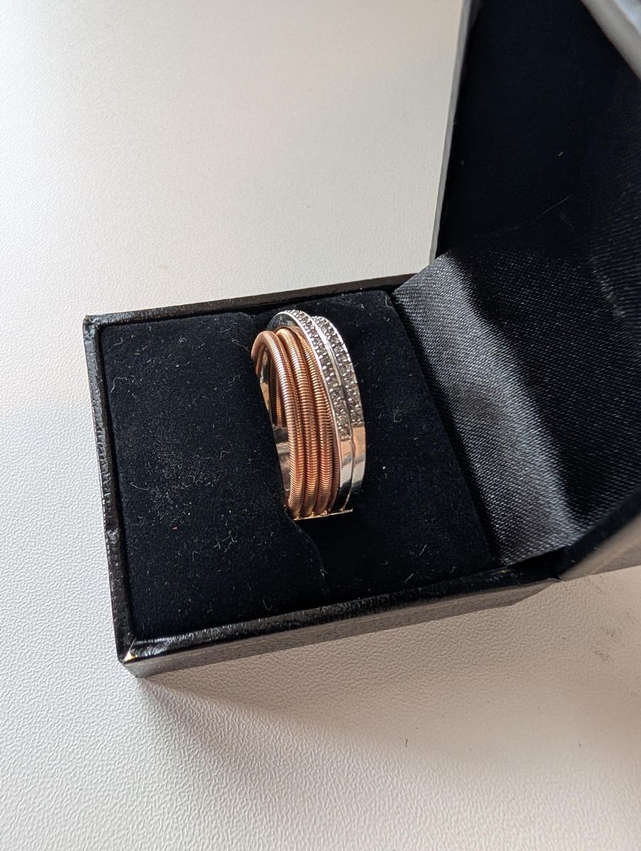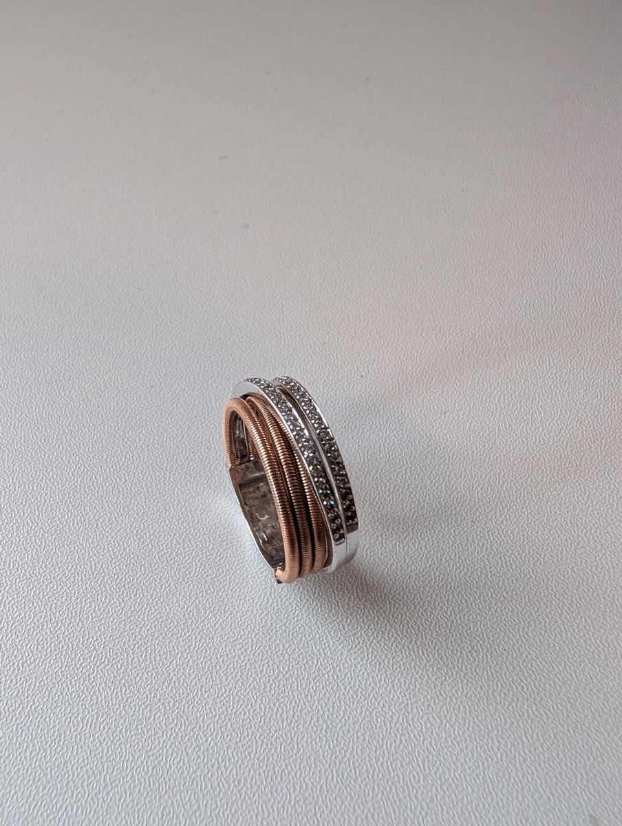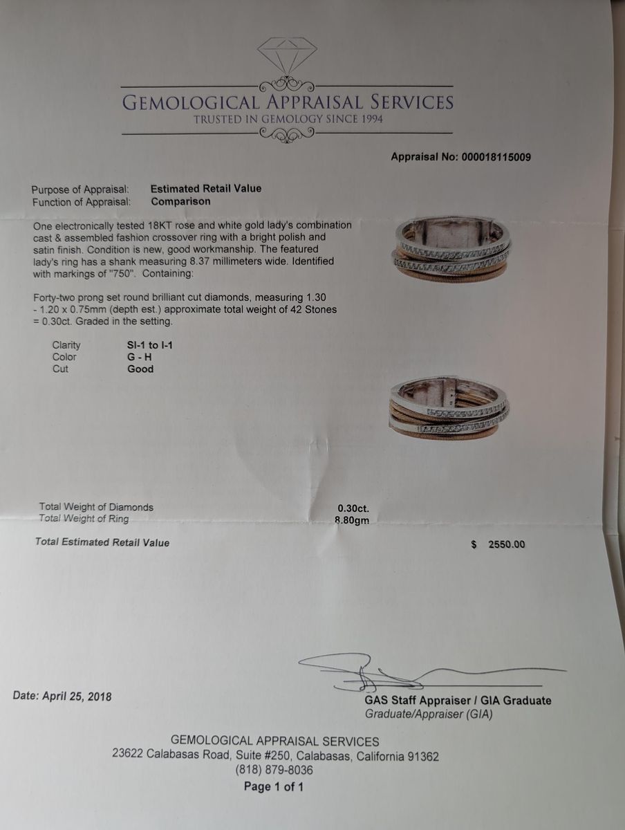 ZellePrice is firm. One electronically tested 18KT rose and white gold lady's combination cast & assembled fashion crossover ring with a bright polish and satin finish. Condition is new, good workmanship. The featured lady's ring has a shank measuring 8.37 millimeters wide. Identified with markings of 750.