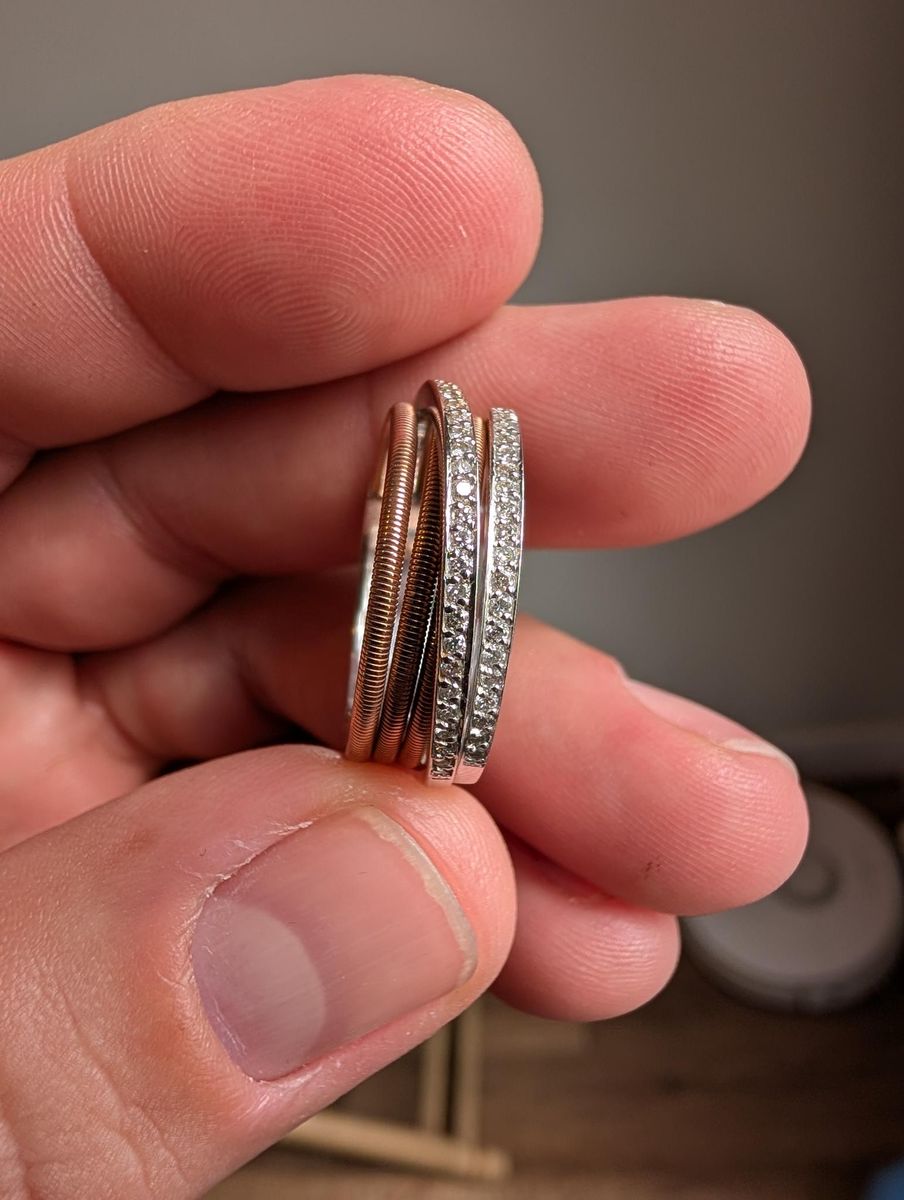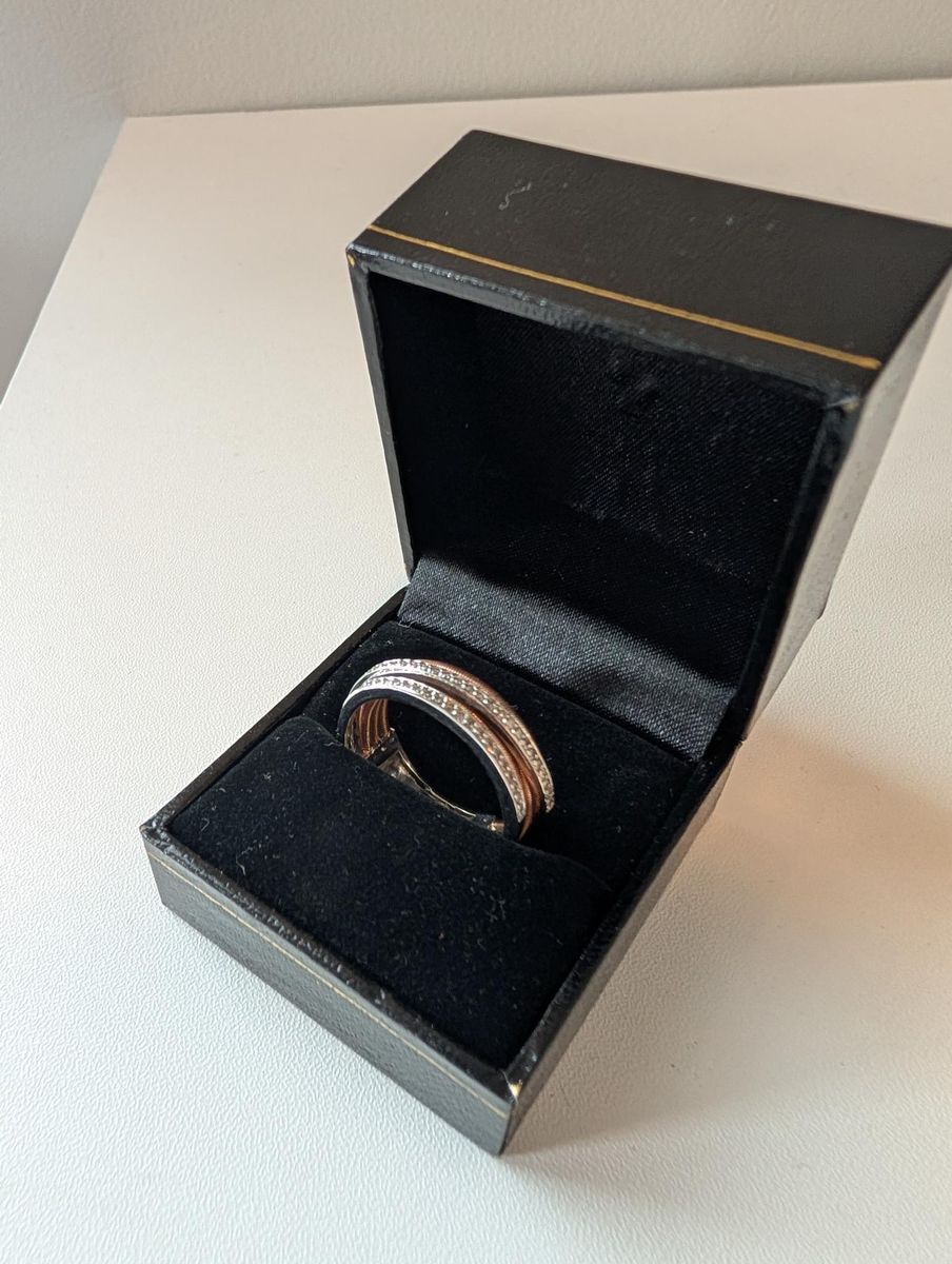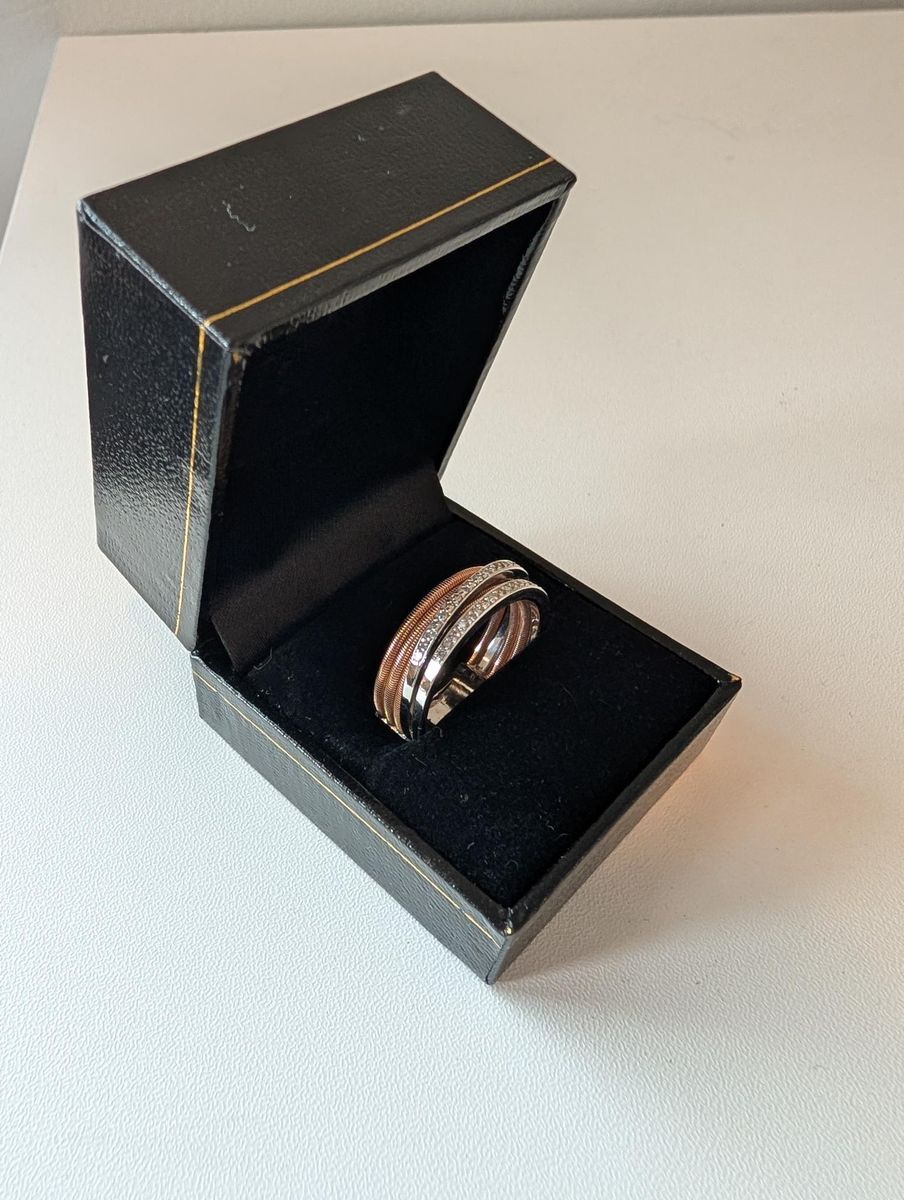 ZellePrice is firm. One electronically tested 18KT rose and white gold lady's combination cast & assembled fashion crossover ring with a bright polish and satin finish. Condition is new, good workmanship. The featured lady's ring has a shank measuring 8.37 millimeters wide. Identified with markings of 750.