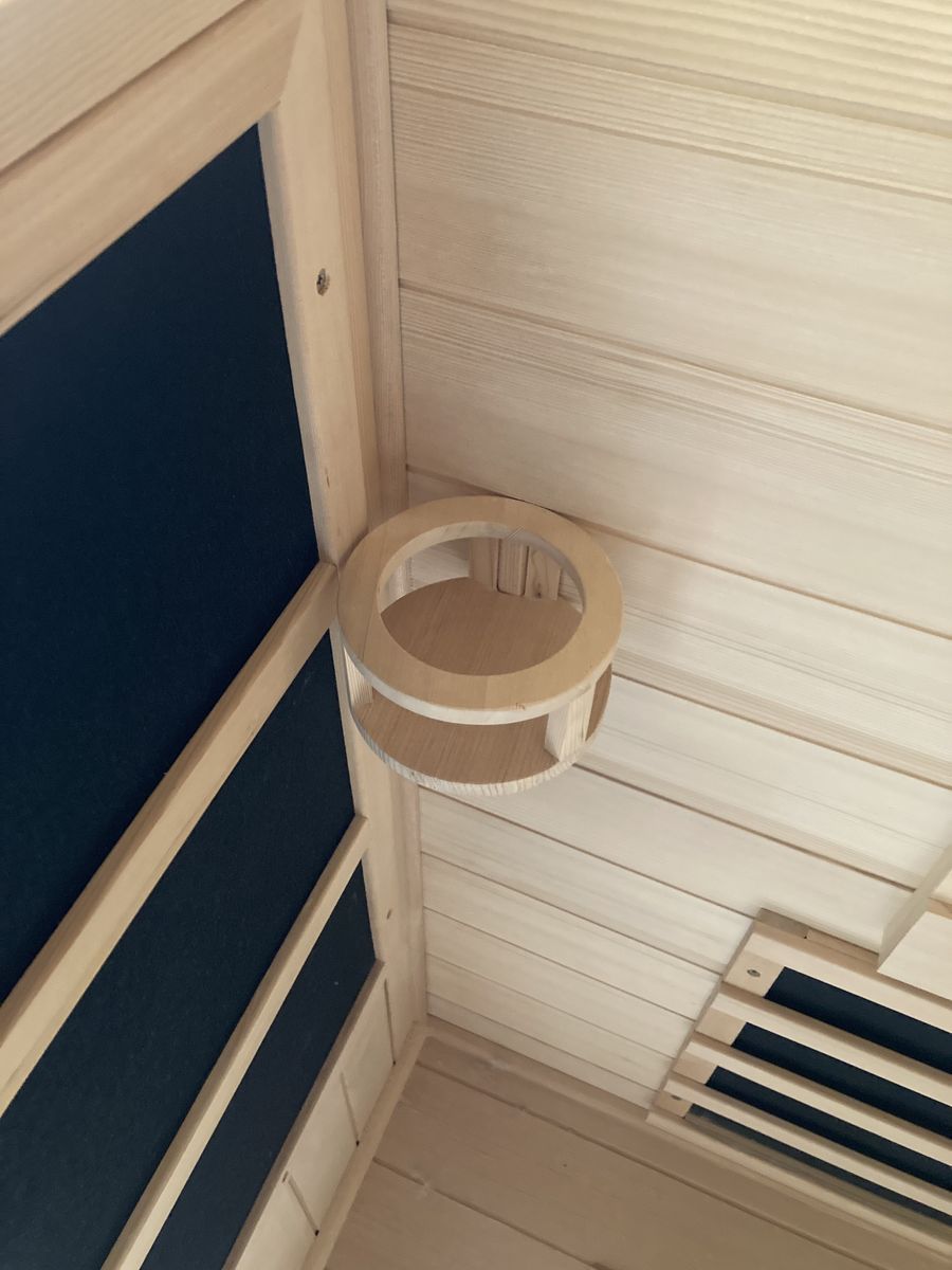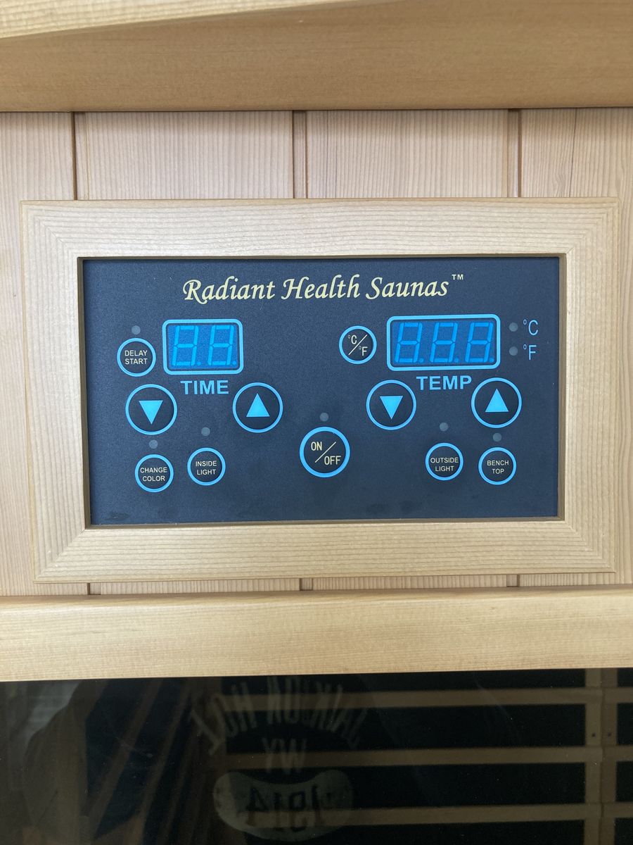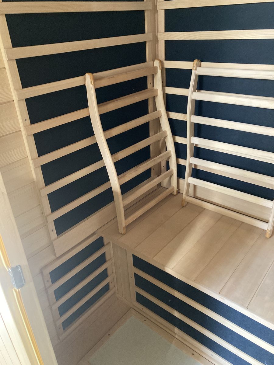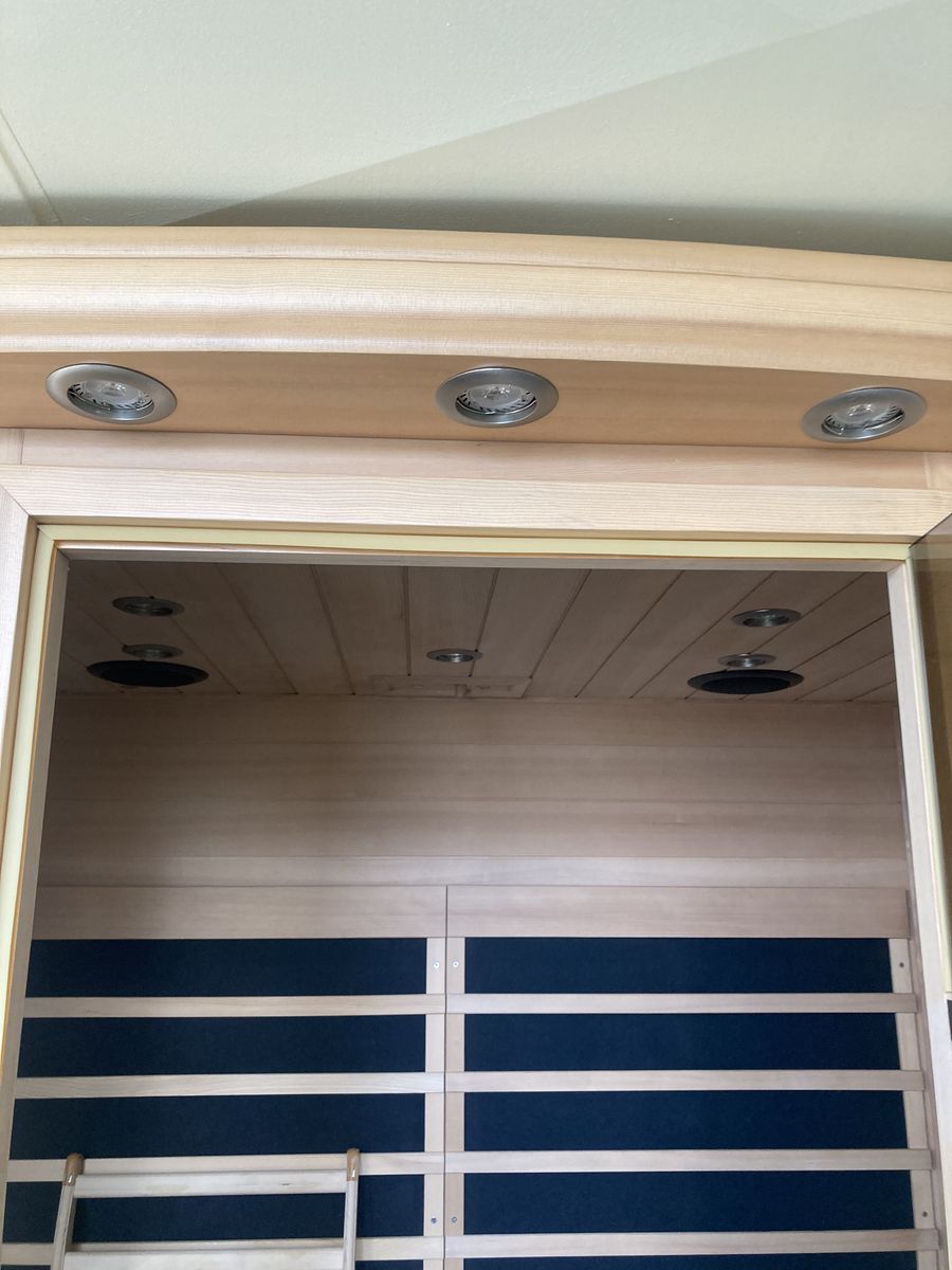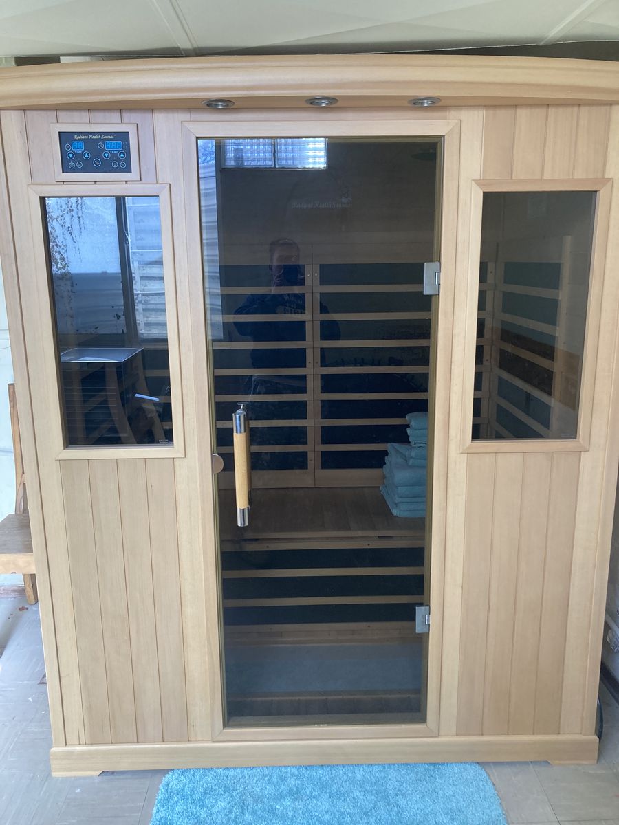 100% Canadian hemlock wood Infrared Sauna. This is a 2.5 person sauna that has very little use. 2 adults can sit in this very comfortably along with a child. It uses carbon fiber heaters to heat the space. The dimensions are 44” D x 65” W x 77” H (48” D with the overhang). It comes with Alpine stereo with hard wired USB and auxiliary port for compatibility with iPad, laptop and mobile phones as well as CD/AM/FM player. Spotlights and mood lighting. 2 interior cup holders. 2 Canadian hemlock backrests. It requires a 20 amp/120 volt outlet. It has a 6 ft cord. It has a control panel on both the inside and outside of the sauna so you can turn it on without going inside and you can control it while inside the sauna. It has a heated floor. If you are interested in the sauna, reach out and I can send you the brochure on it so you can see all the features and testing that has been done on it. Serious inquiries only.