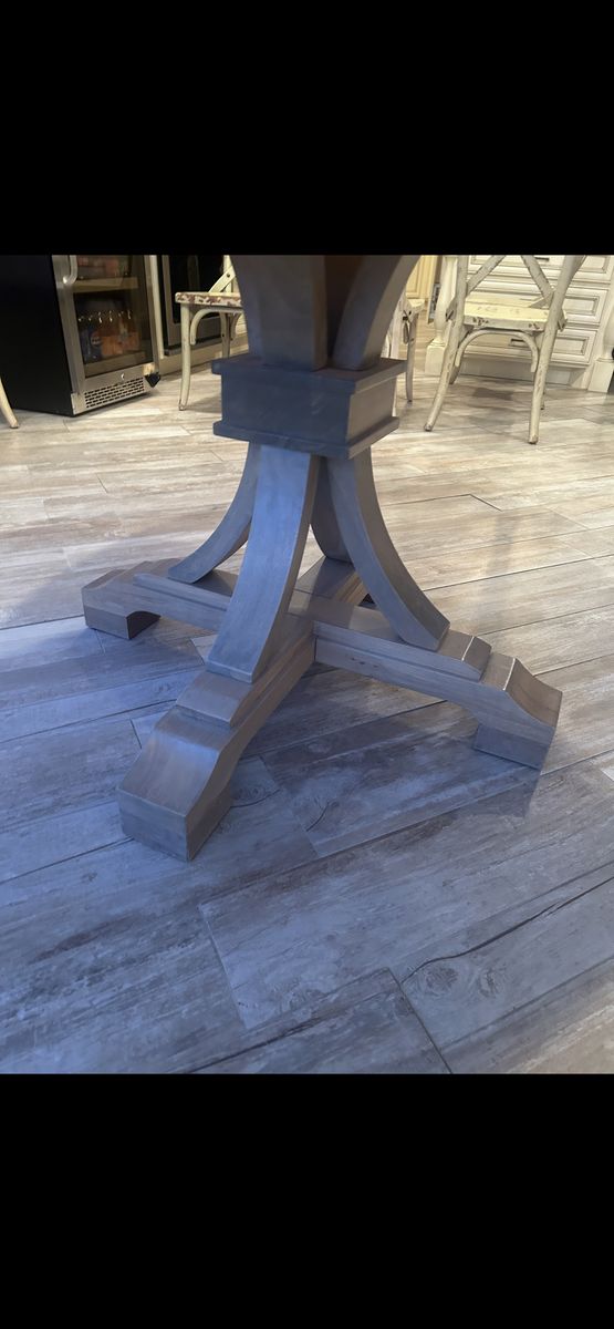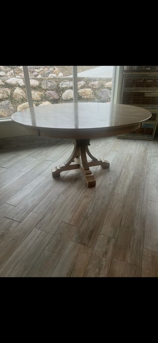This is my round oak wood kitchen table. It’s 60 inches round the entire way. It’s 34 inches tall great table no scratches or dents in great condition. Asking 450$ OBO 435-250-0023