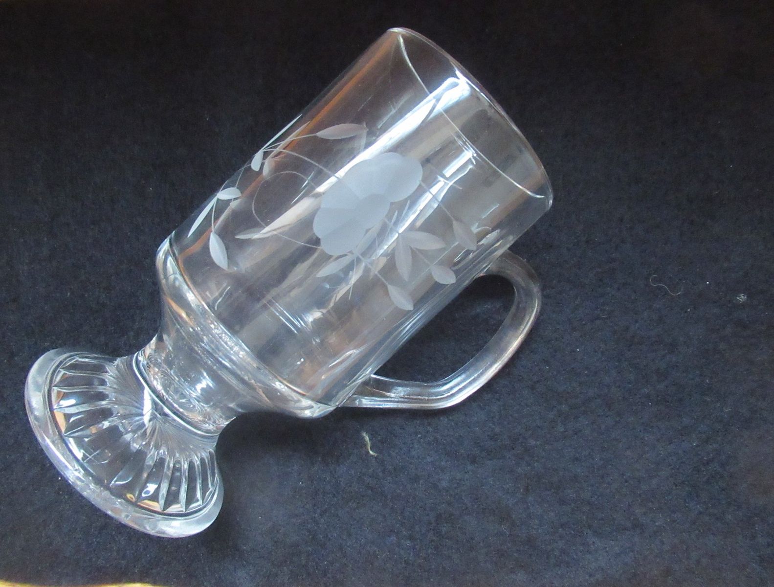VenmoThese are from the Heritage Collection. Made of Tempered Crystal with a pedestal base and a handle, featuring an etched floral pattern. These mugs are designed for serving hot beverages. Vintage used but in like new condition. Selling on Etsy for $22/mug or Ebay for $9 per mug.
