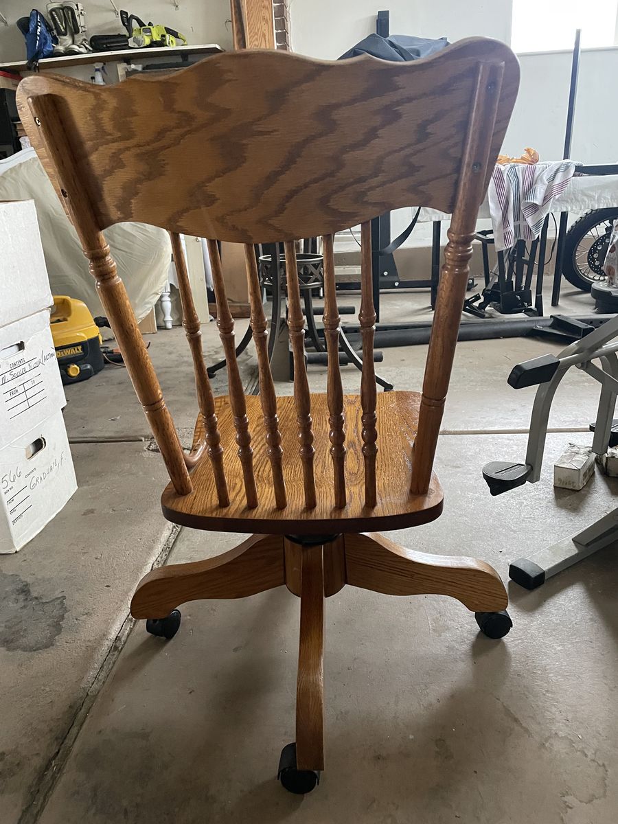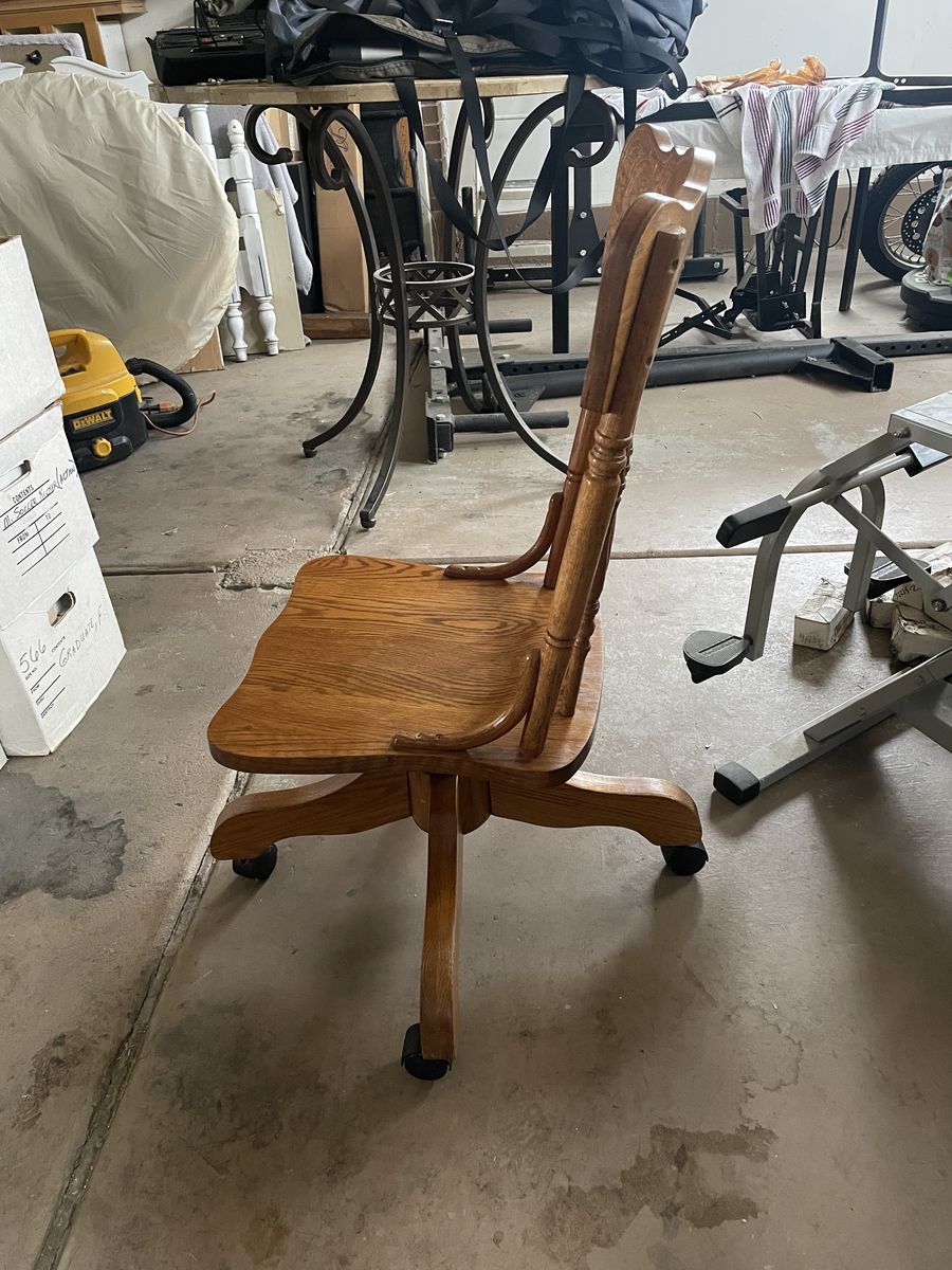VenmoSolid wood chair with wheels.