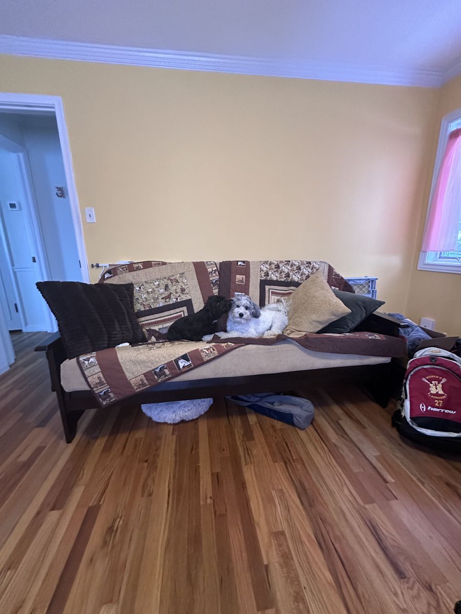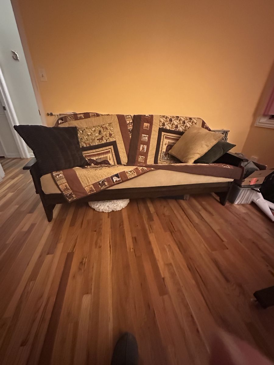 Futon with full size mattress. Minimal wear and in great condition. Quilts, pillows and puppies not included.