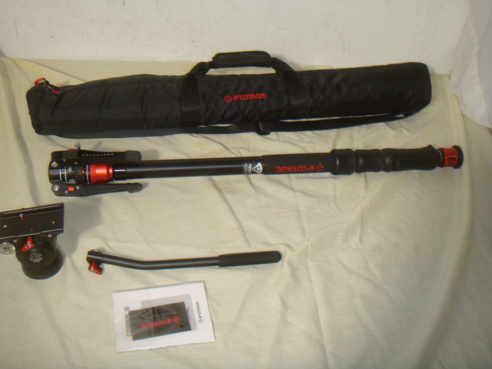 NEW, OPEN BOX iFOOTAGE COBRA 3 STRIKE MONOPOD A150S-III WITH KOMODO K5S FLUID HEAD/HANDLE & CASE. This is a new monopod that has never been used but without the original box/packaging. There are a few minor surface marks from being out of the original packaging or rubbing of the items inside the bag, but nothing very notable and otherwise it's in new condition and everything works perfectly. We'll do our best to show everything in the photos. It is the tripod with K5S fluid head, handle, and case. It does not include the camera mounting plate, so you'll need one of those (we believe it's an arca/swiss type, but check with iFootage to be sure). It comes with everything shown. These are normally $450. This is your chance to save big-time so don't miss out!!