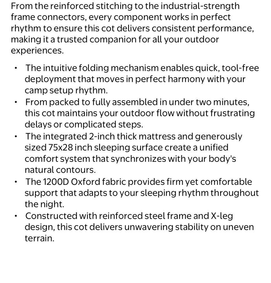 This heavy duty camp bed has a sturdy reinforced steel frame with X-leg design, and reinforced stitching in Oxford fabric to hold up to 500 lb., easy folding and quick set up.