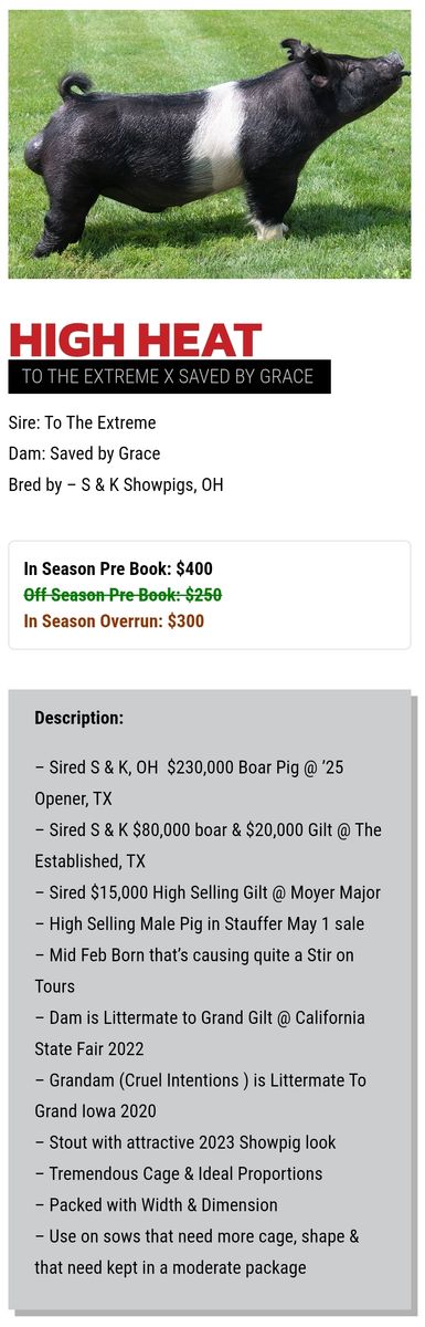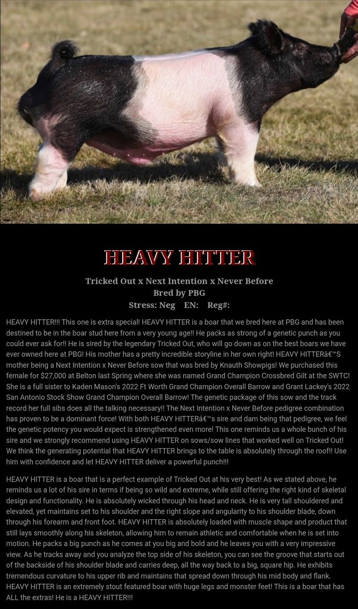 Hot-n-Heavy is our newest boar. His sire High Heat who has sired a lot of champions, and his dam is Heavy Hitter who has definately left his mark in the showpig world, and goes back to Next Intention and Never Before. Hot-n-Heavy is moderate framed, thick boned, very expressive, with a neat profile. With his genetics he will should add a lot of showability. He is structurally sound, and moves out great. We are excited to see the babies from Hot-n-Heavy.