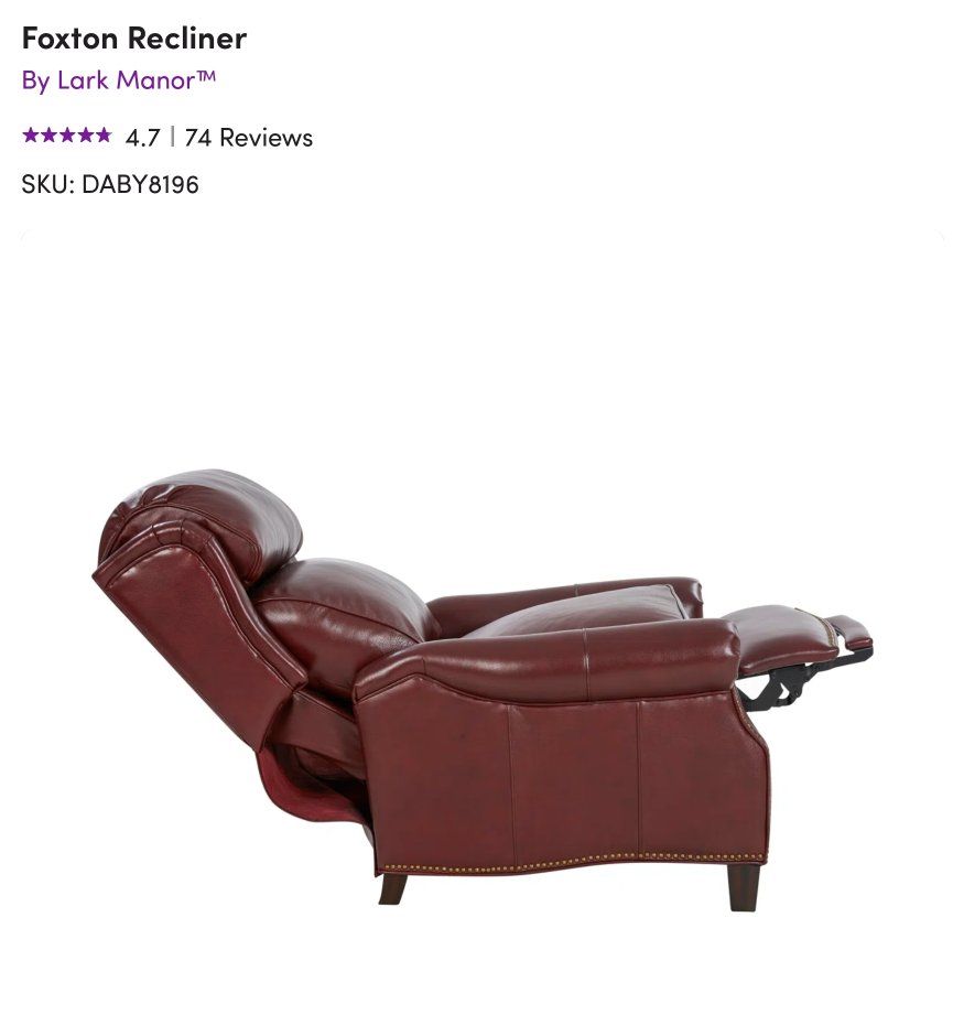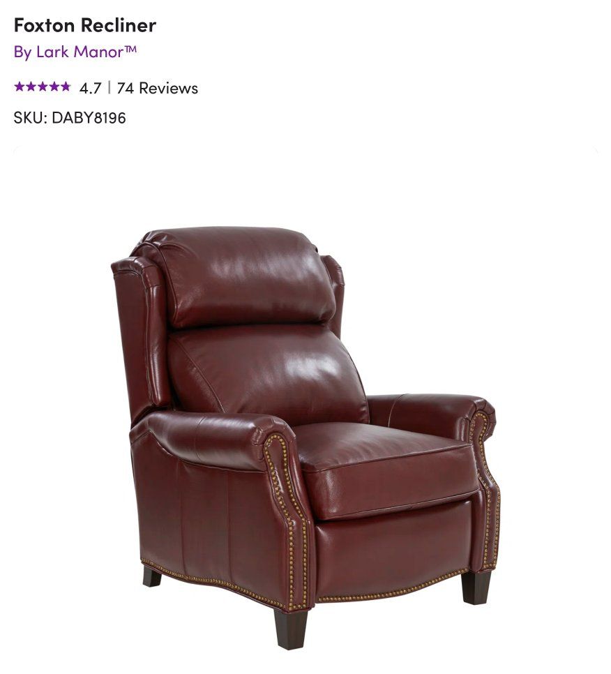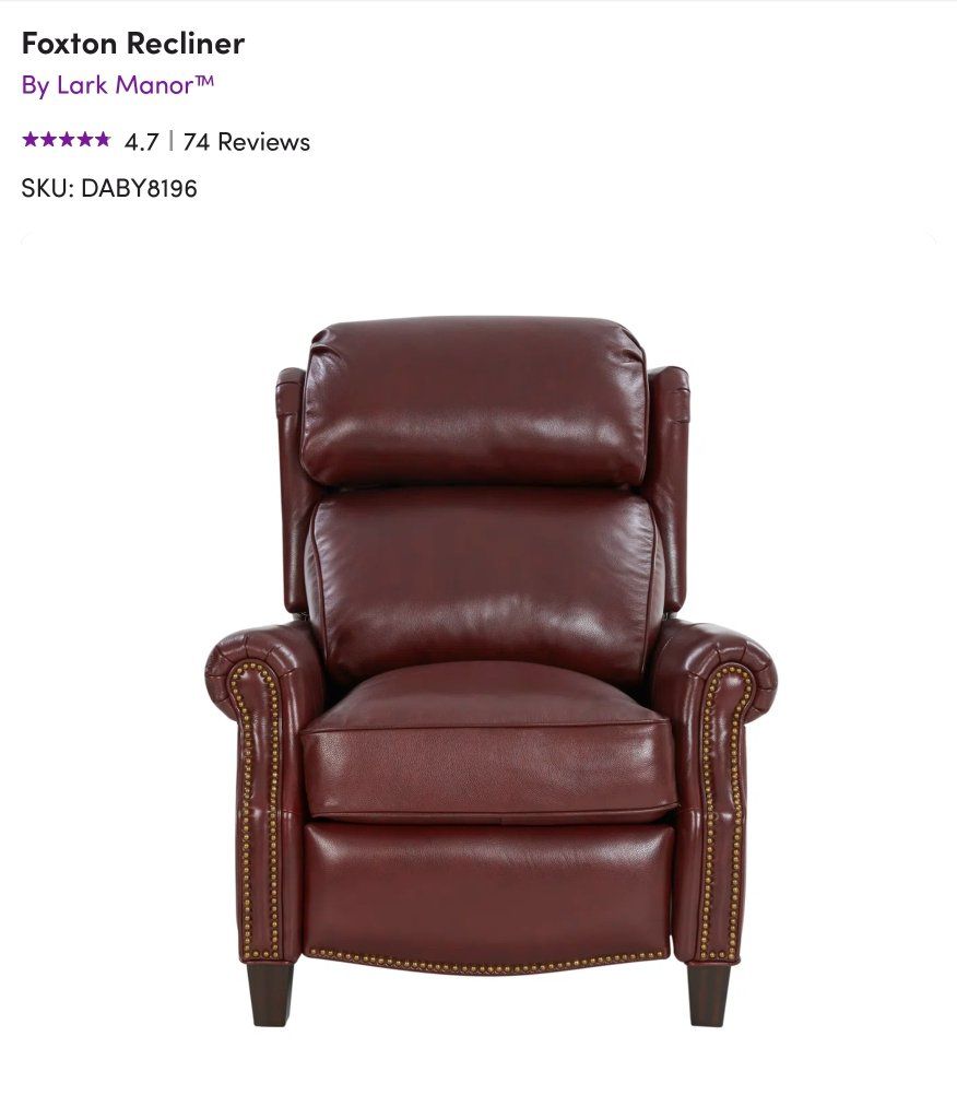To contact me concerning this item text or email. 208-251-4511 likedisney48@gmail.com Classic wing back lounge leather recliner, 3 ways push thru the arms mechanism with foot rest extention. Kneed back round arms with copper-finished nail head trim. Shaped lower side rails and footrest. Merlot finished tapered wood legs.