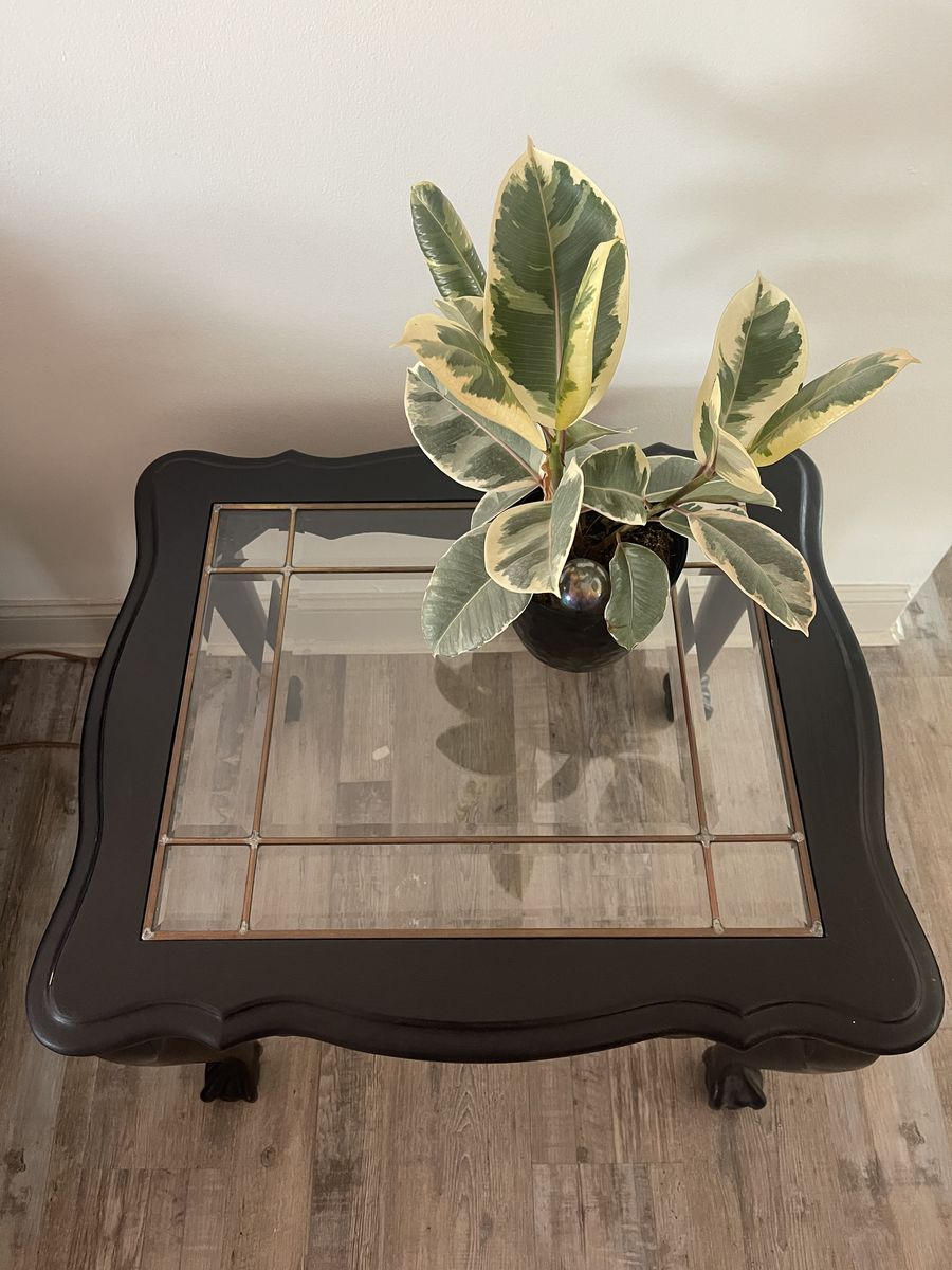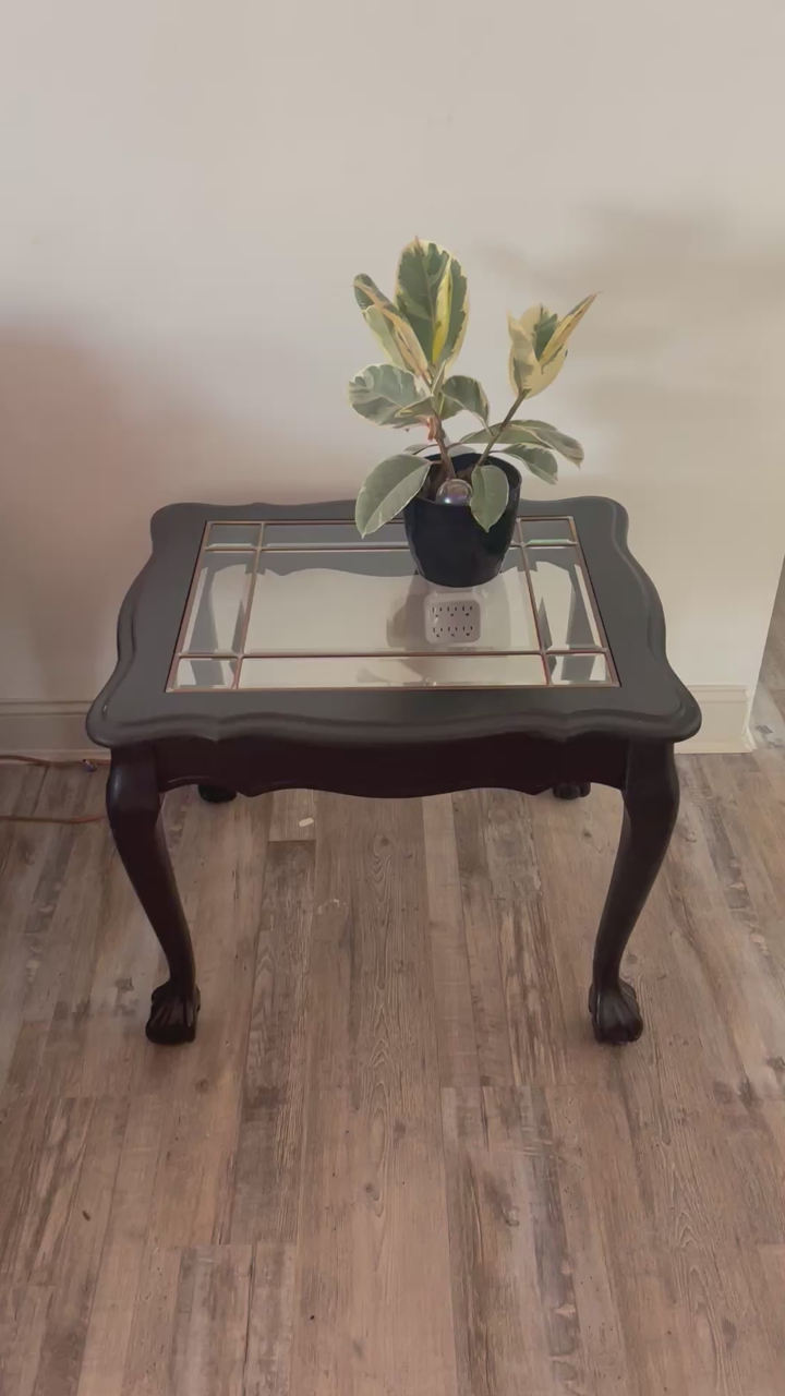 Solid wood (very sturdy and heavy) Glass top in excellent condition – no scratches Elegant Queen Anne style legs Works as an end table, side table, or statement accent piece