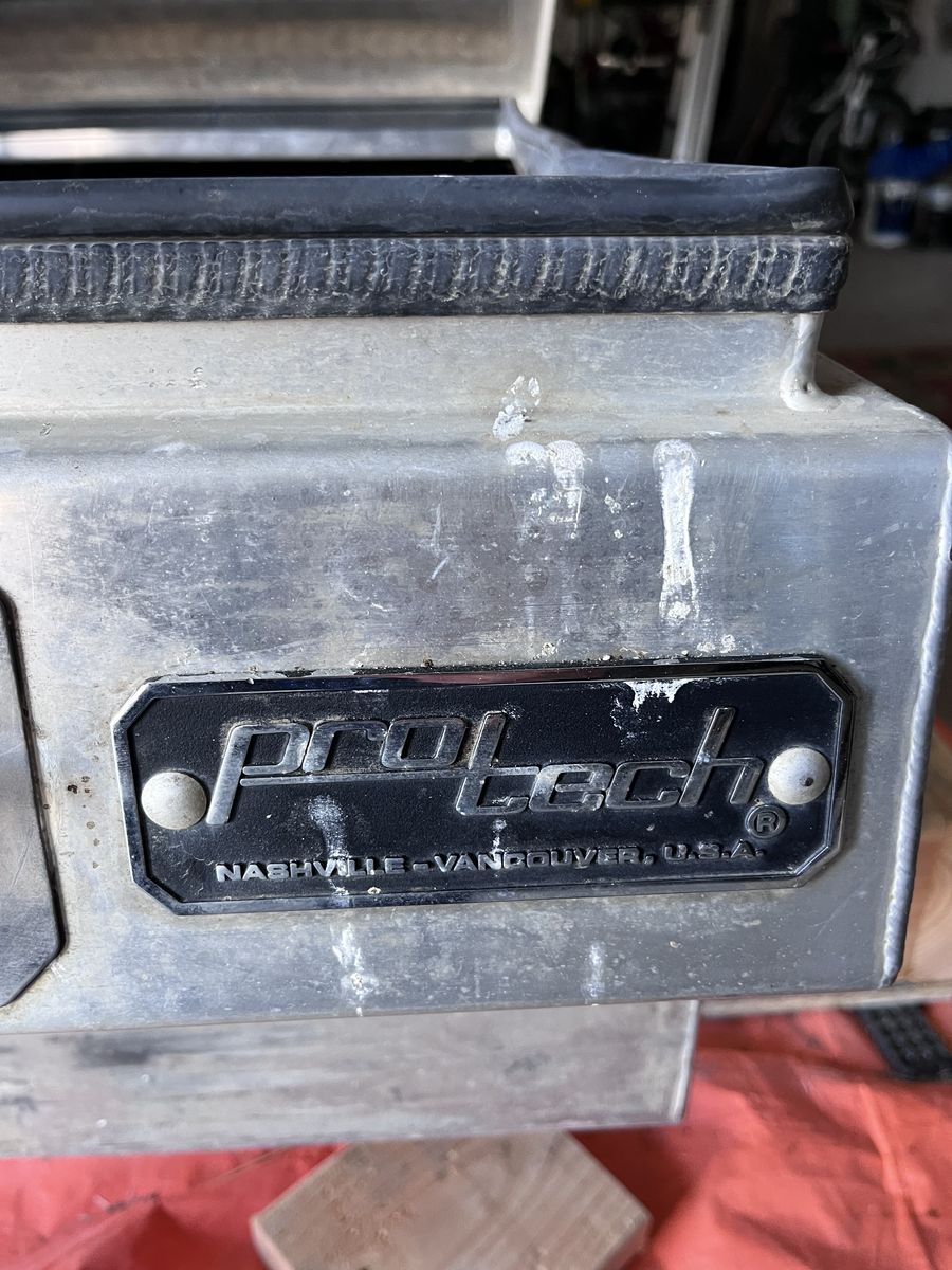 Protech toolbox, does have a dent on the left side but door opens and closes perfectly. Have key as well, these are solid tool boxes that run for over 1k brand new.