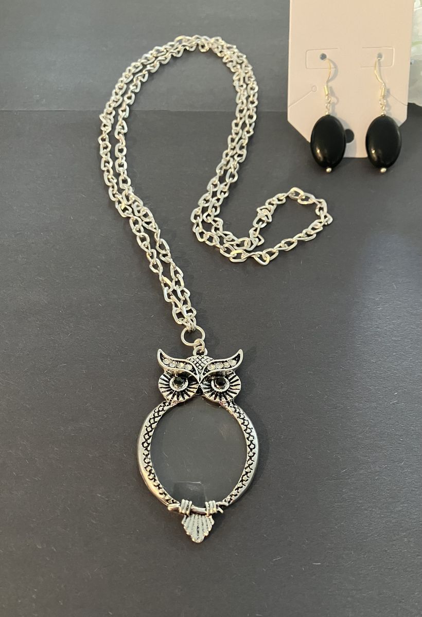 Venmo29 inch, beautiful silver plated chain with a cute silver colored owl pendant, embellished with clear and black rhinestones. Also has a magnifying glass in the body of the owl. Lovely black beaded, dangle earrings are approximately .75 inches long with silver plated earwires. No need for a clasp. Gift box included. Local meetup or can mail with a ship fee.