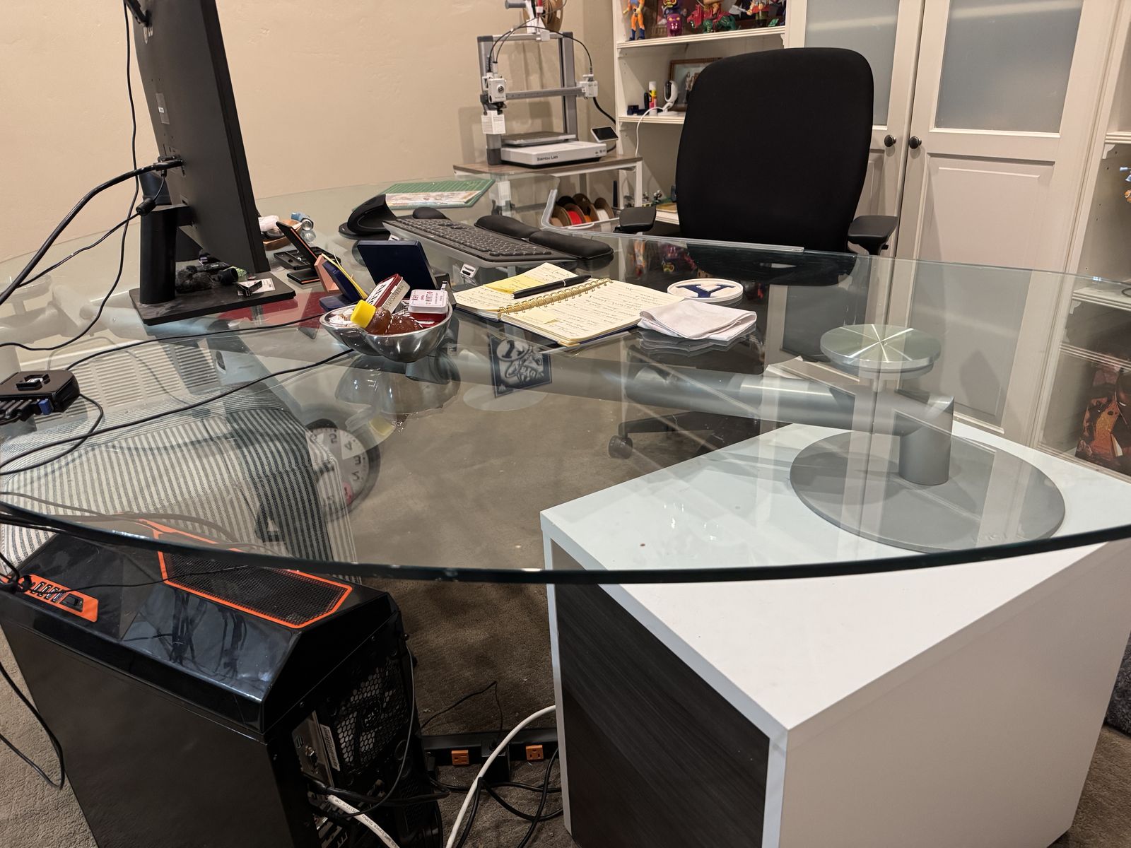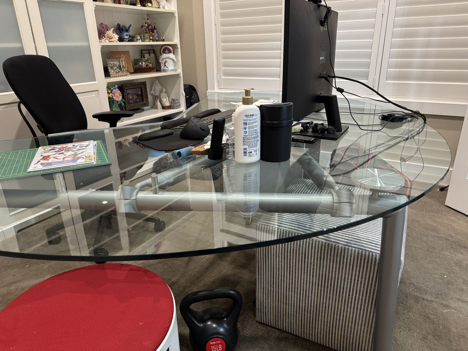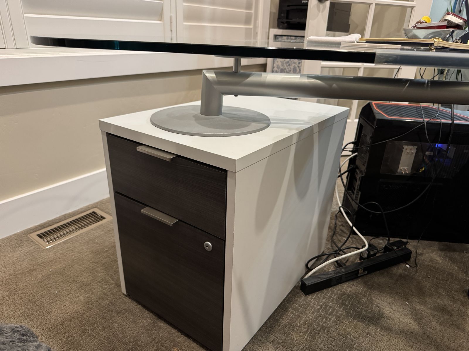 VenmoGlass Top executive style desk. First photo is a stock image and then you can see the real photos. Very high quality and extremely nice executive level desk. I’m not 100% on the brand but it is similar to Laporta Italian designed desk.