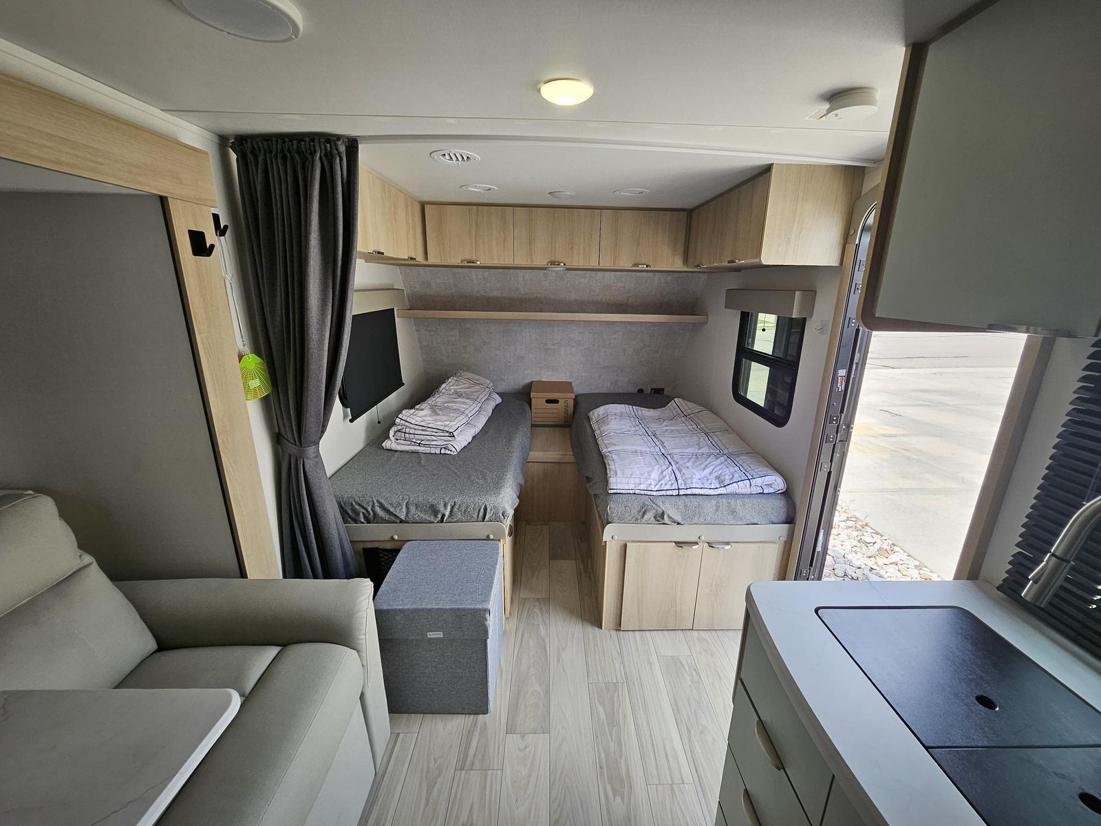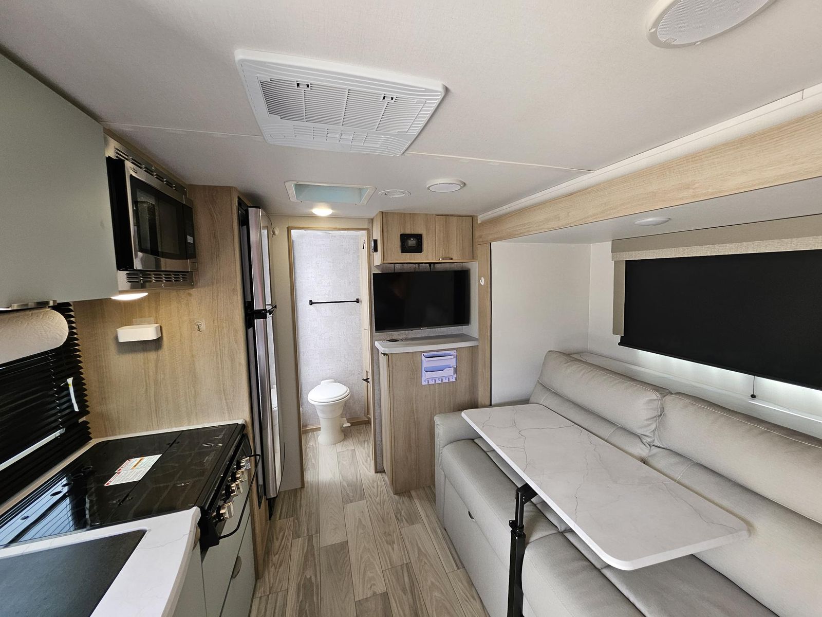 This one owner and only once used unit needs a new home. Would be a great choice for an RV first timer or for someone downsizing. Lots of flexibility with 32” x 74” twin beds up front that can be converted to a 74x82 king. The twin mattresses are brand new custom upgrades with fitted bedding and comforters. The single slide has a couch with an adjustable and removable table. With the table removed it pulls into extra sleeping space. The full rear bathroom has a 36x36 shower and convenient wardrobe. The kitchen has a microwave/convection oven, cook top and 12-volt refrigerator/freezer. Entertainment includes a smart TV and a JBL indoor/outdoor speaker system. There are several USB ports and a wireless charger. The water heater is a 6-gallon electric/gas. The HVAC is a ducted 12,500 btu unit. Shore power is standard 30 amp when hooked up and a roof mounted 200-watt solar panel when off grid. Outside there is a full-size power awning, four corner power levelers and plenty of basement storage. There is also a gas hook up for a grill or other LP devices. Size specs are a length of 22 ft, a dry weight of 4100 lbs and a GVR of 5500 lbs. Tows easily with the equalizer hitch that we are including.