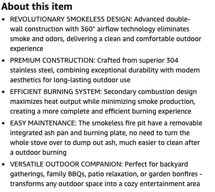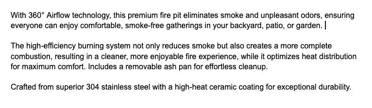 You'll have great fires without smoke blowing in your face, while you enjoy comfortable heat from this attractive fire pit. Quality construction, efficient burning, and easy to clean.