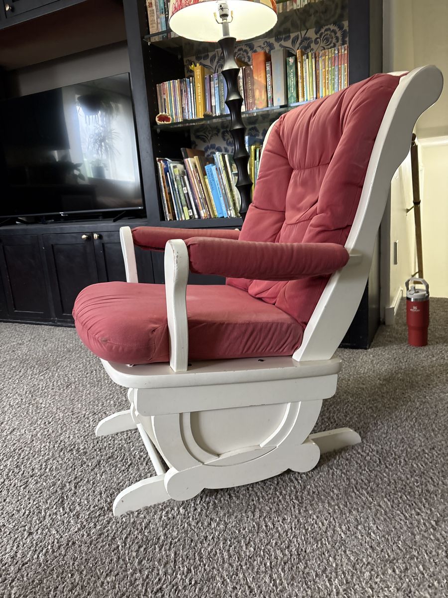 Red and white, well loved but still has a lot of life in it. Makes a little squeak when Rocking.