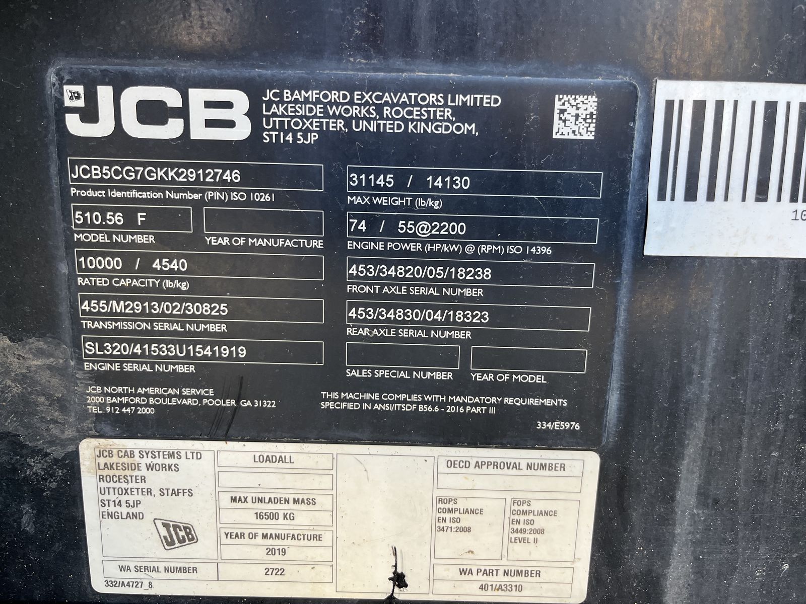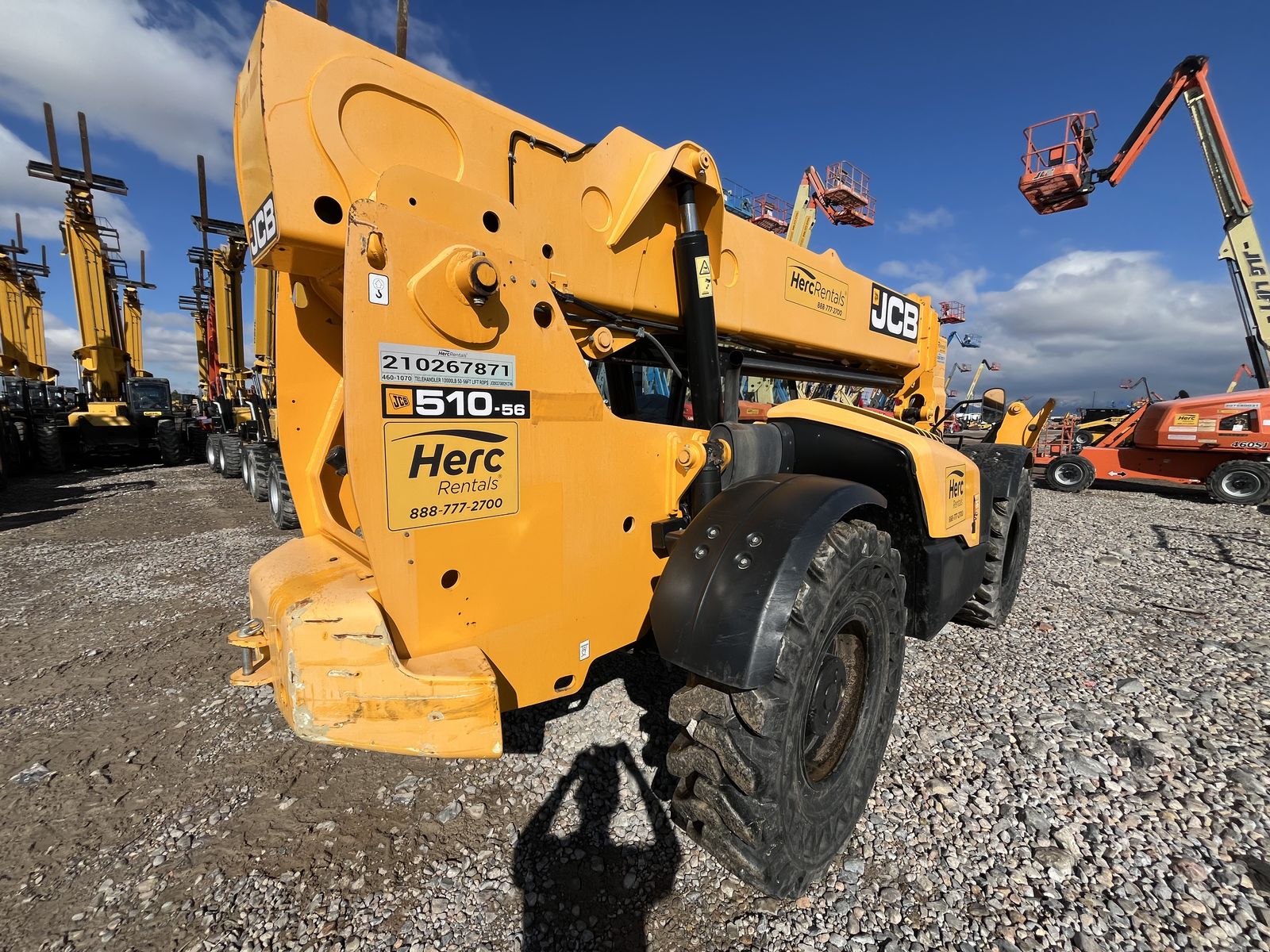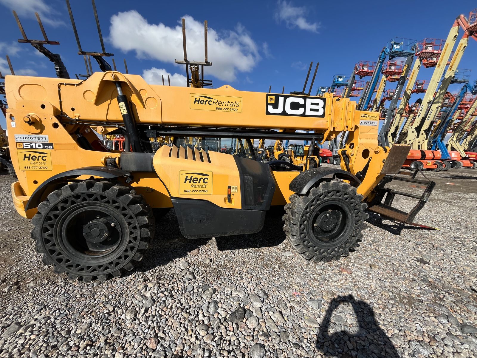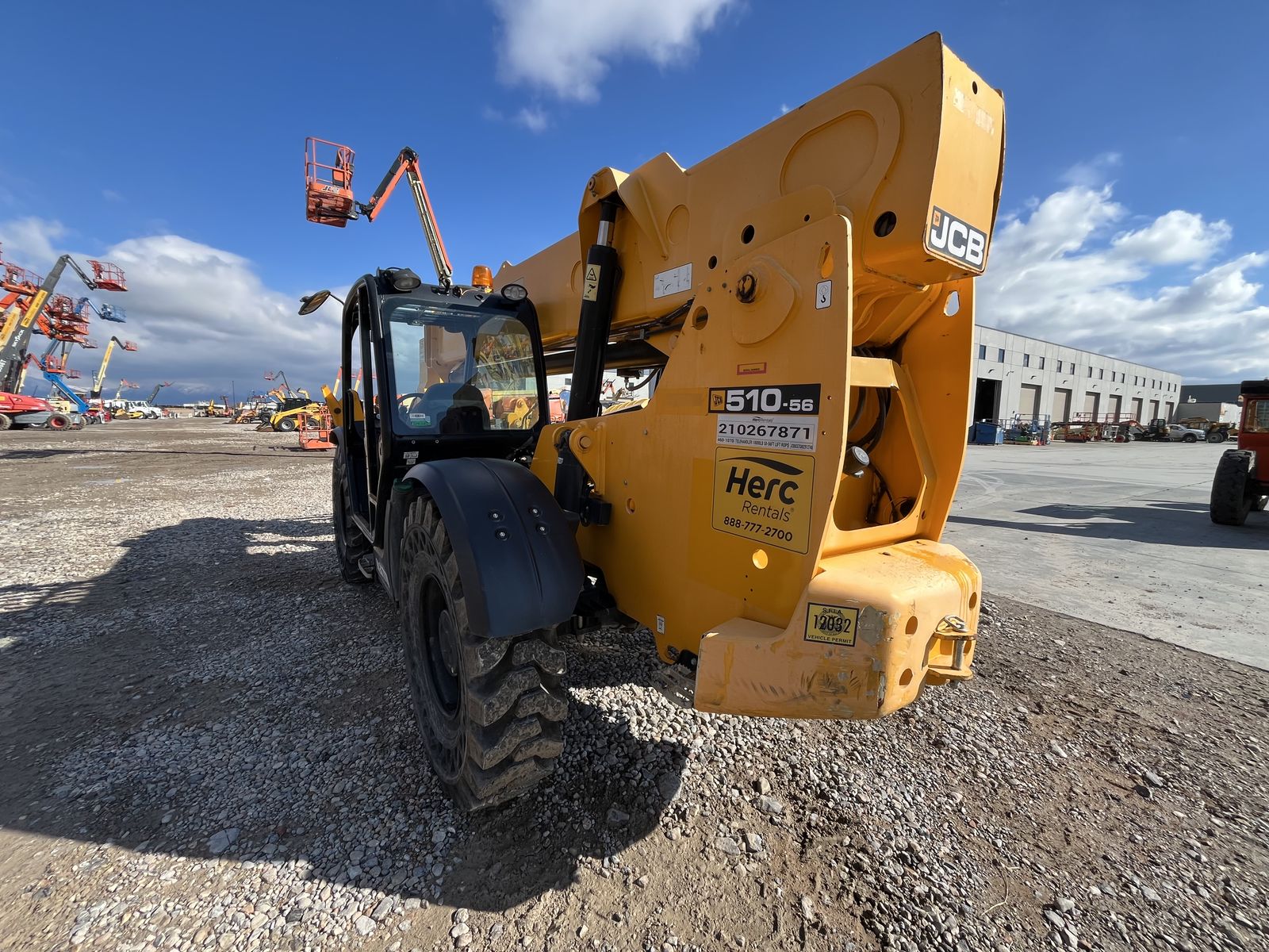 The JCB 510-56 is a 10,000 lb capacity telescopic handler with a 56-foot lift height, designed for high-reach masonry and framing, featuring wide-set stabilizers and a 42-foot forward reach. It is powered by a 74-109 hp JCB EcoMax engine and features, including 3-mode steering, and a high-boom design for maximum visibility.