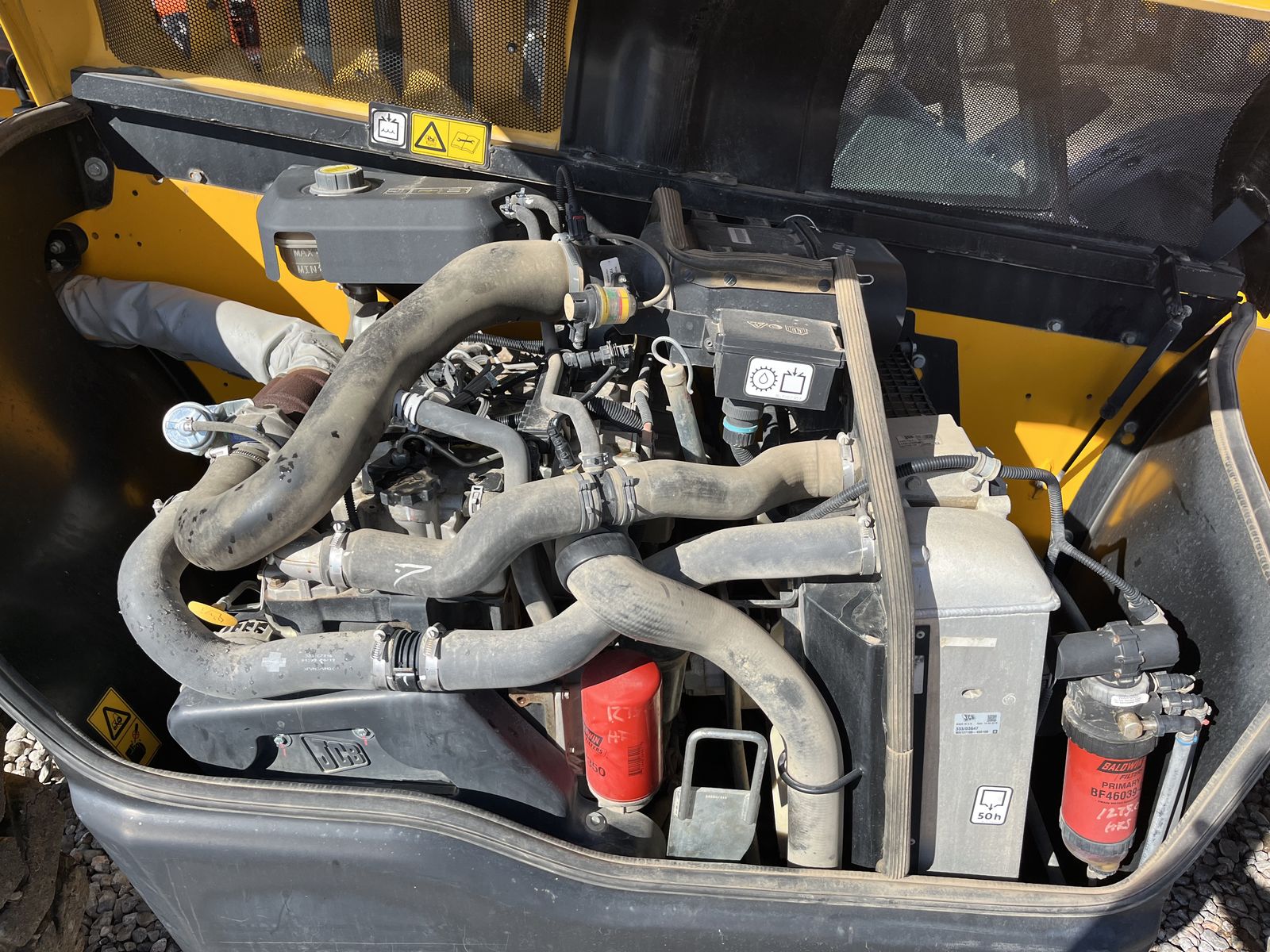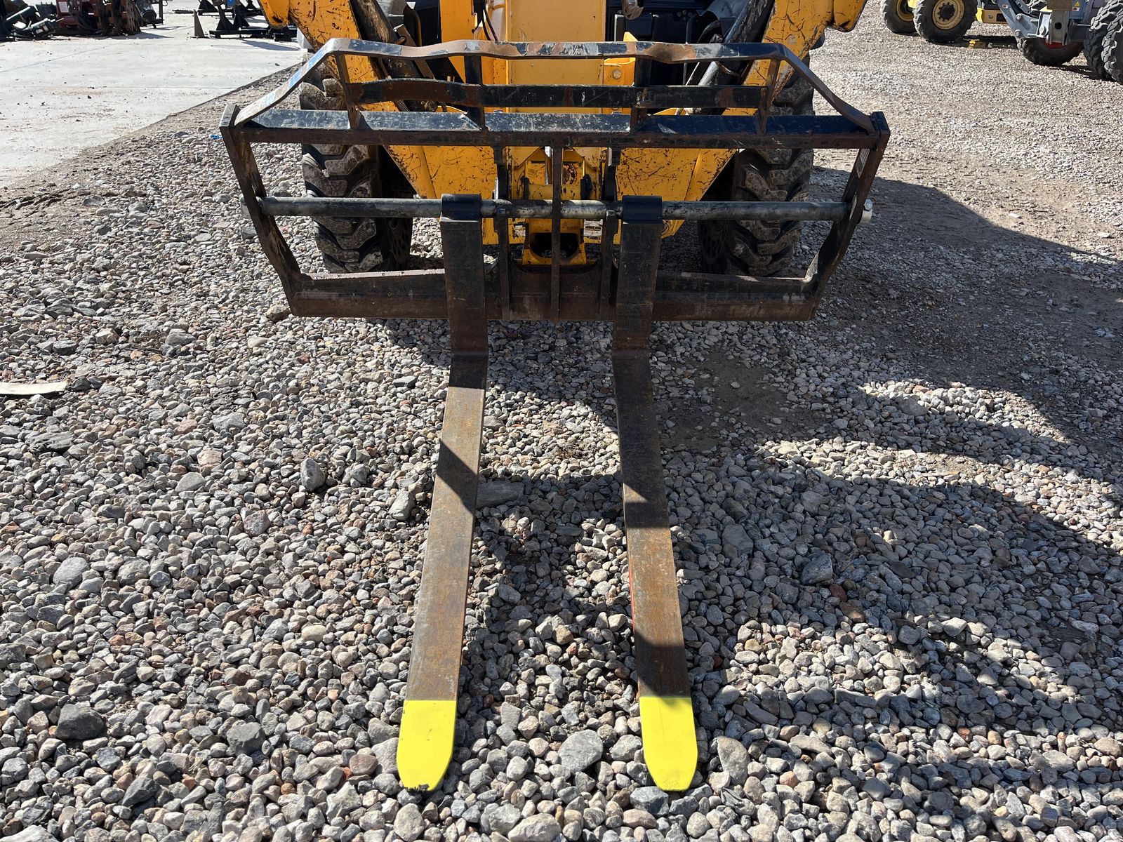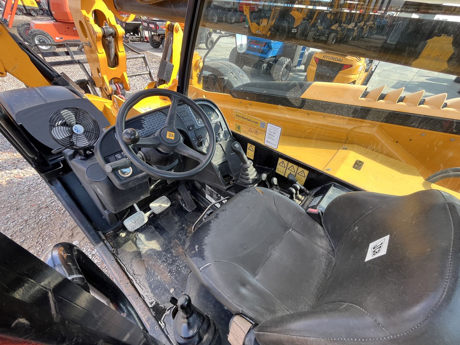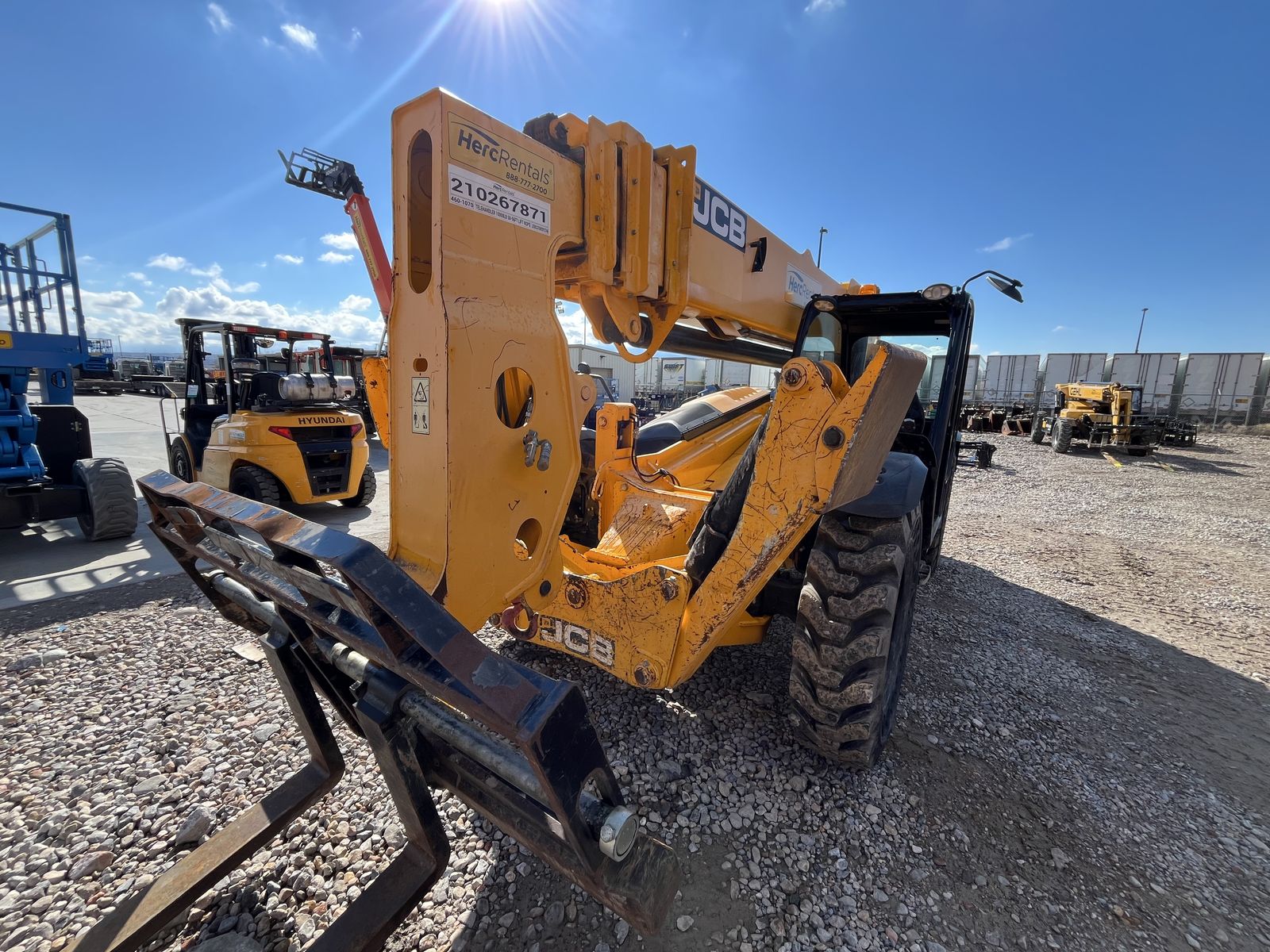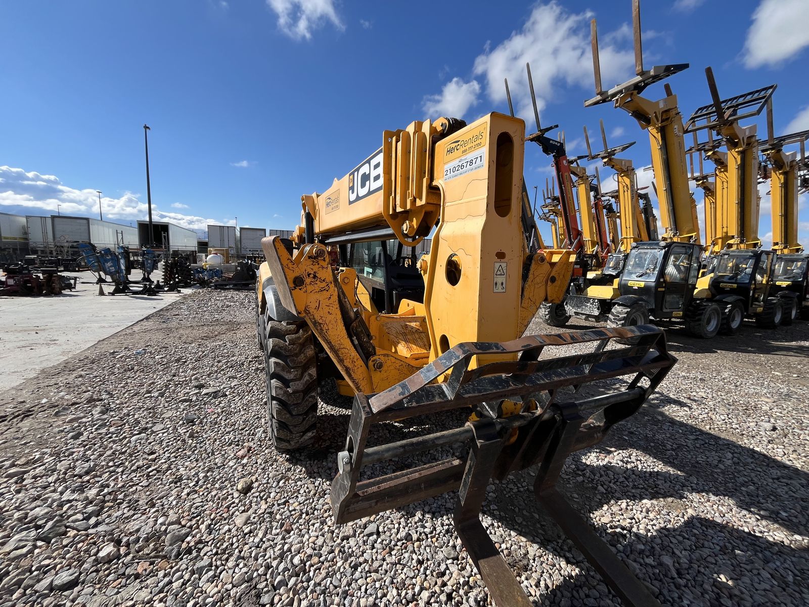 The JCB 510-56 is a 10,000 lb capacity telescopic handler with a 56-foot lift height, designed for high-reach masonry and framing, featuring wide-set stabilizers and a 42-foot forward reach. It is powered by a 74-109 hp JCB EcoMax engine and features, including 3-mode steering, and a high-boom design for maximum visibility.