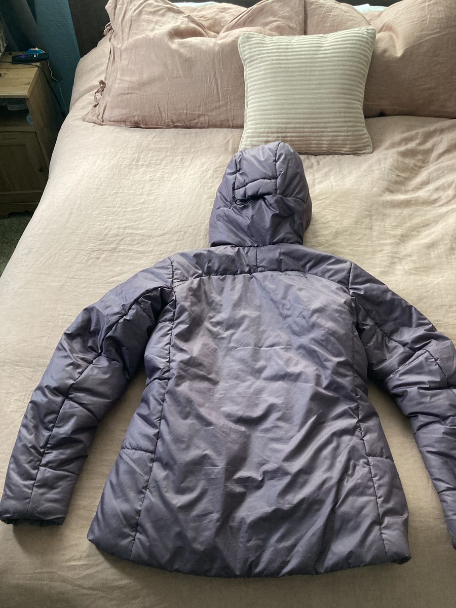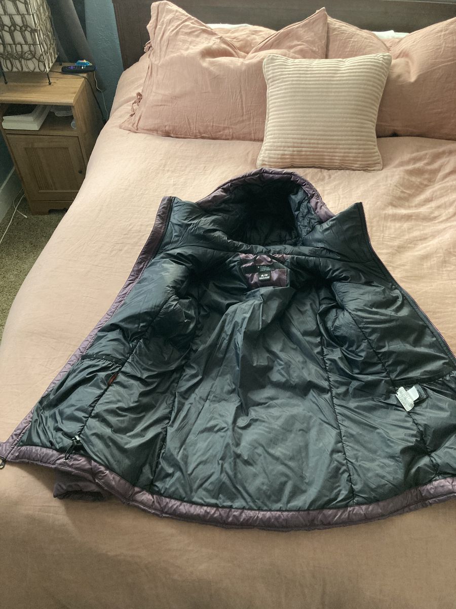 Size small. Used like new. In great condition. Bought last year but now realized it’s too small for me. Use around town or while climbing in the cold. Large sized hood for climbing helmet. Synthetic so it handles moisture well.