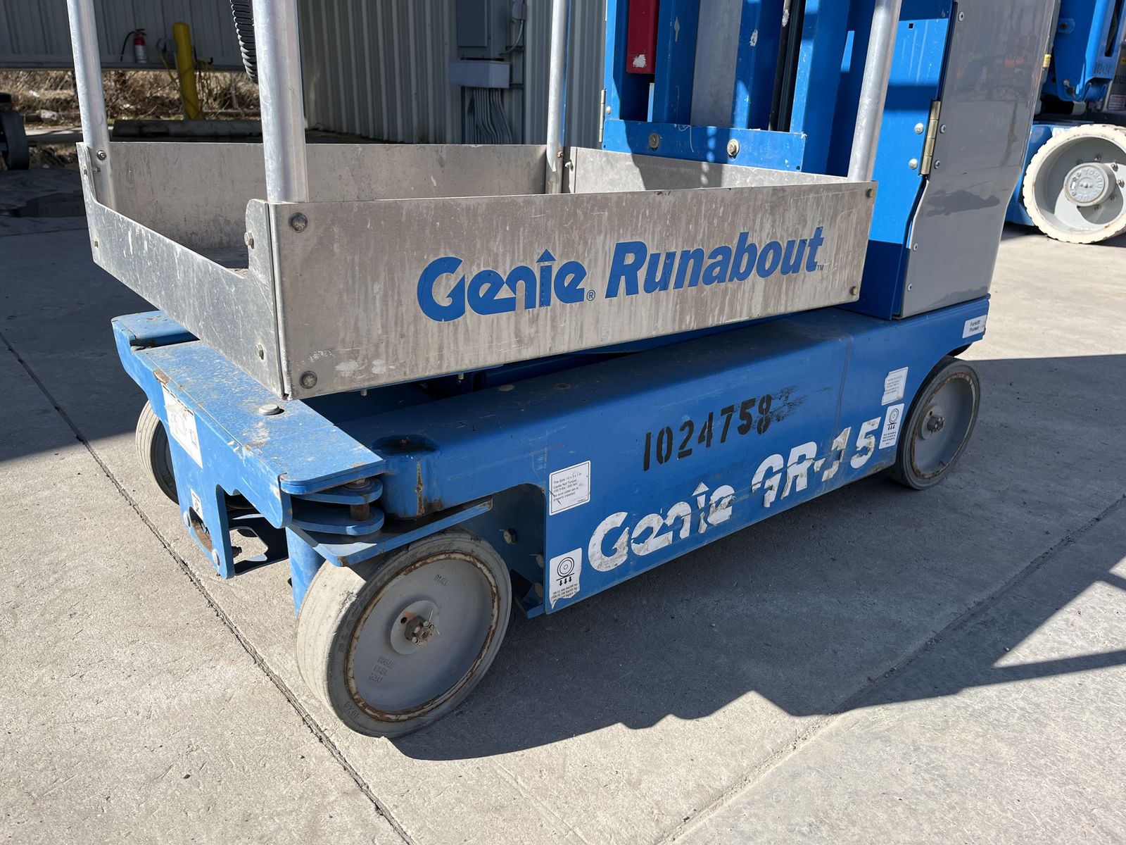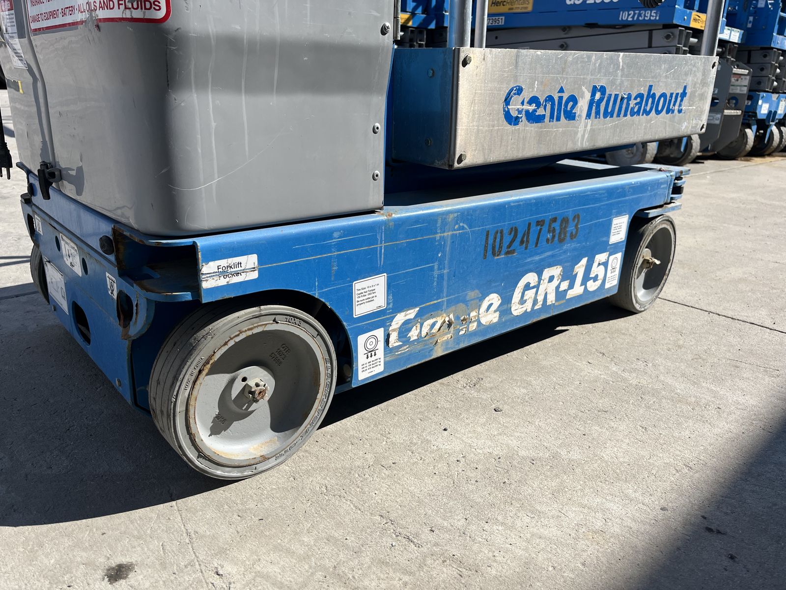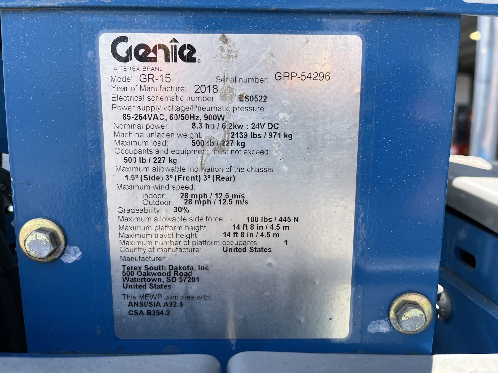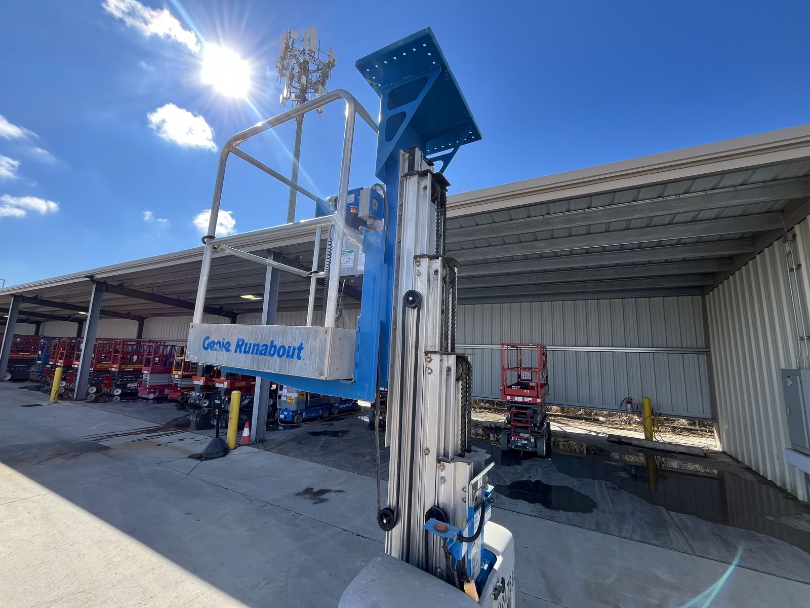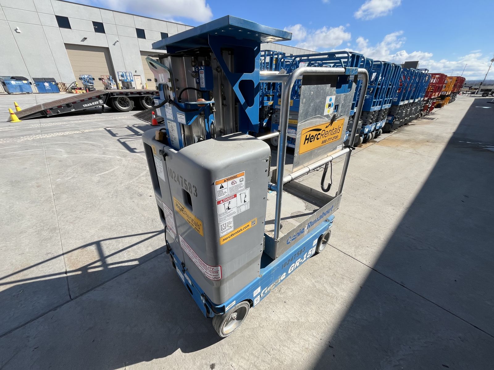 The 2018 Genie Runabout GR-15 is a self-propelled vertical mast lift, approximately weighing 2,178-2,192 pounds, with a maximum working height of 20 ft 8 in and 500 pounds capacity, designed for indoor maintenance and warehousing tasks in tight spaces. It is known for its compact footprint, allowing it to fit through standard doorways and most passenger elevators while remaining drivable at its full platform height.