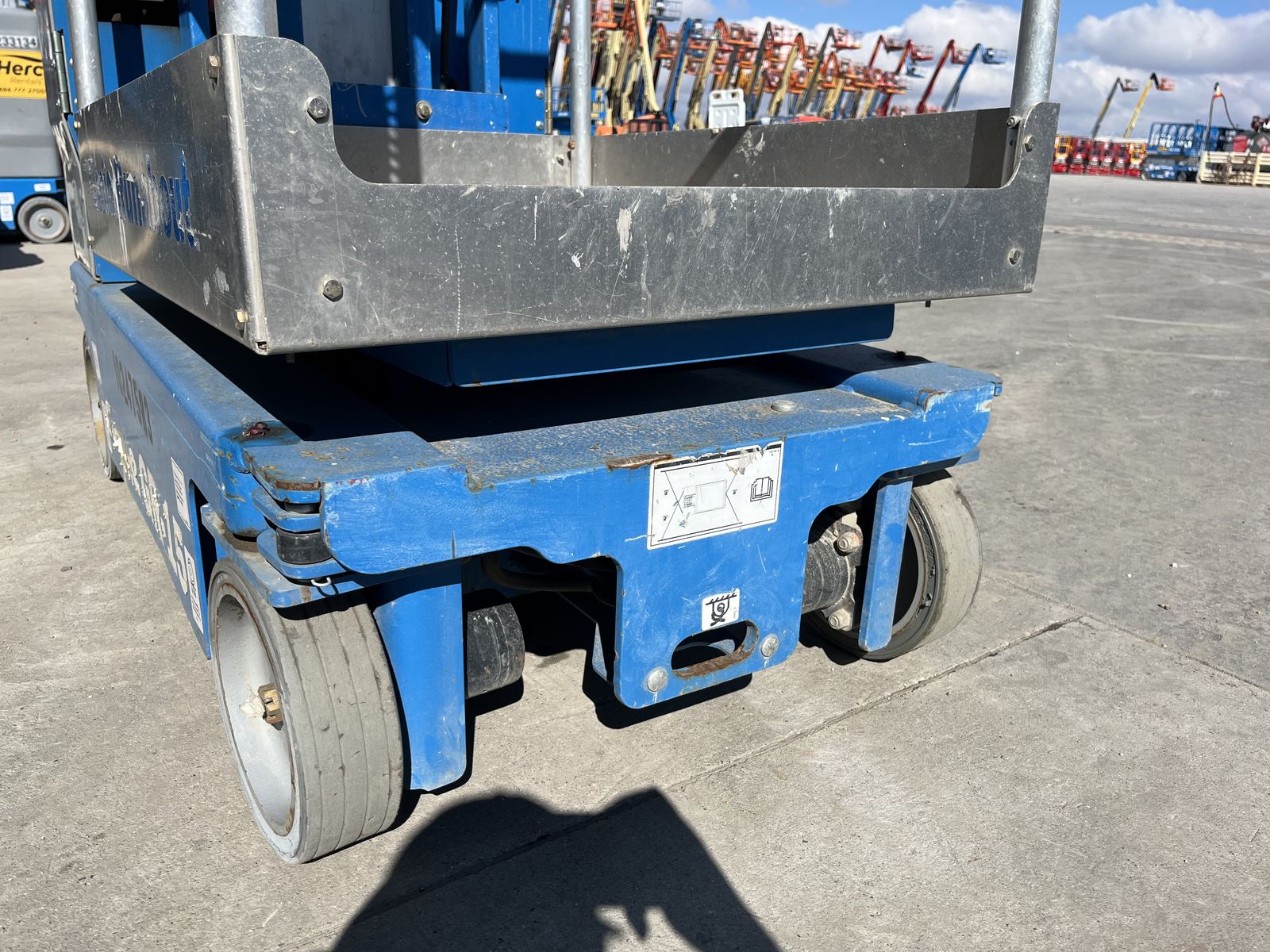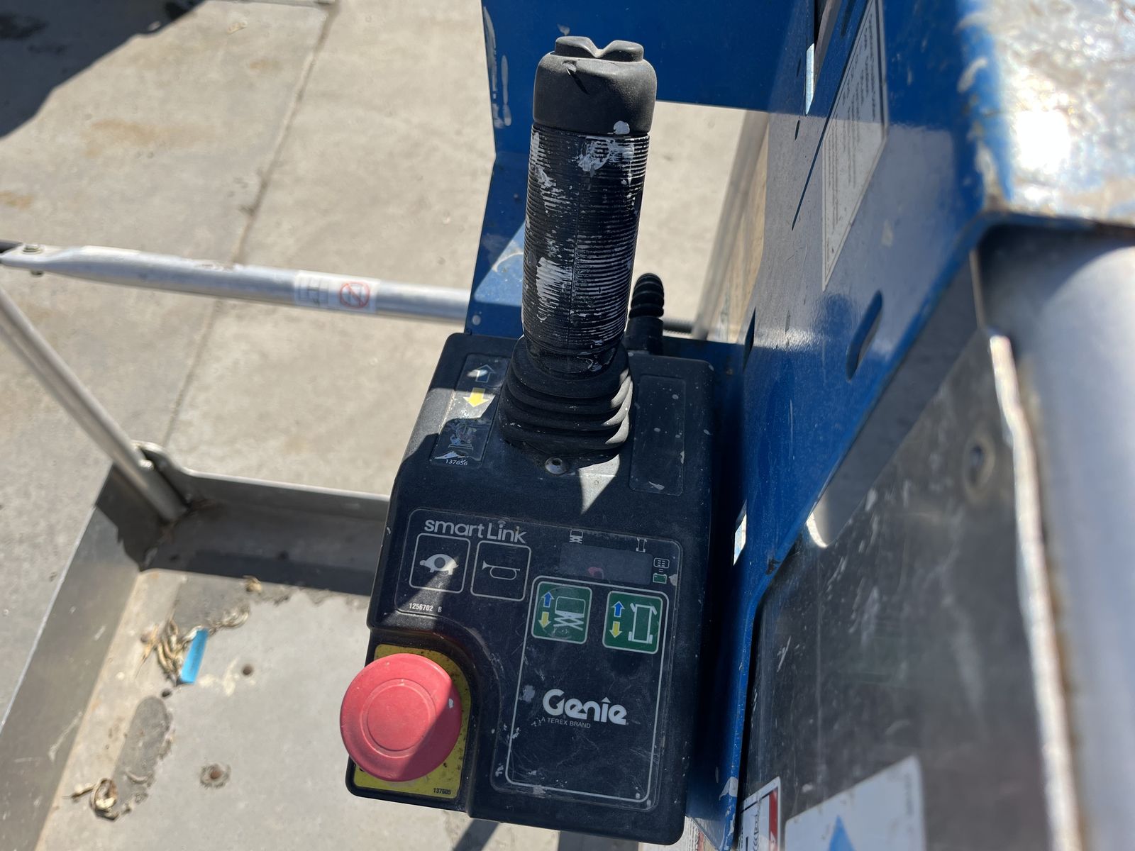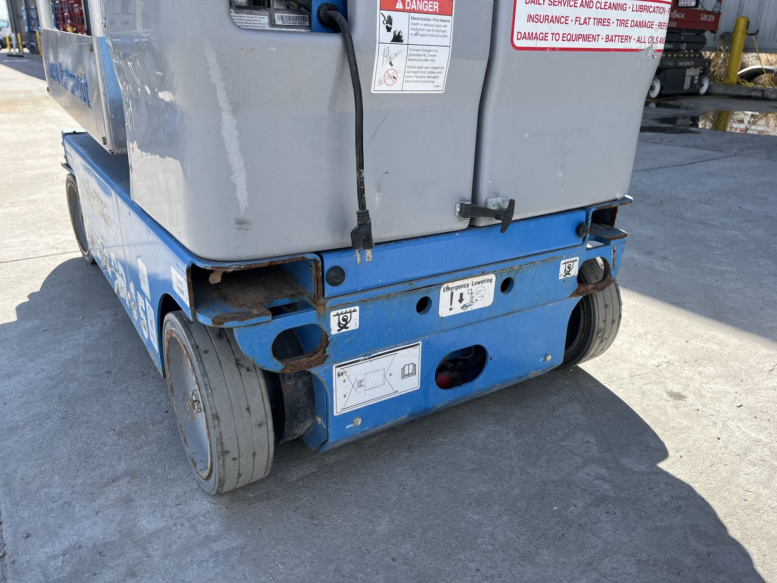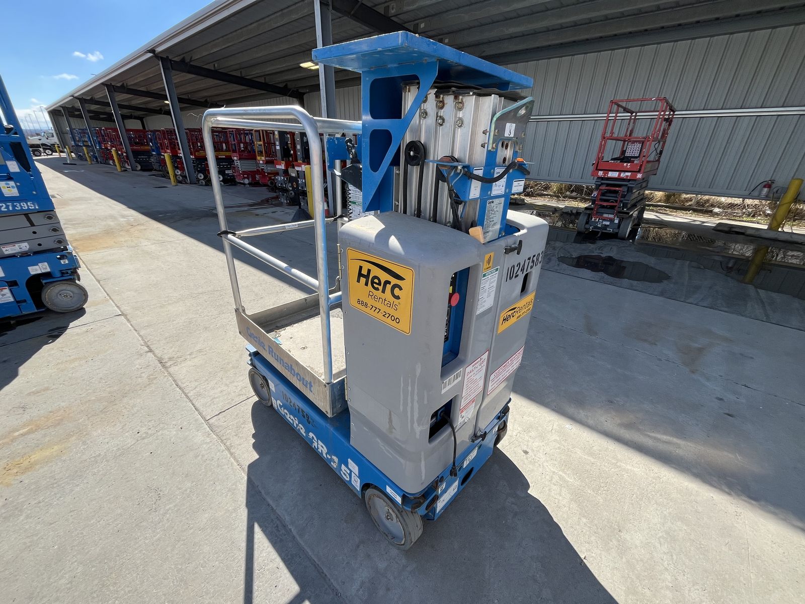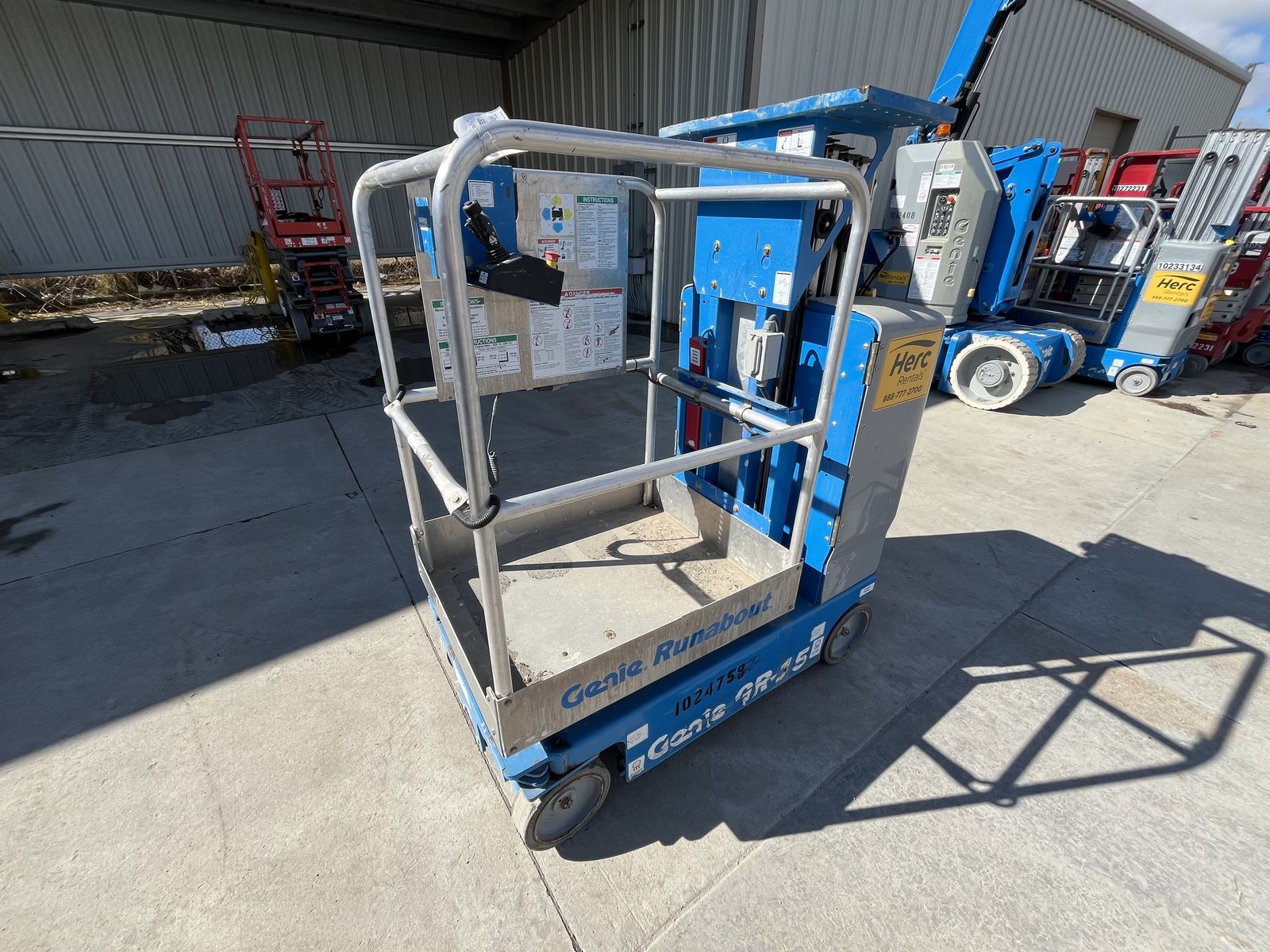 The 2018 Genie Runabout GR-15 is a self-propelled vertical mast lift, approximately weighing 2,178-2,192 pounds, with a maximum working height of 20 ft 8 in and 500 pounds capacity, designed for indoor maintenance and warehousing tasks in tight spaces. It is known for its compact footprint, allowing it to fit through standard doorways and most passenger elevators while remaining drivable at its full platform height.